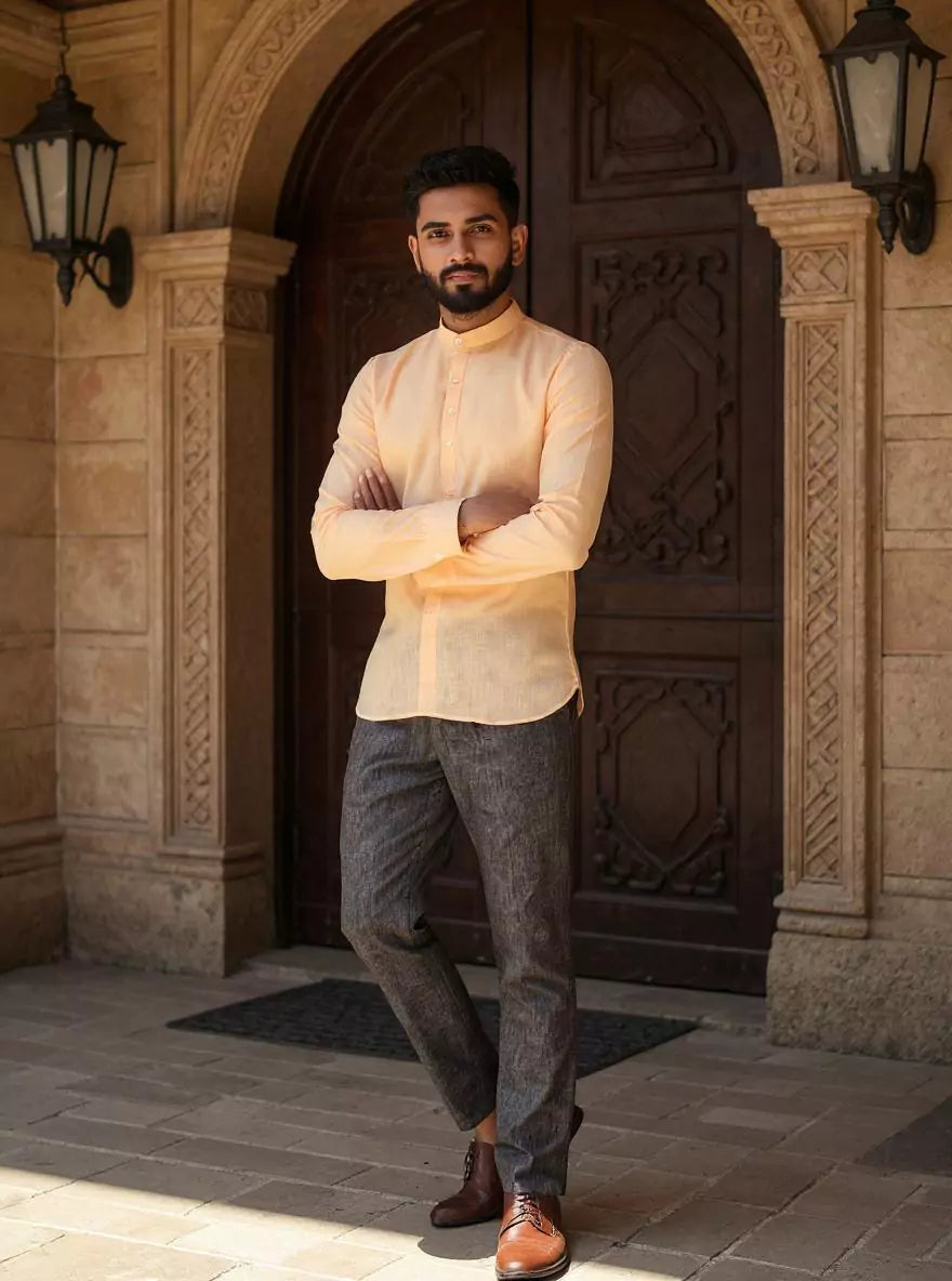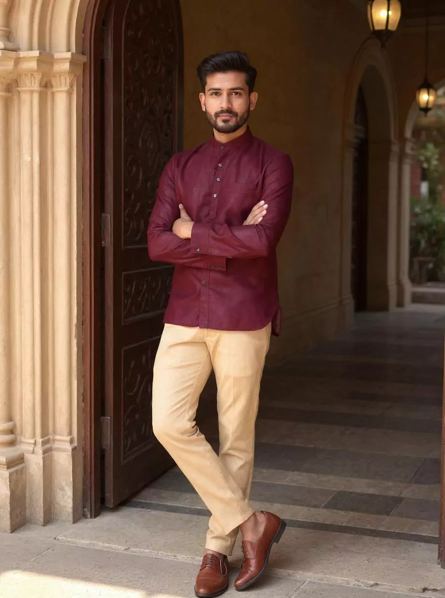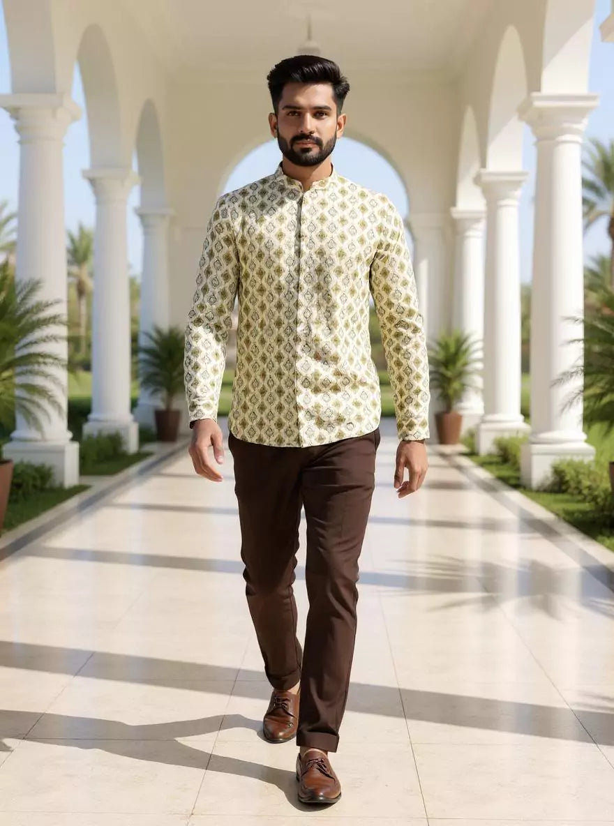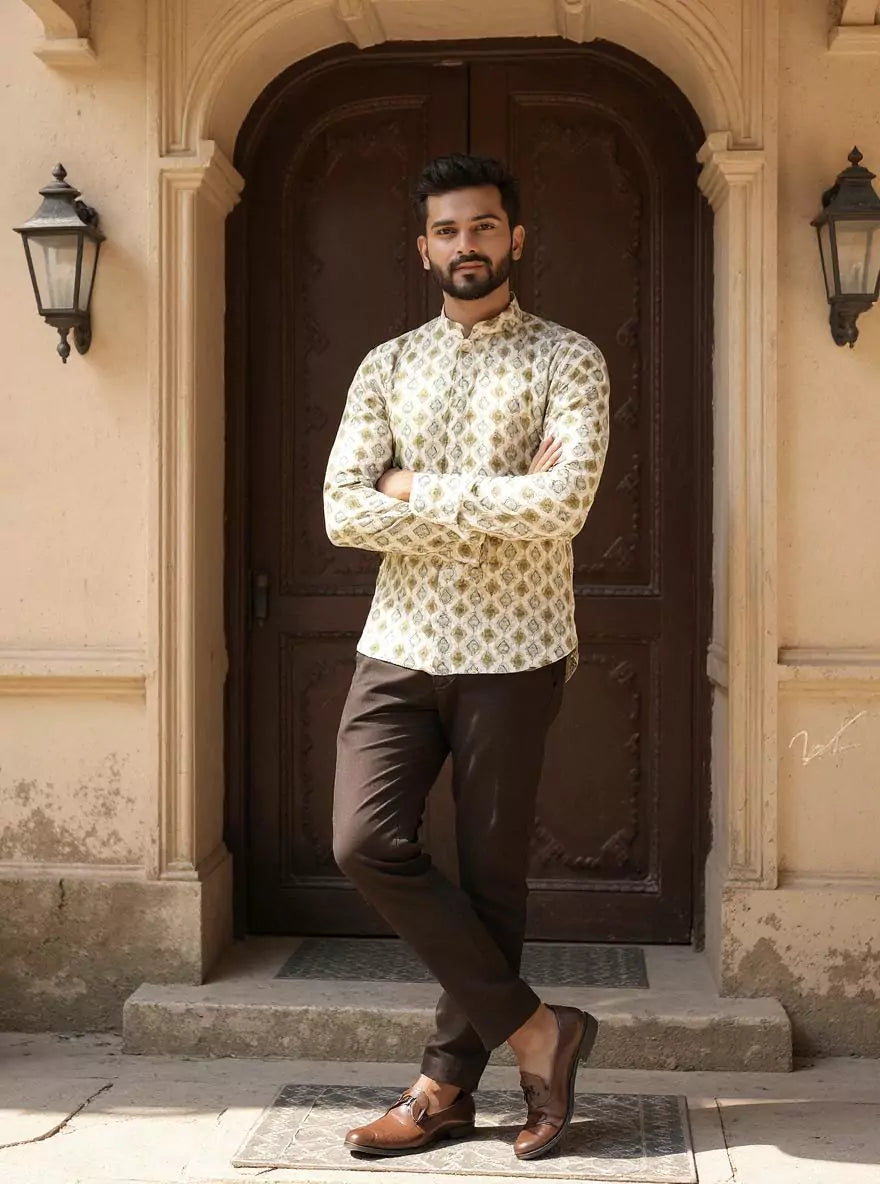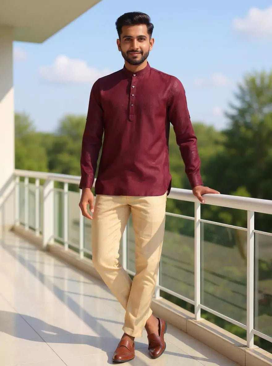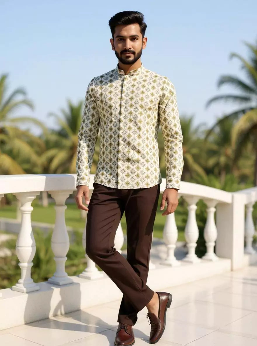 Pista Trellis Patterned Glaxo Cotton Short Kurta for Men