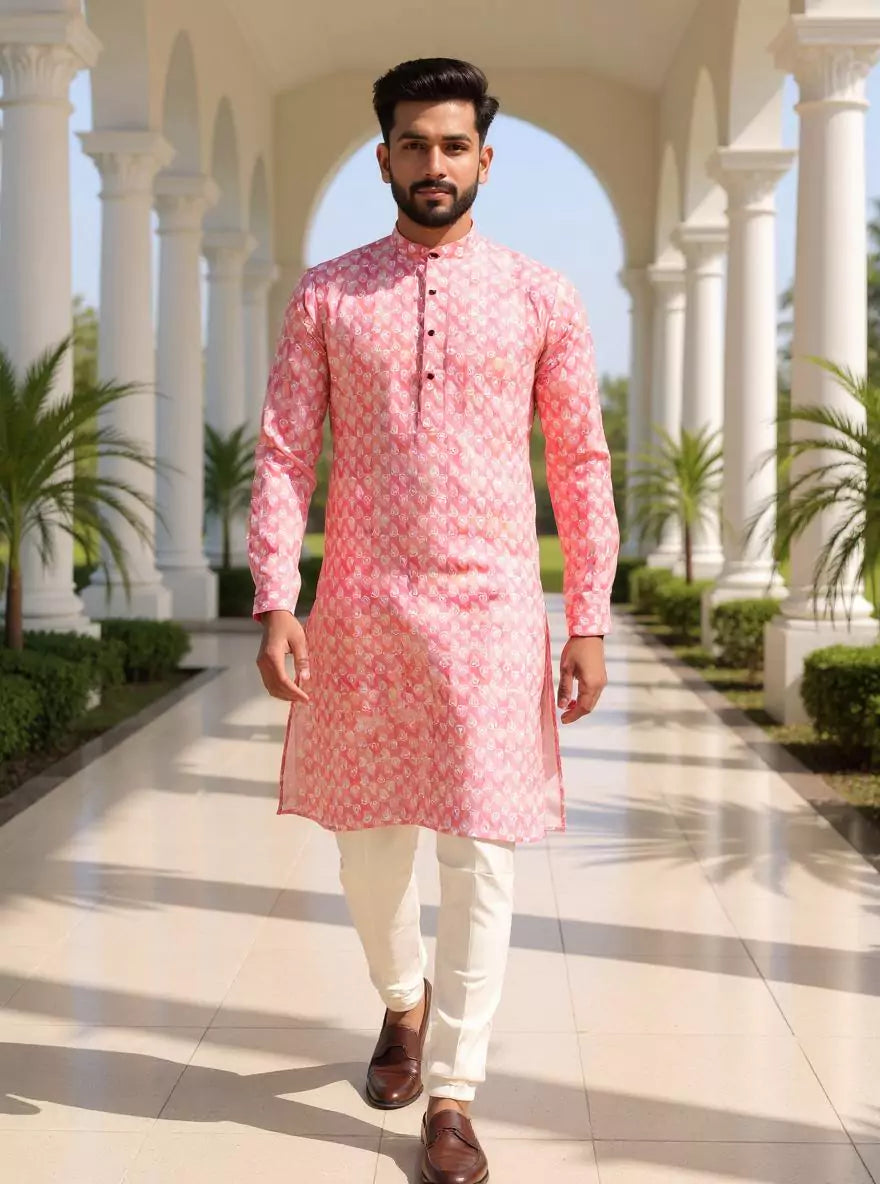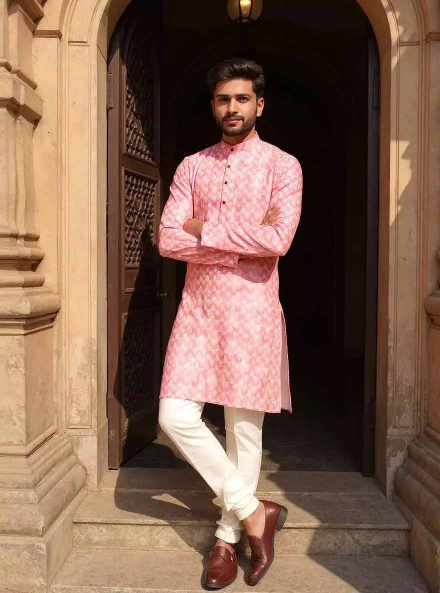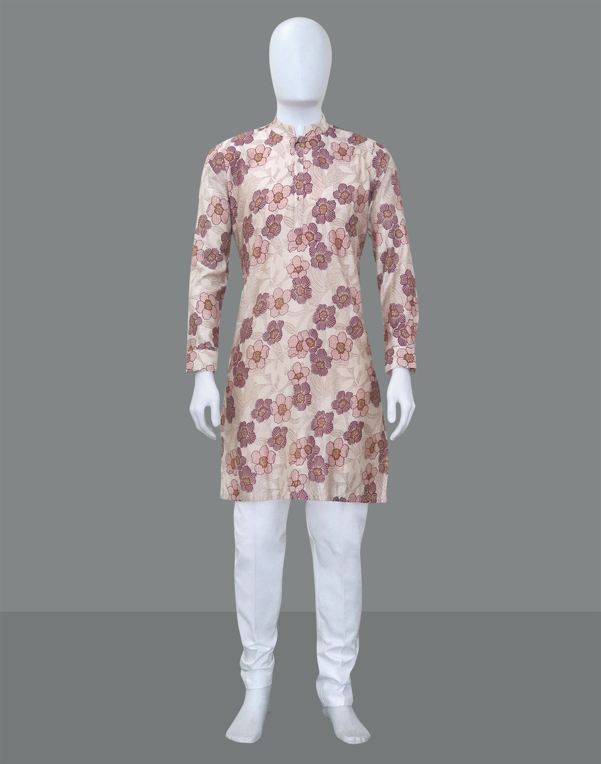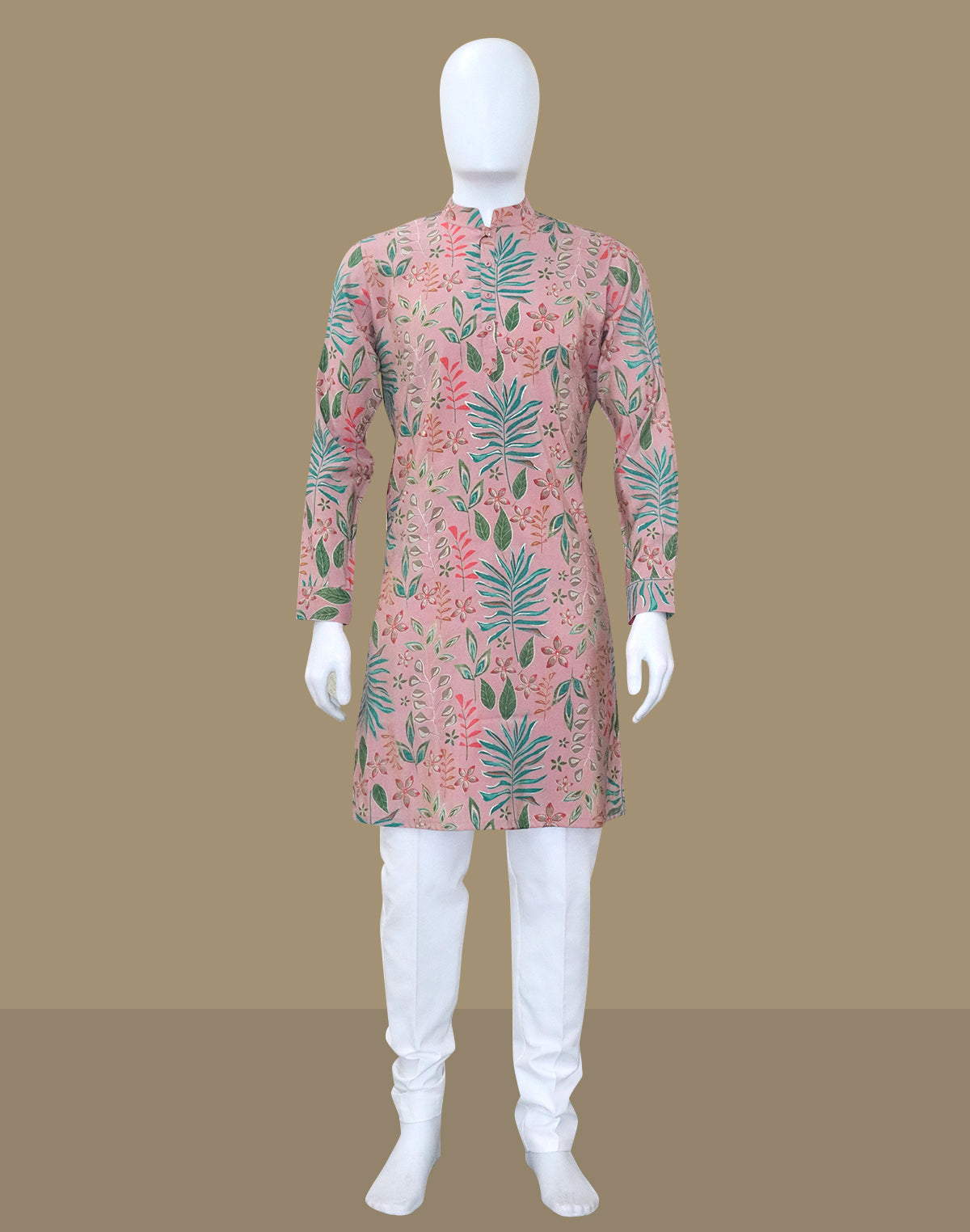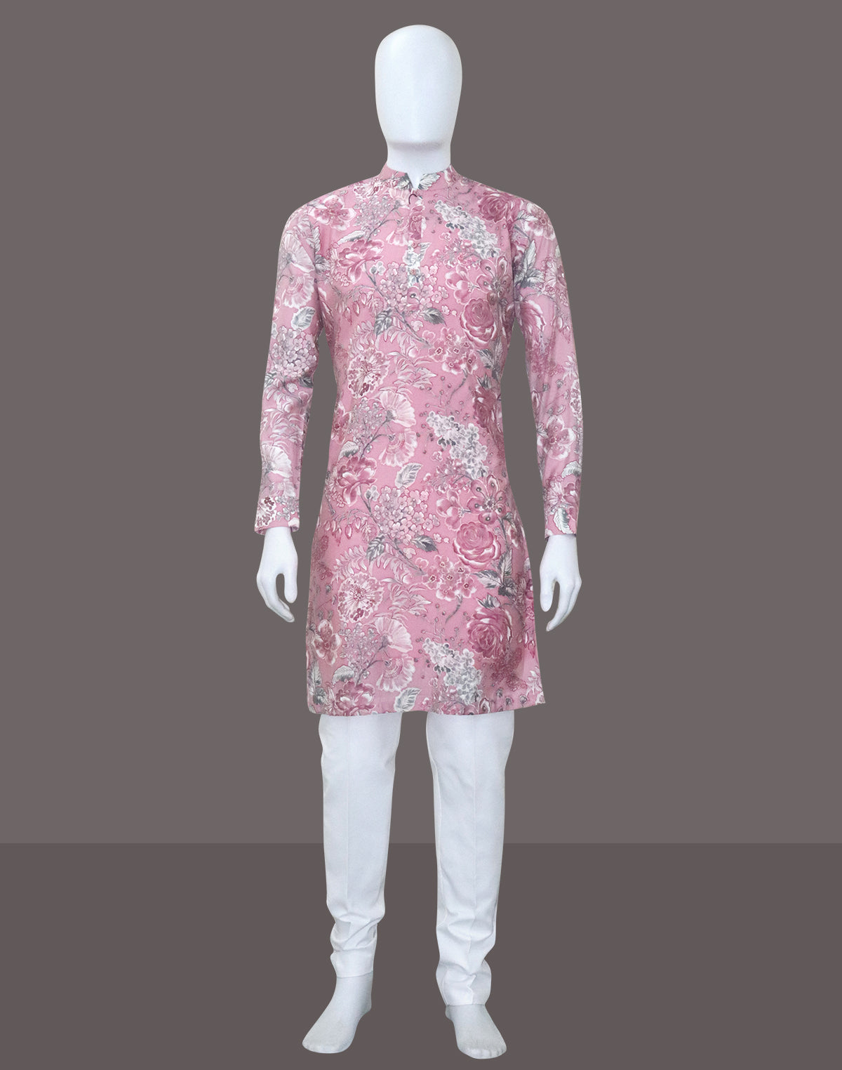 Light Pink Mica Print Floral Design Cotton Silk Kurta
