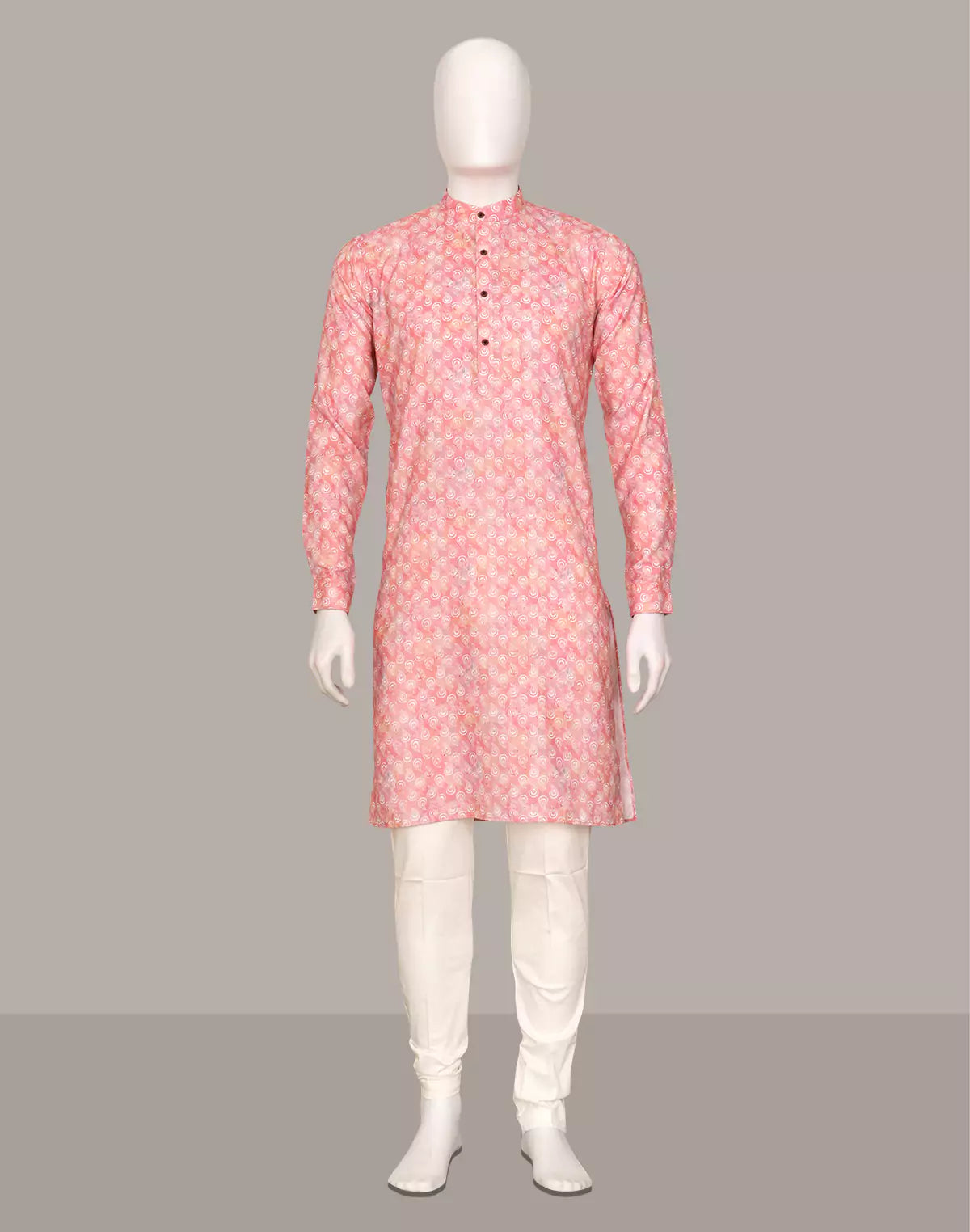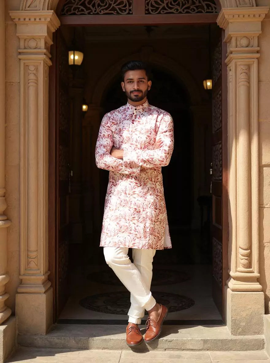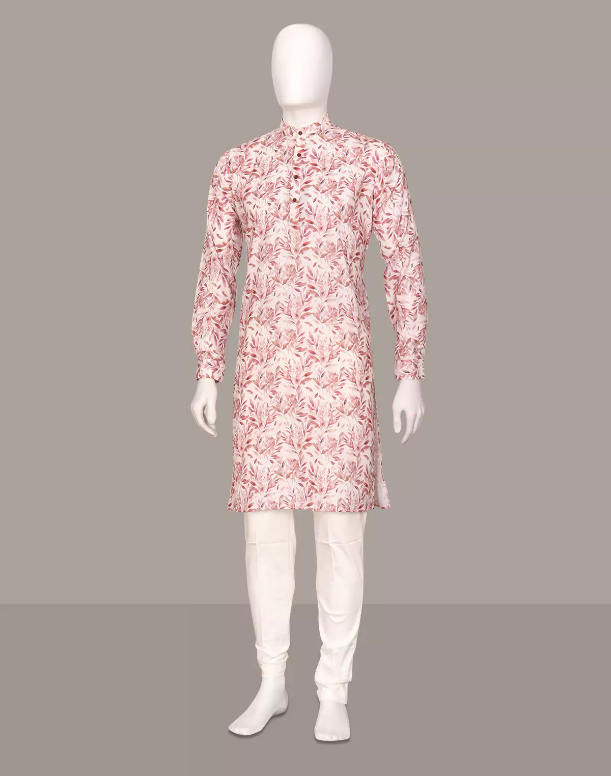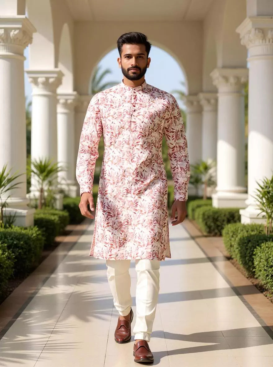 Light Pink Mica Print Floral Design Cotton Silk Kurta