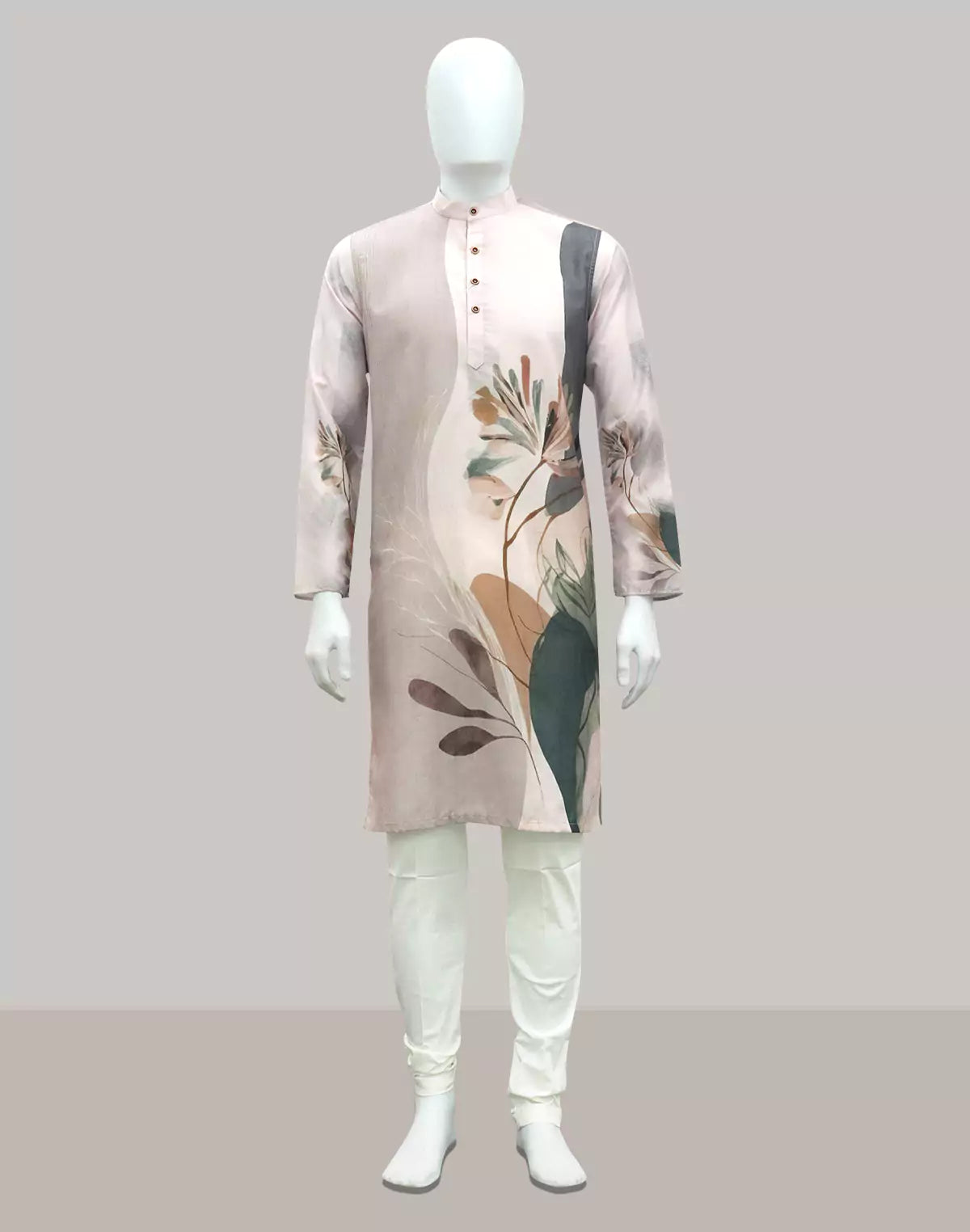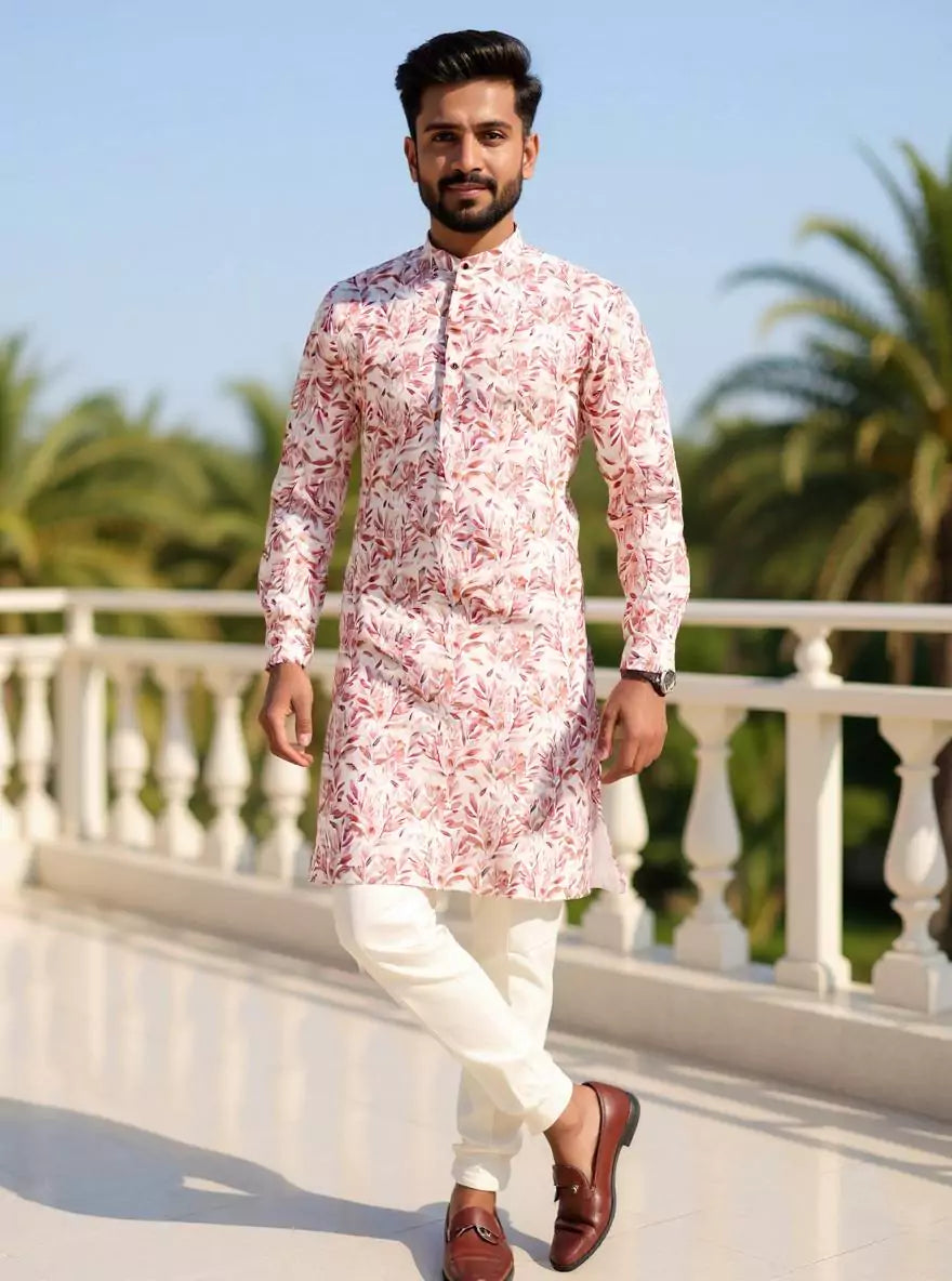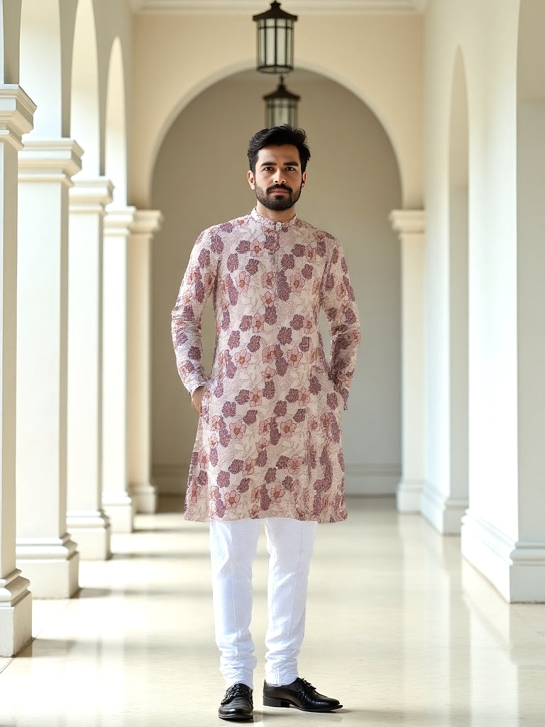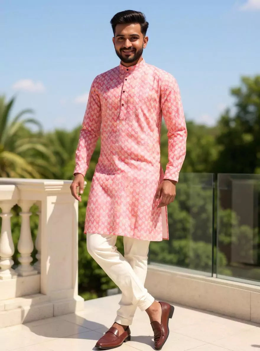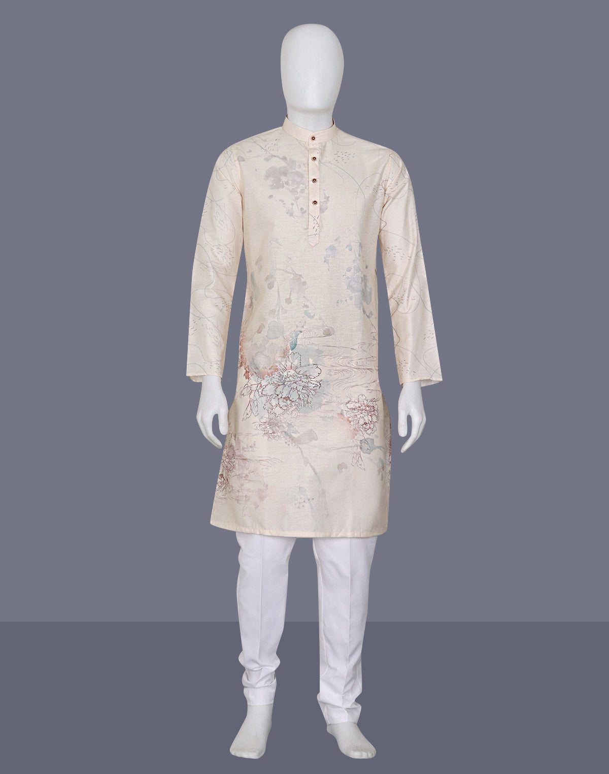 Light Pink Mica Print Floral Design Cotton Silk Kurta