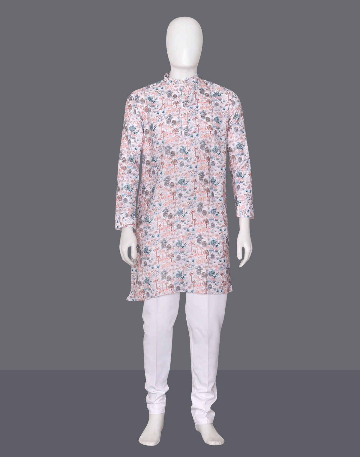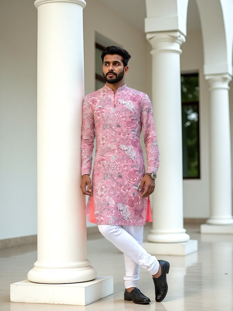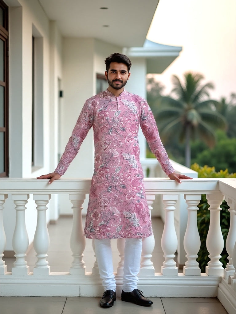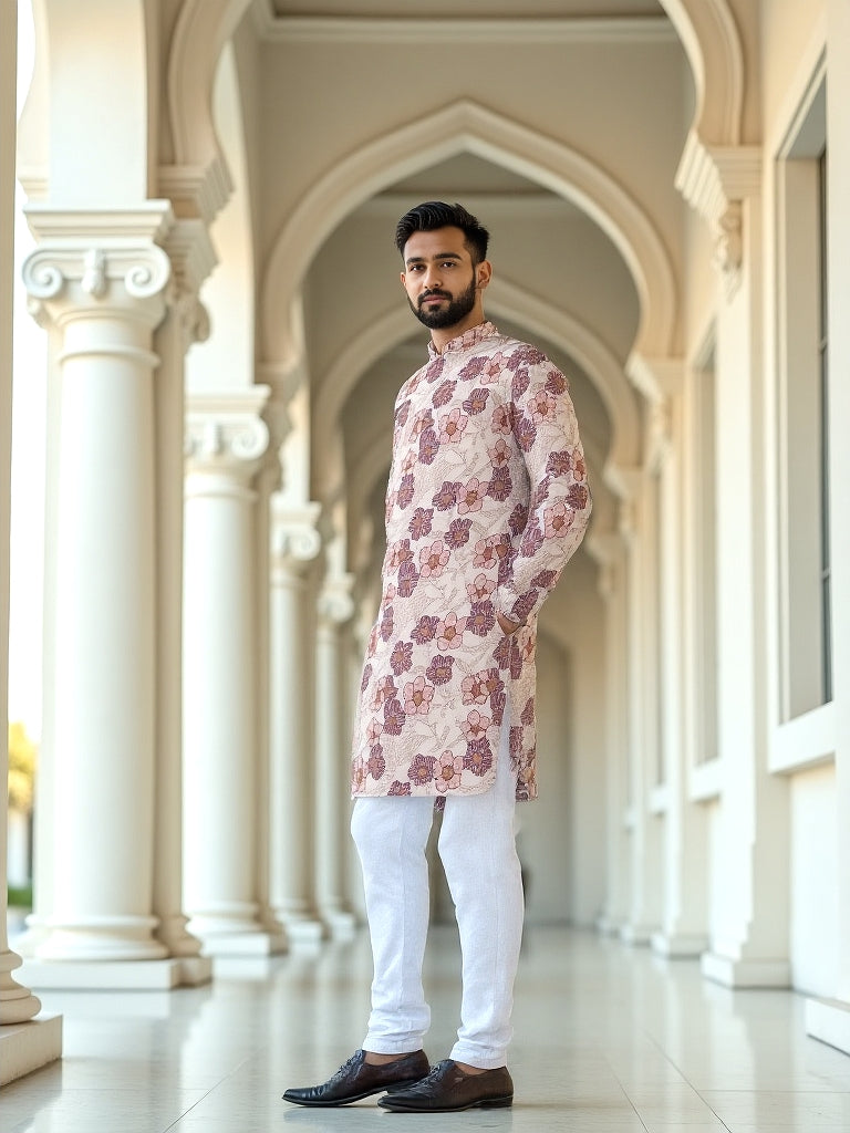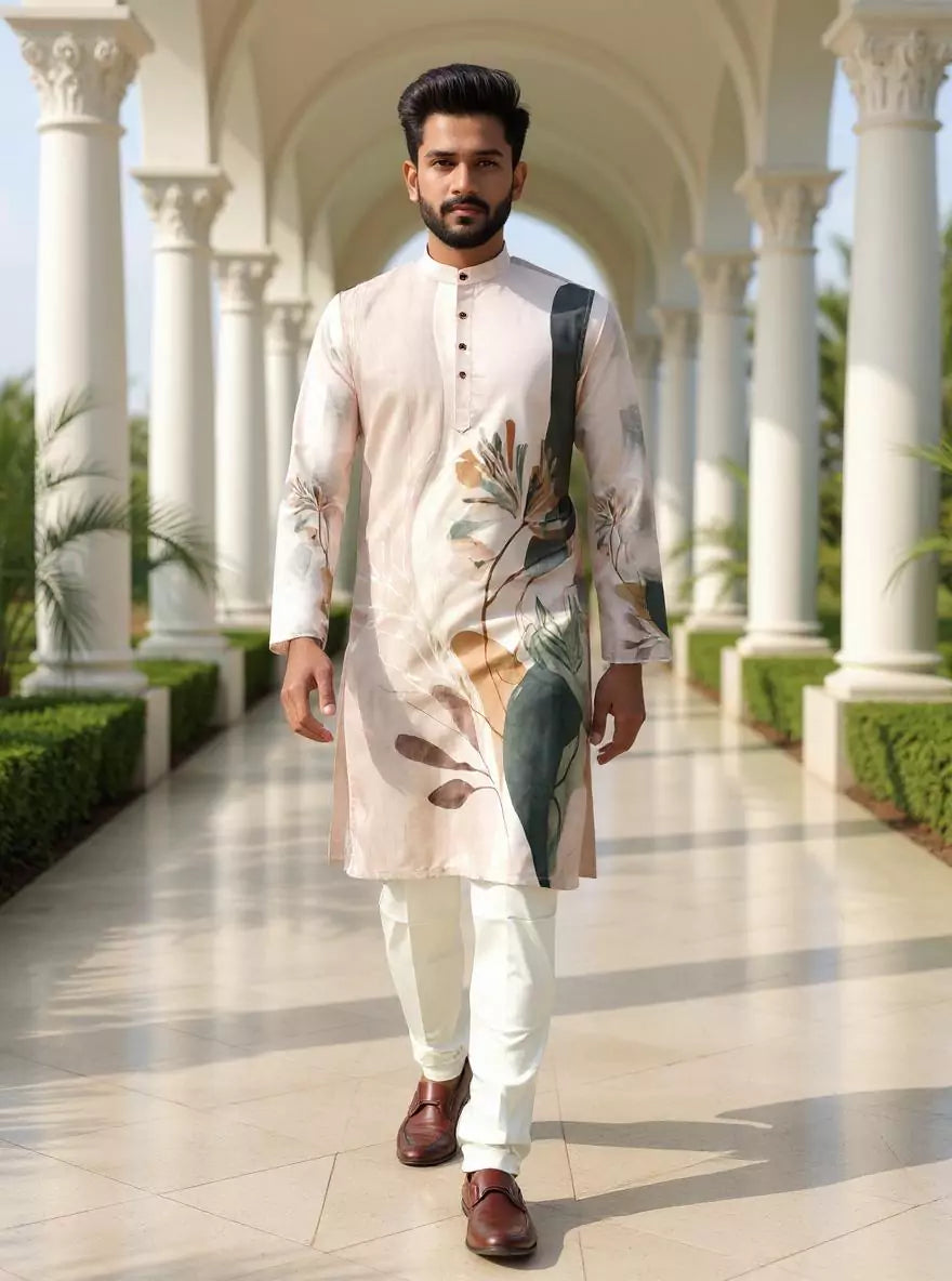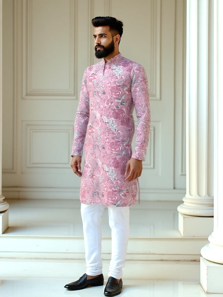 Light Pink Mica Print Floral Design Cotton Silk Kurta