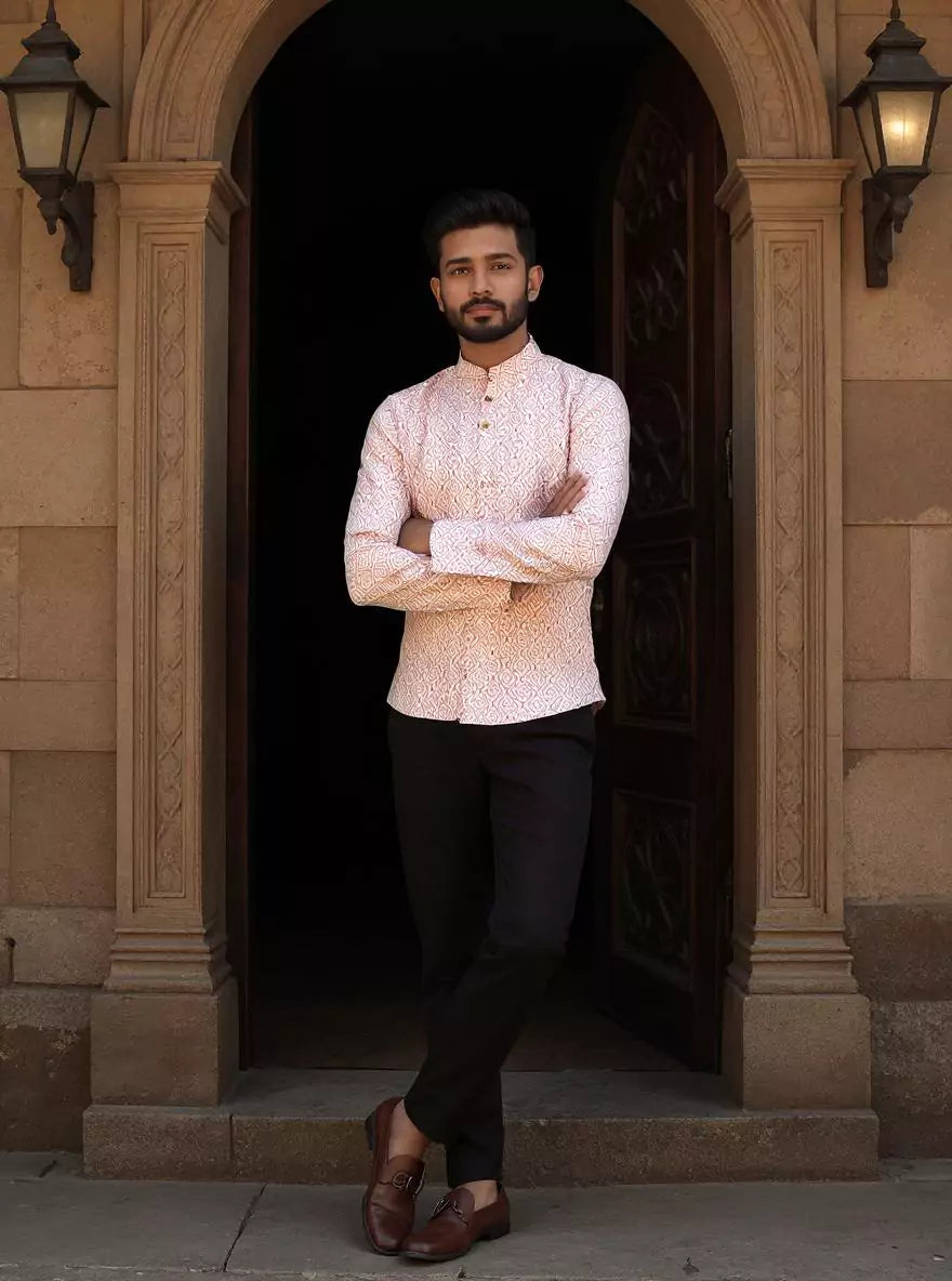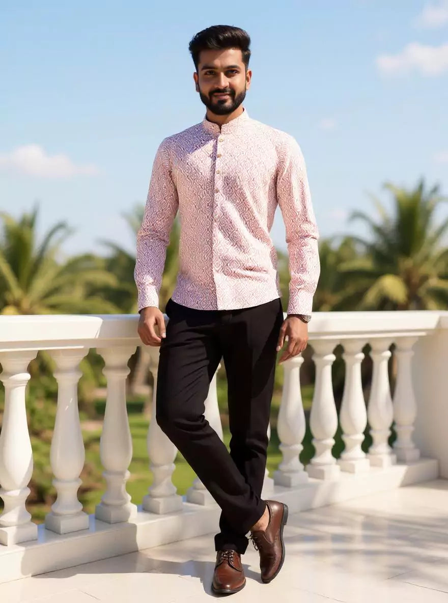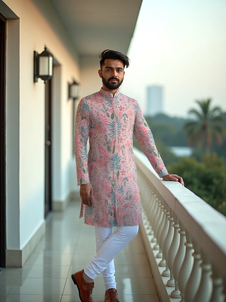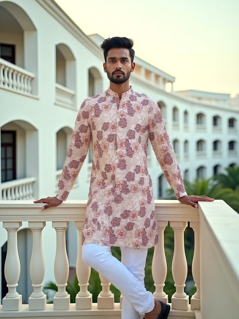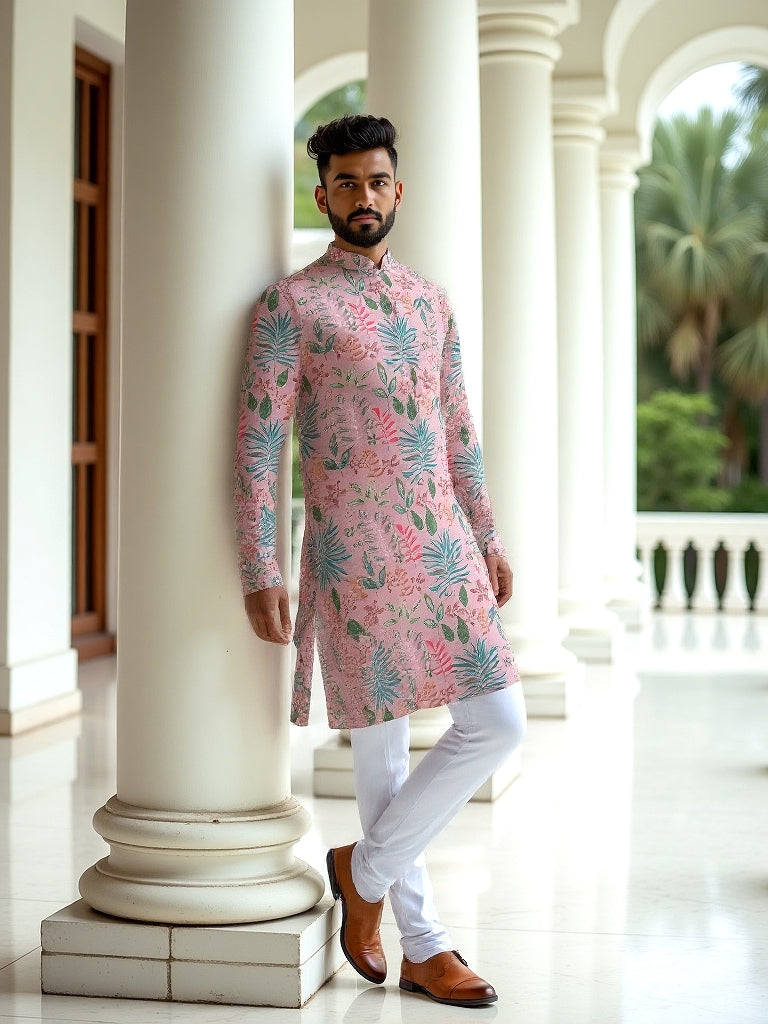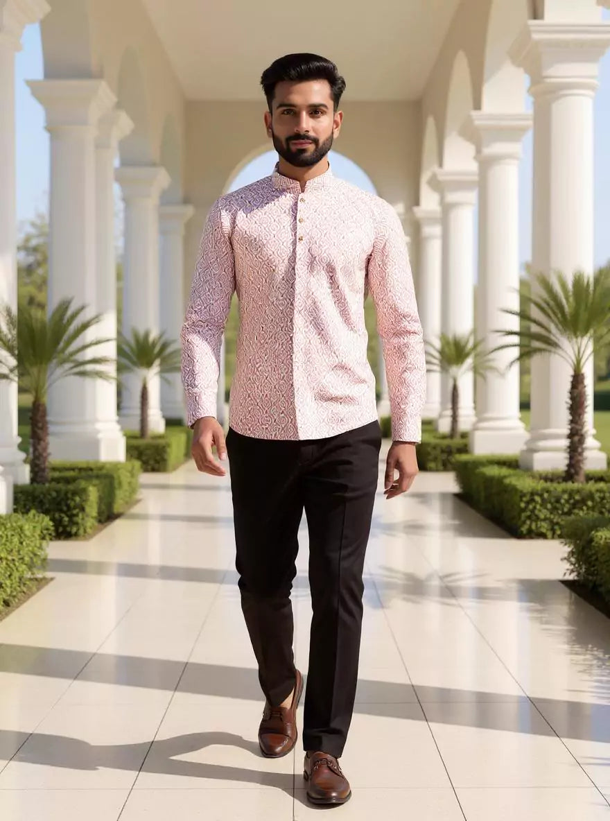 Light Pink Mica Print Floral Design Cotton Silk Kurta