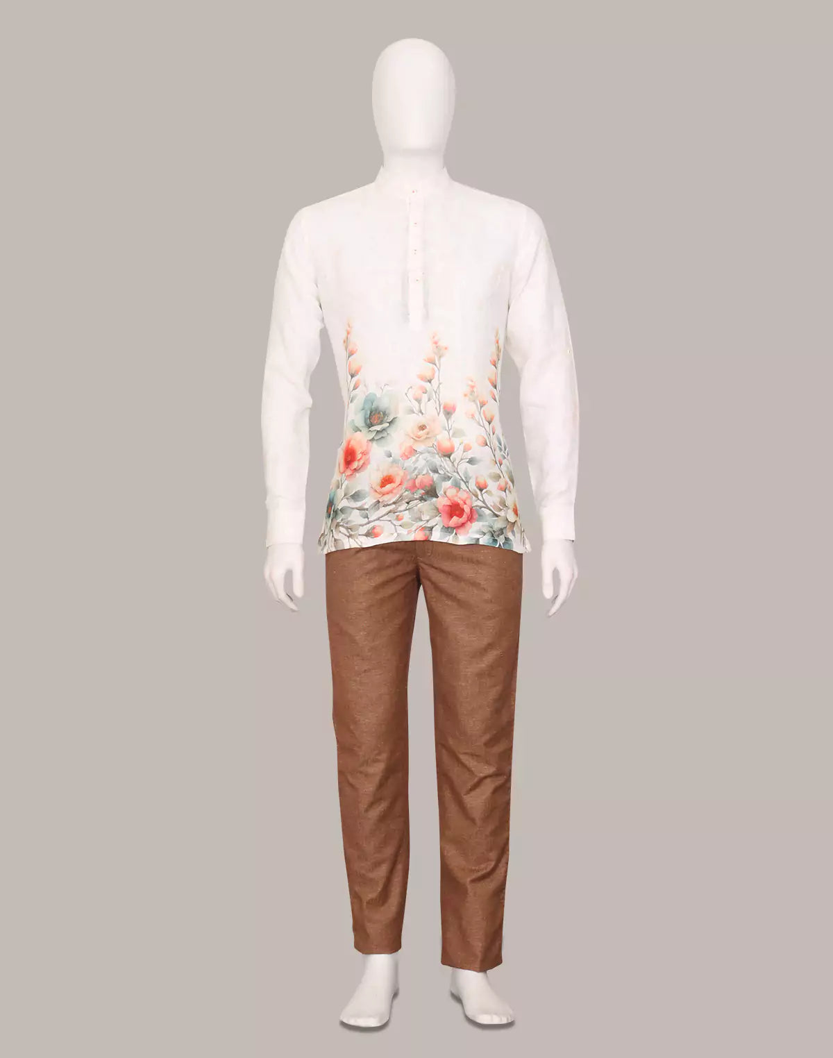 Dark Fawn Floral with Birds Printed Cotton Kurta
