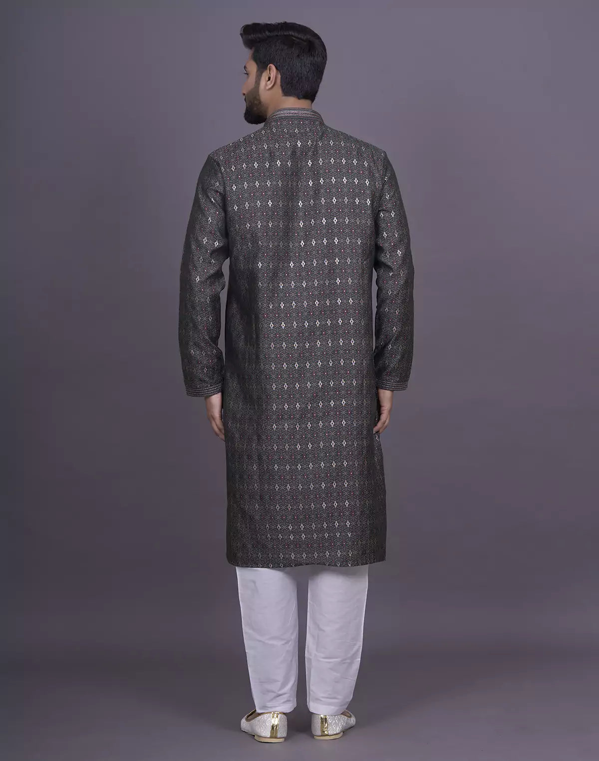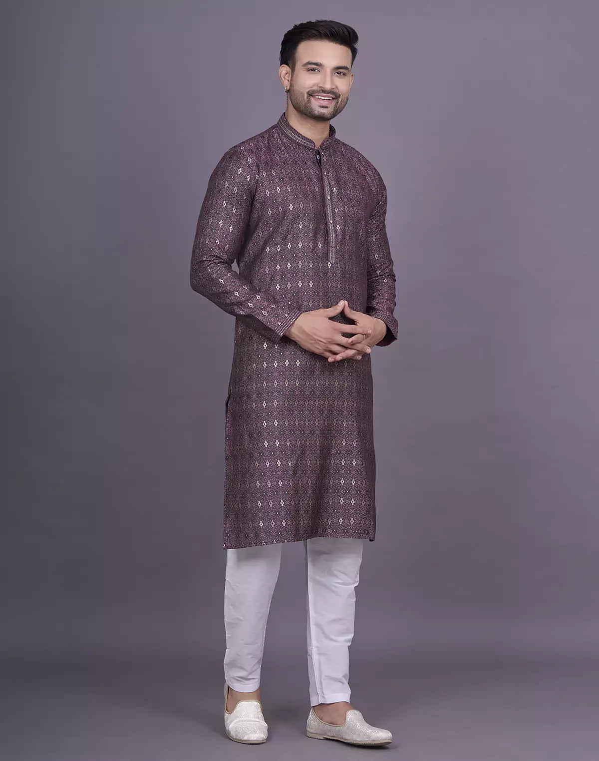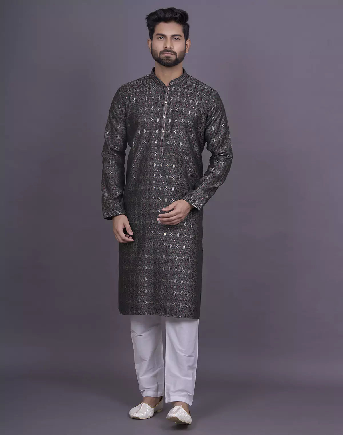 Looking for the perfect outfit for a festive gathering or family celebration? Look no further than our Soft Silk Kurta Set. The self design pattern, delicate thread work, and dazzling stones add a touch of elegance and charm to your look. Pair it with the included white pyjama for a perfectly coordinated ensemble.
