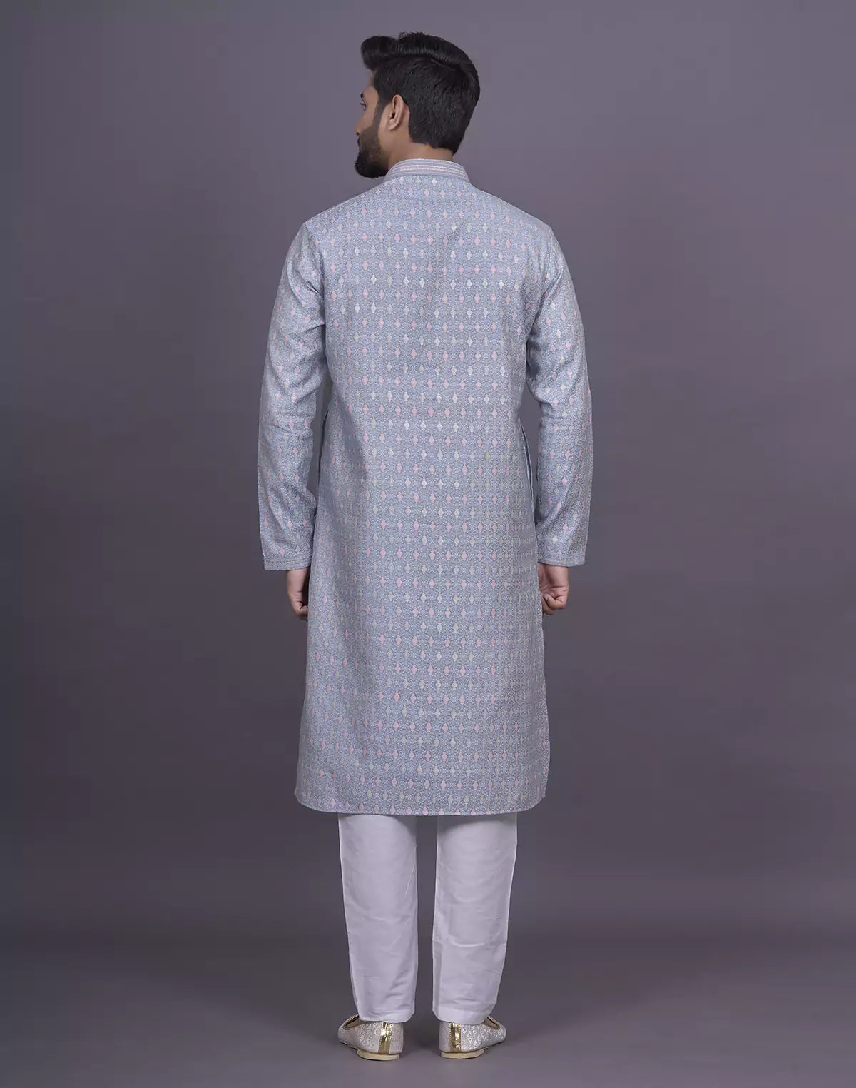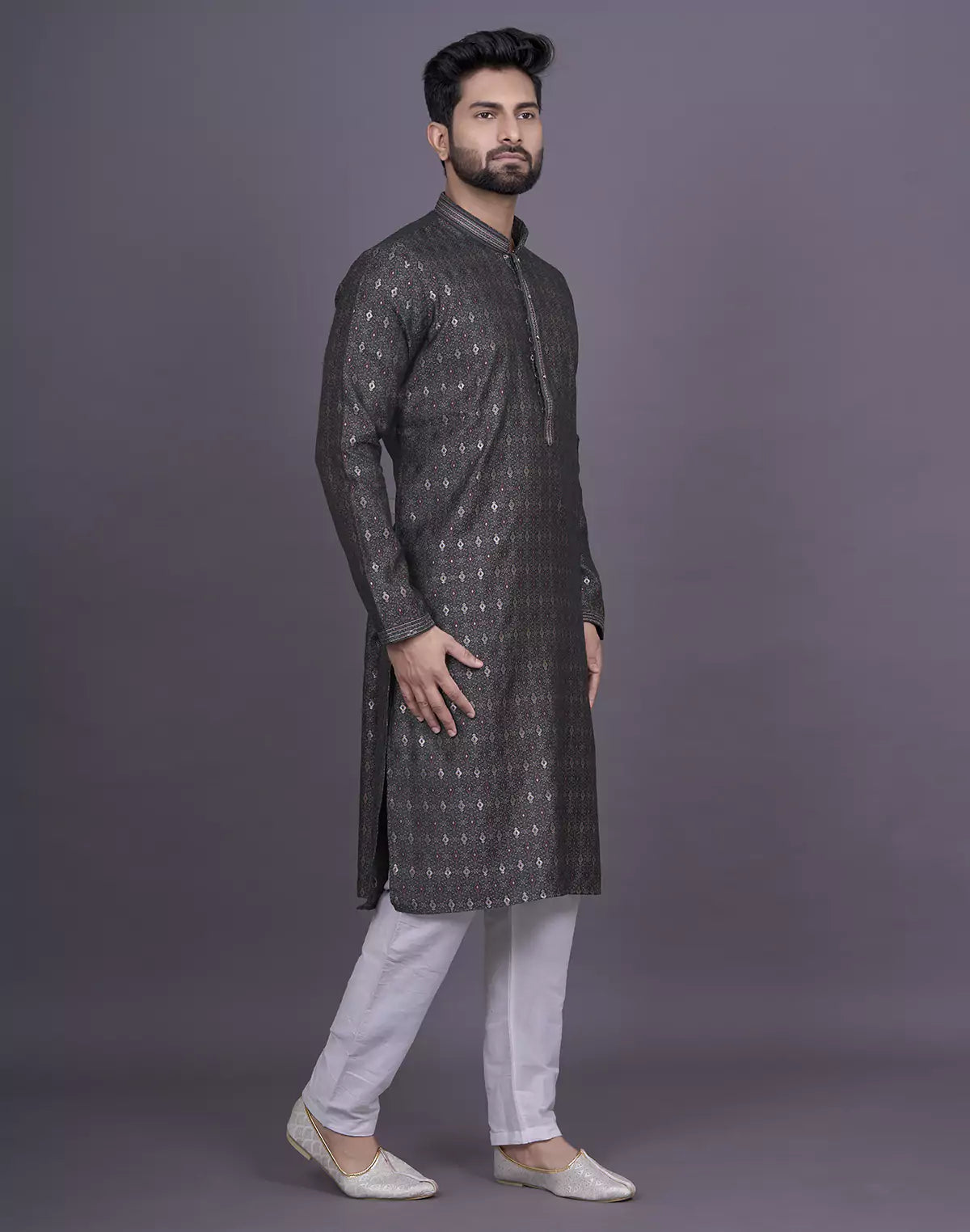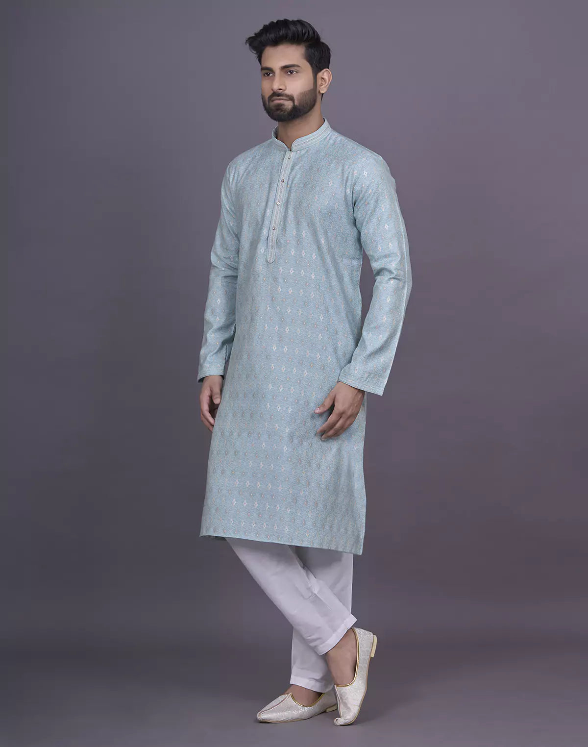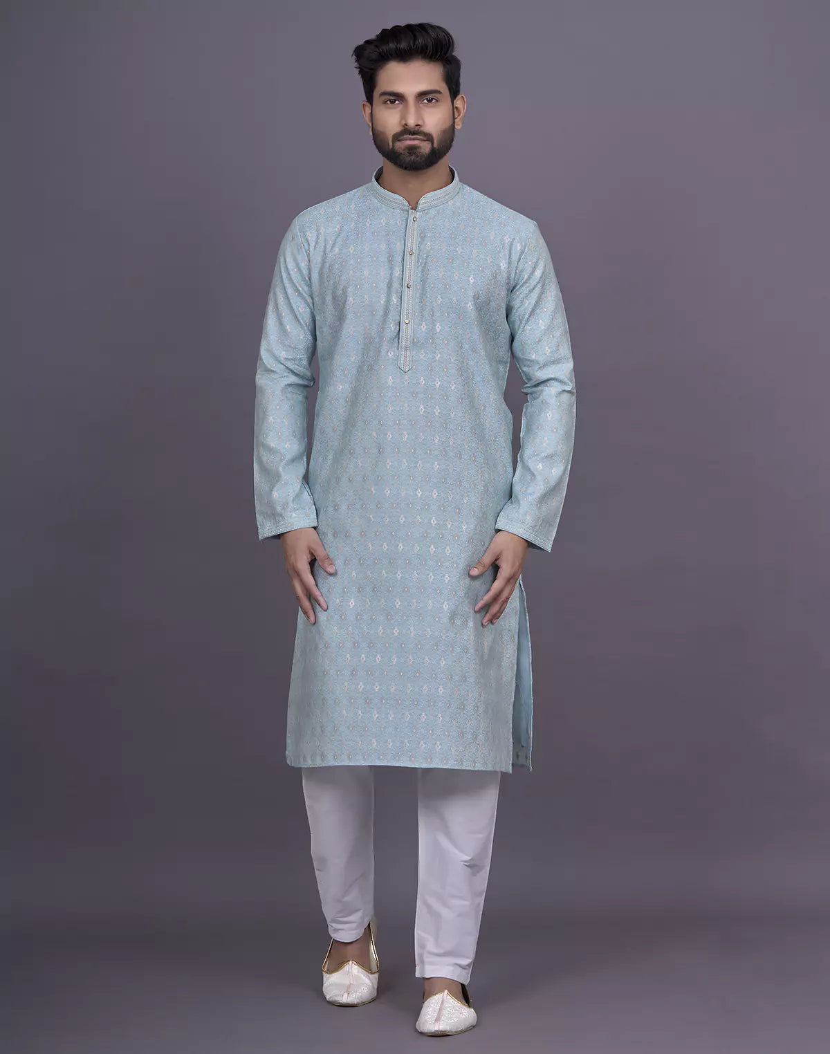 Looking for the perfect outfit for a festive gathering or family celebration? Look no further than our Soft Silk Kurta Set. The self design pattern, delicate thread work, and dazzling stones add a touch of elegance and charm to your look. Pair it with the included white pyjama for a perfectly coordinated ensemble.