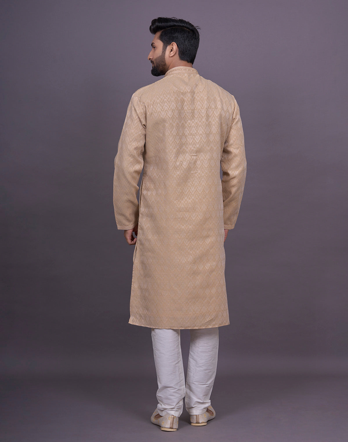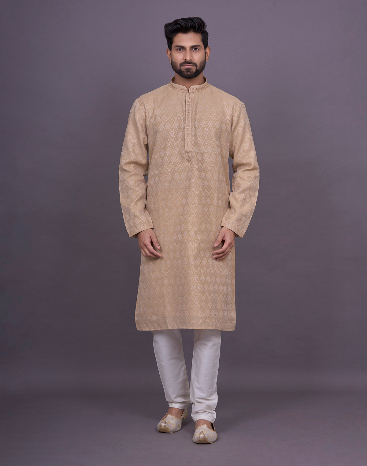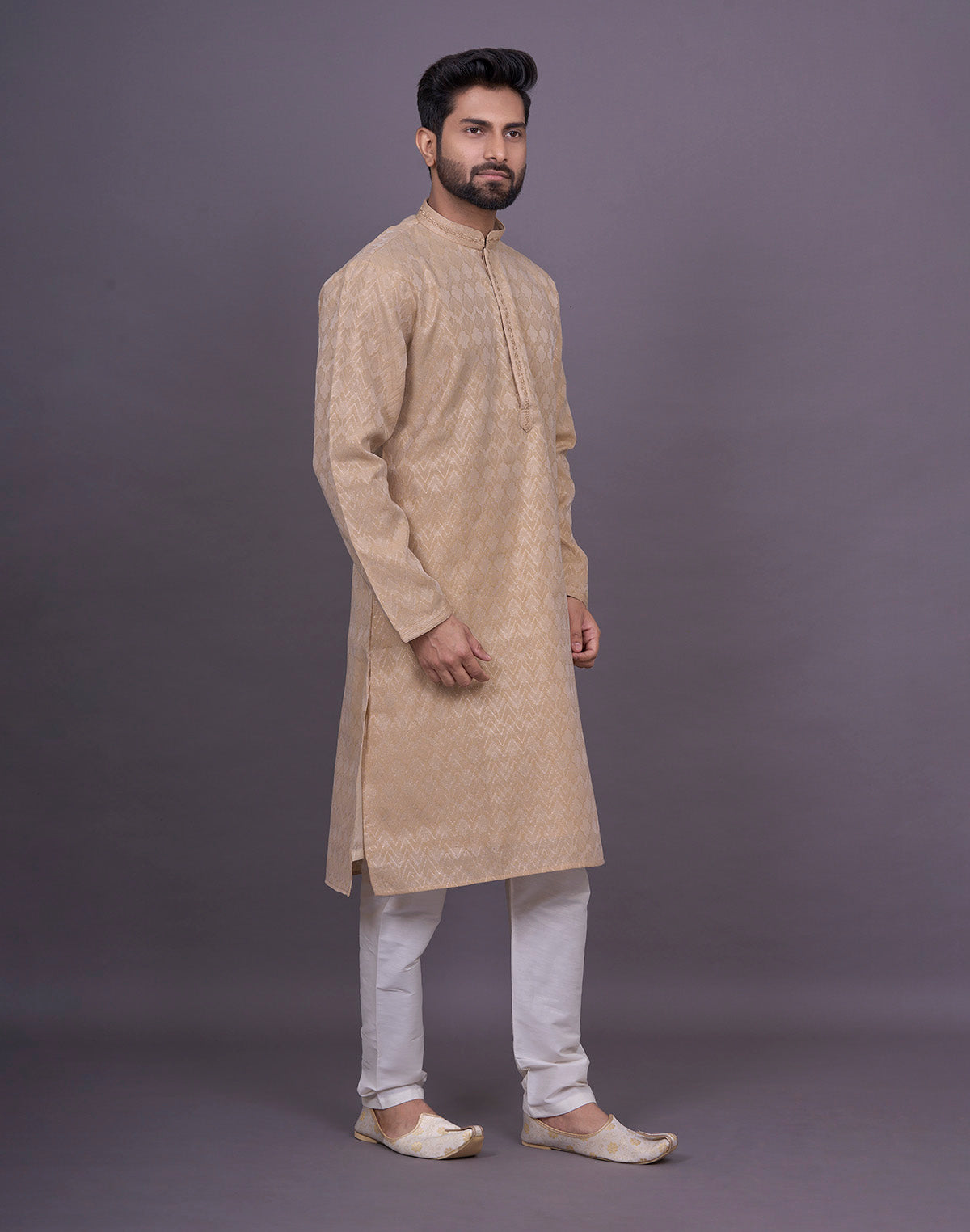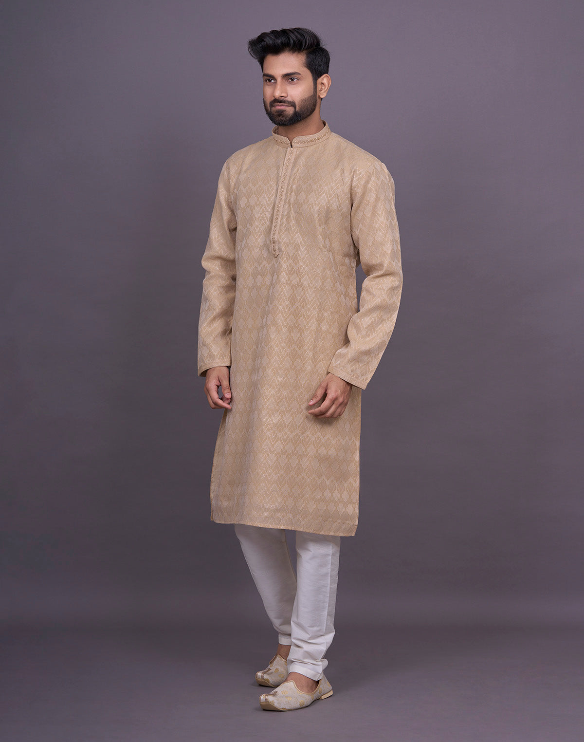 Elevate your festive style with this rich gold raw silk kurta, featuring intricate floral self designs. Crafted from premium fabric for comfort and elegance, it pairs effortlessly with a classic pyjama. Perfect for weddings, celebrations, or special occasions with a regal, modern touch.