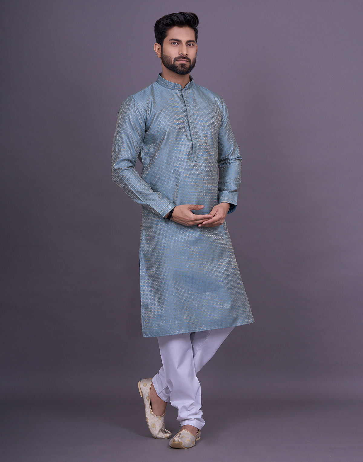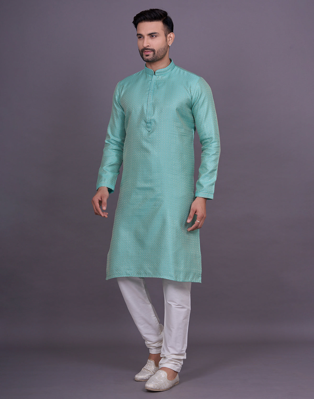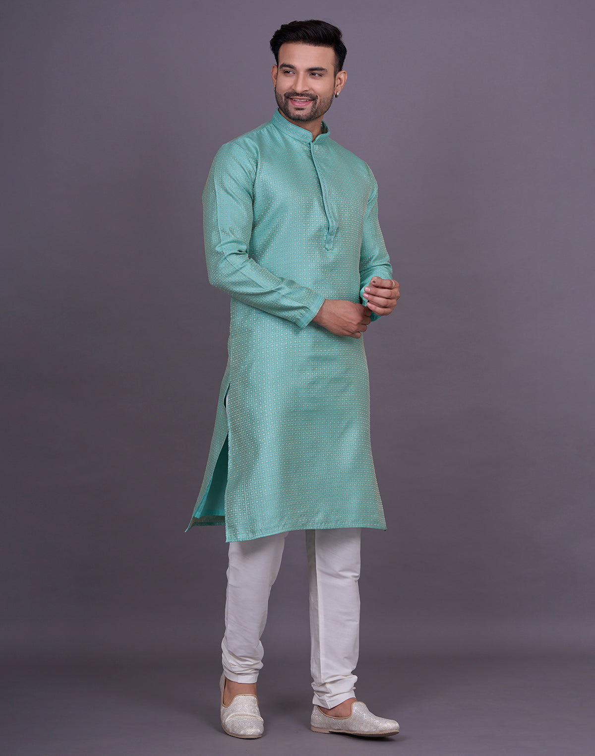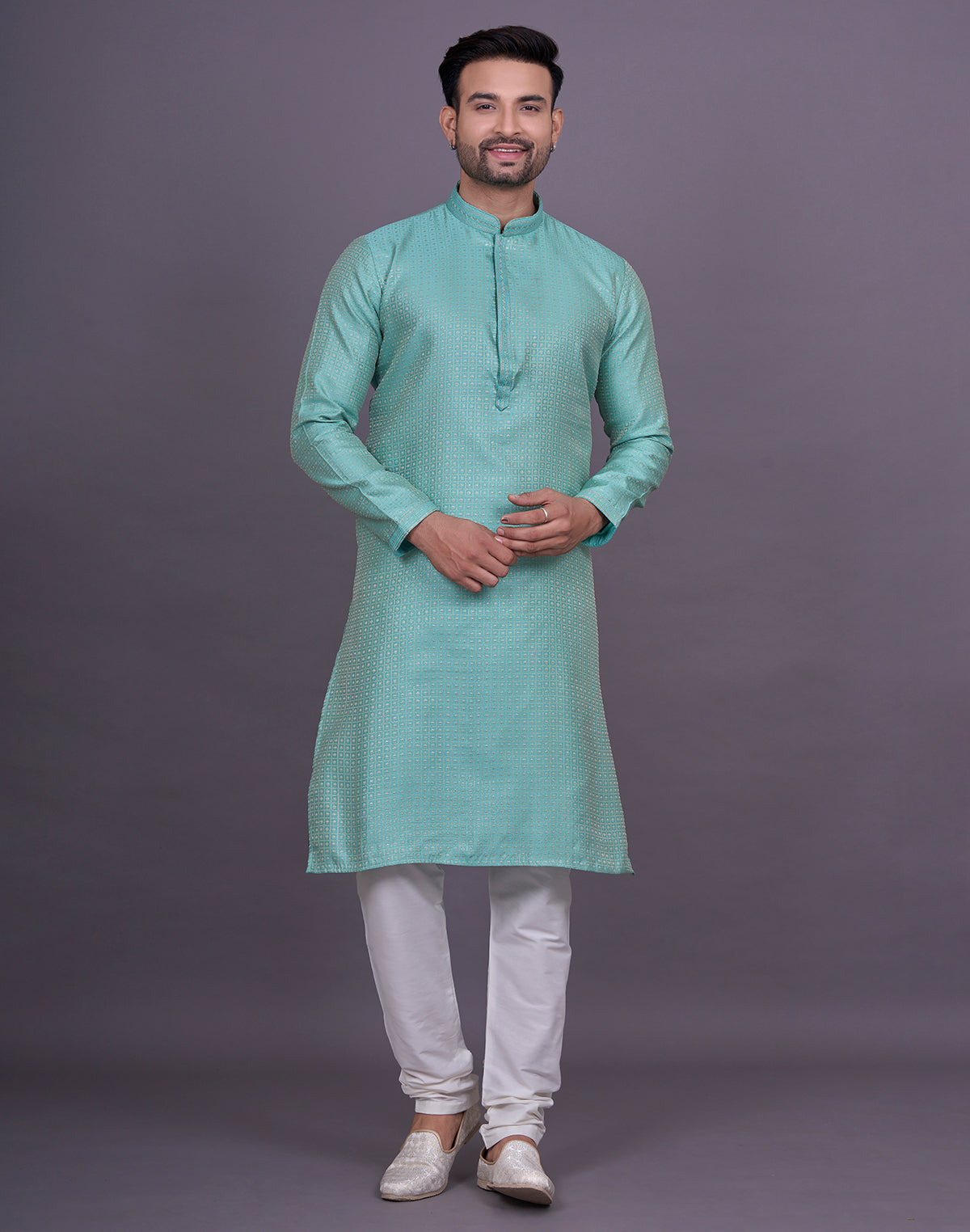 why settle for an ordinary kurta when you can elevate your look with Chekered weaving Jacquard kurta pyjama? This intricate technique adds depth and texture to the fabric, creating a luxurious and eye-catching effect that will surely turn heads.