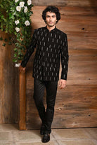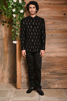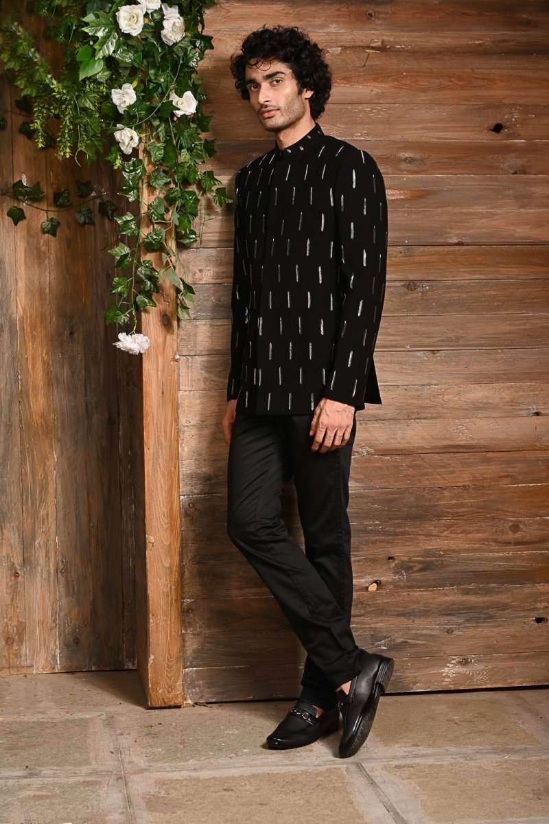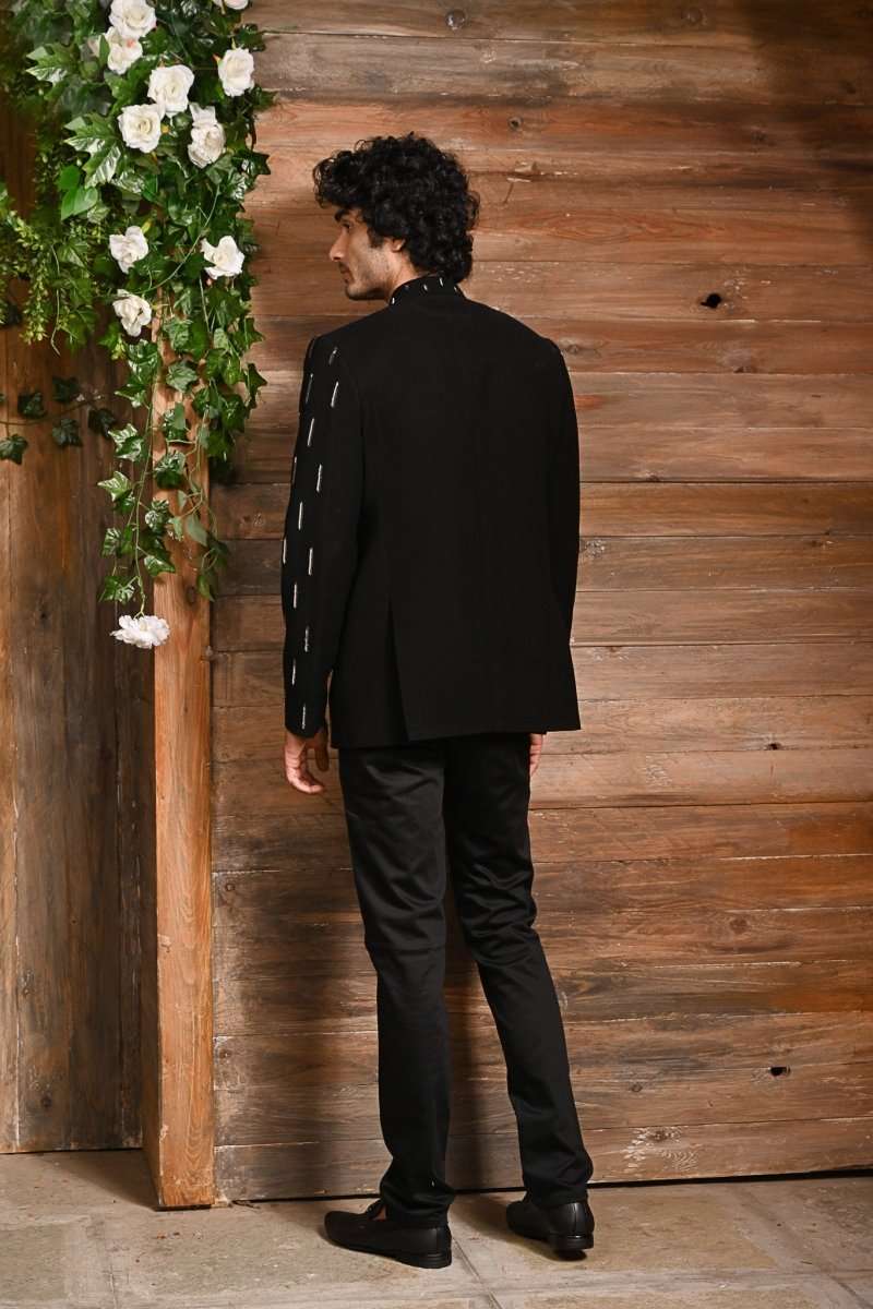 The bandhgala suit is a luxurious and exciting piece of clothing that is perfect for any special occasion. The black wool self design with cutdana work looks amazing and will make you stand out from the crowd. The bandhgala set comes with a matching tie and pocket square, so you can look your best no matter where you go.