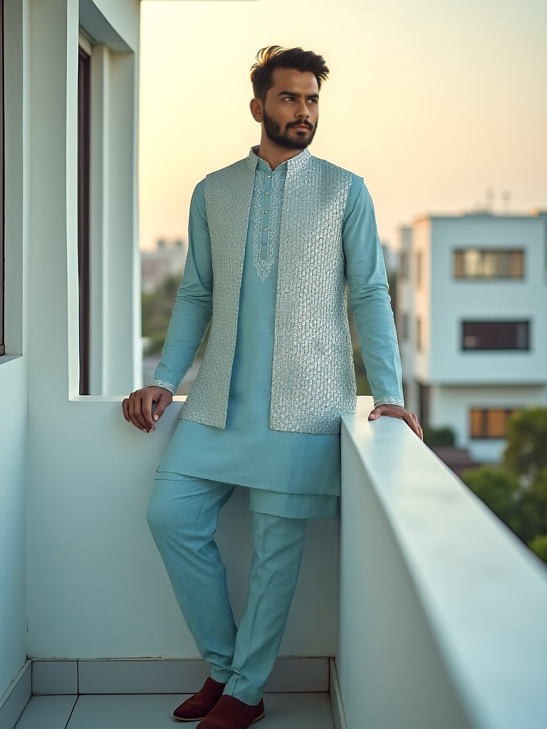 This sky coloured kurta jacket set is a yes for all your casual occasions. The Jacket is of chiffon which adds on to the defined and modern look. This set includes bottomwear to complete your look.