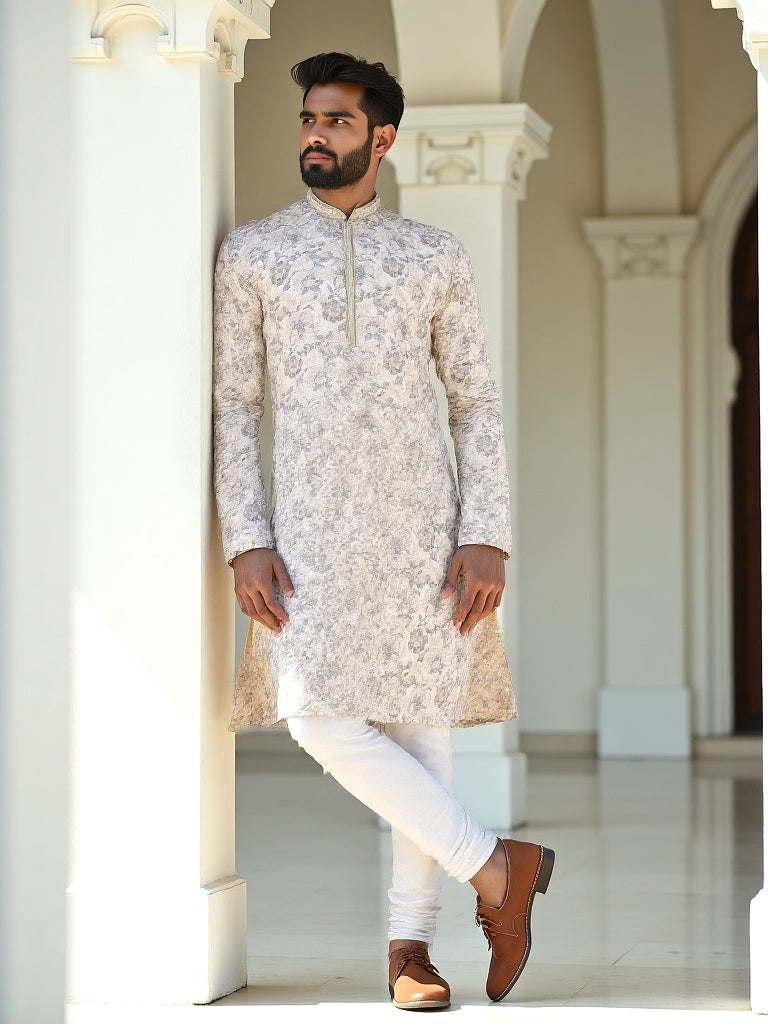 Cream Elegance Floral Chikankari work Lucknowi Kurta Pajama