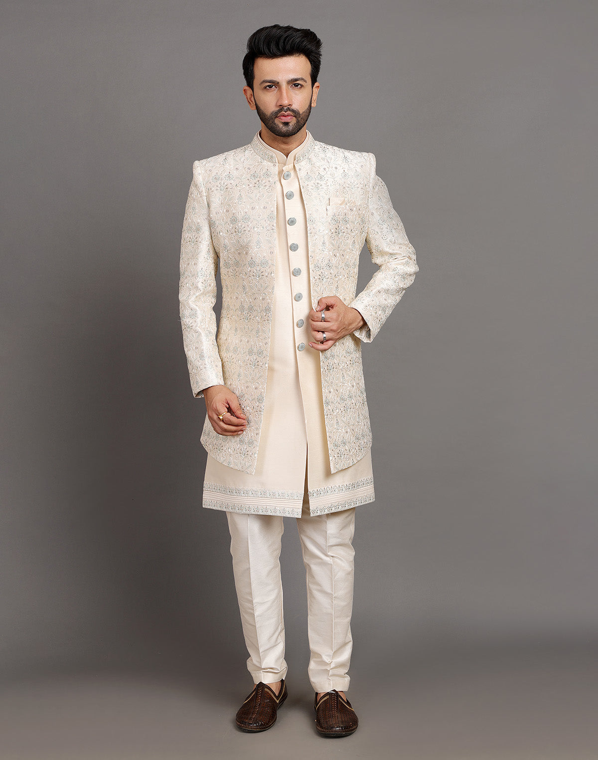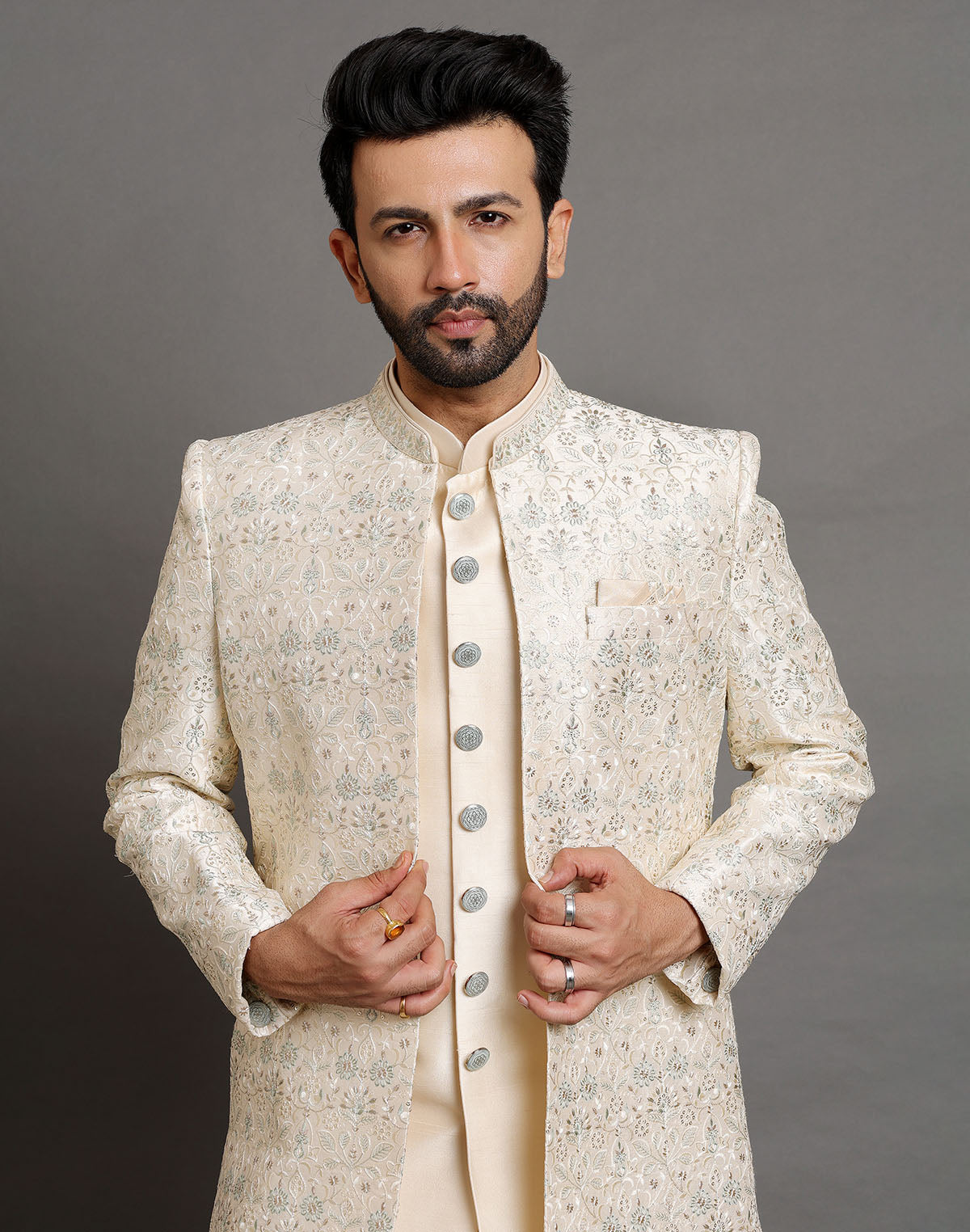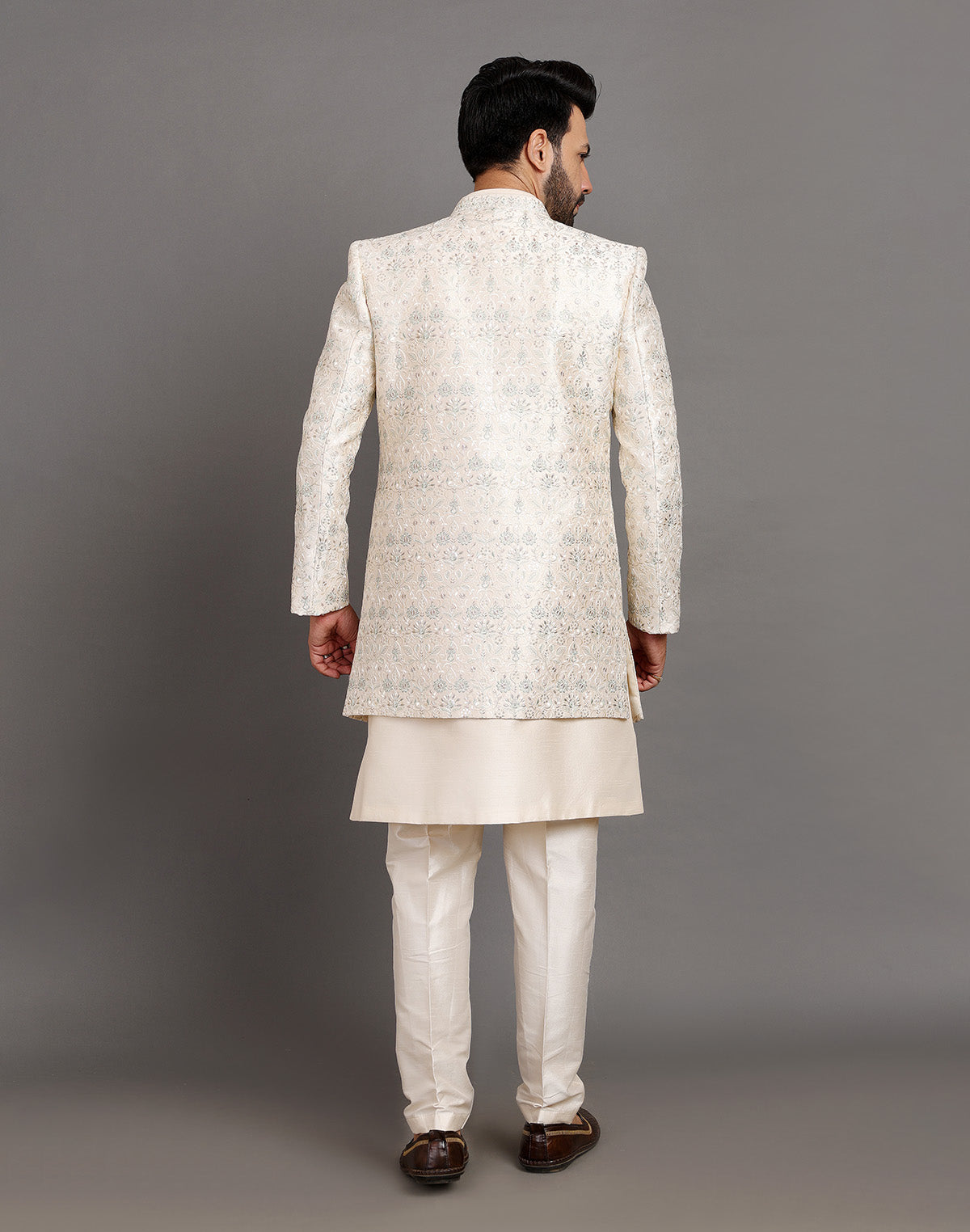 Stylish Raw Silk Embroidery work Floral Indo Westren Open Kurta Jacket is a luxurious, elegant garment designed with intricate craftsmanship. The fabric is raw silk, featuring self-highlighted threads woven into the material, creating a subtle texture that enhances its beauty. The sequence work adds a touch of glamour, making it perfect for festive occasions. The Indo Open Jacket design gives it a modern yet traditional feel, ideal for layering over ethnic attire like sarees or lehengas, and is a stylish option for both formal and semi-formal events
