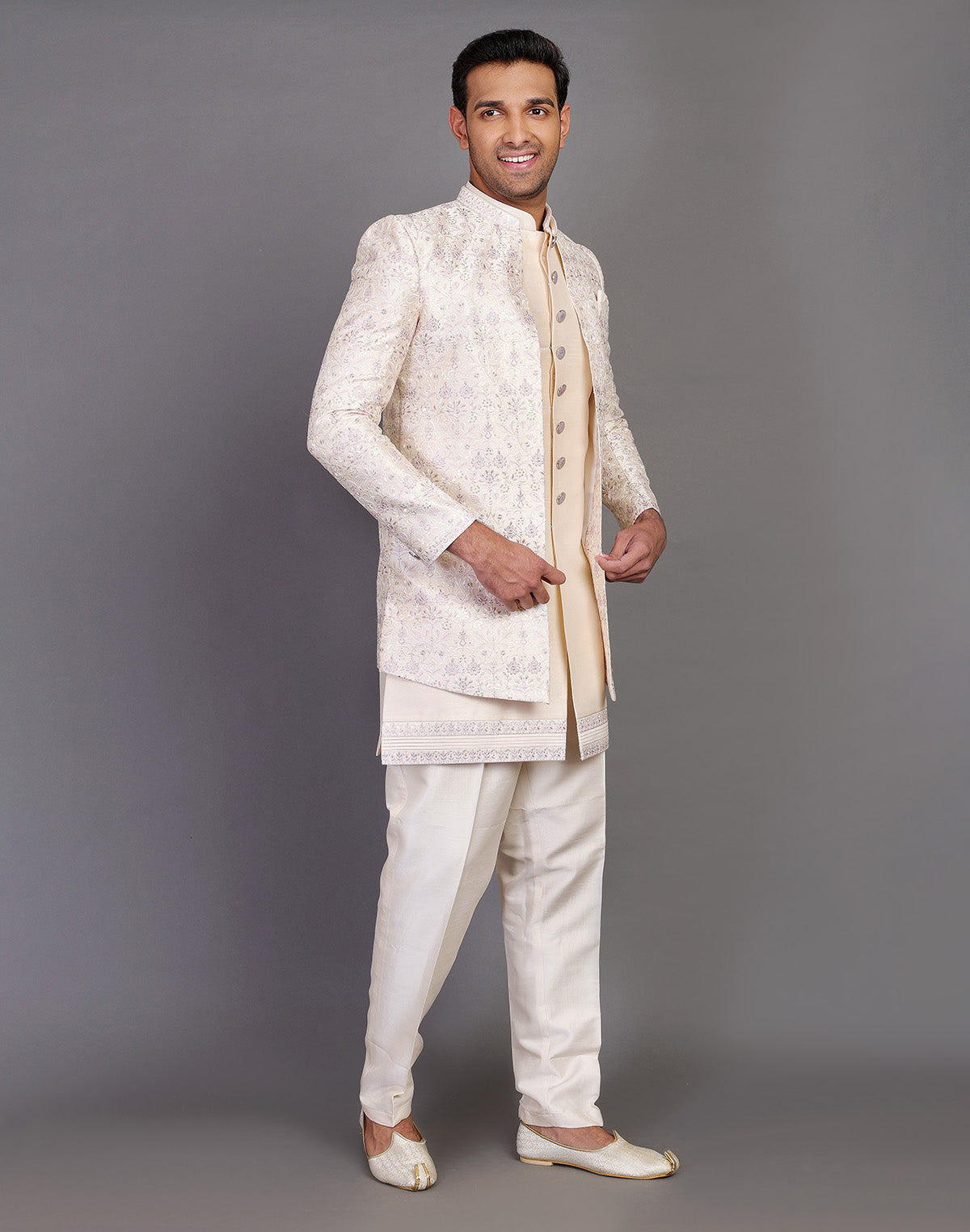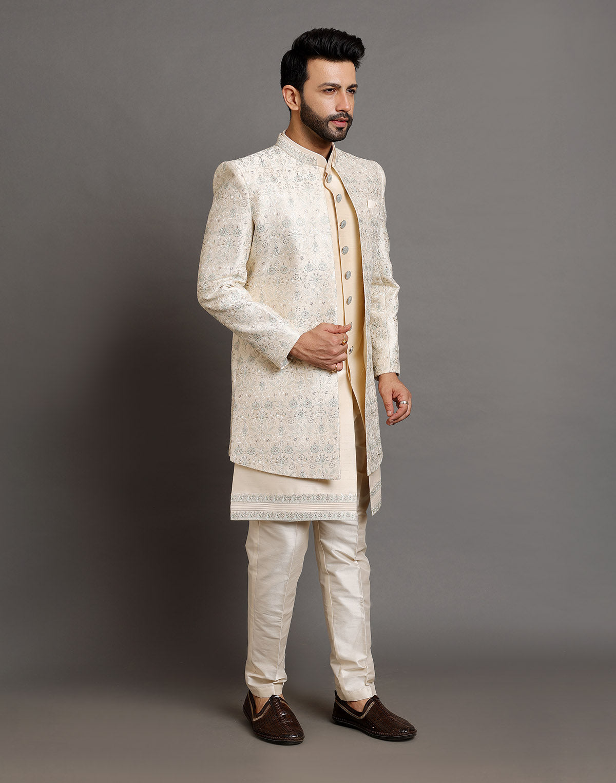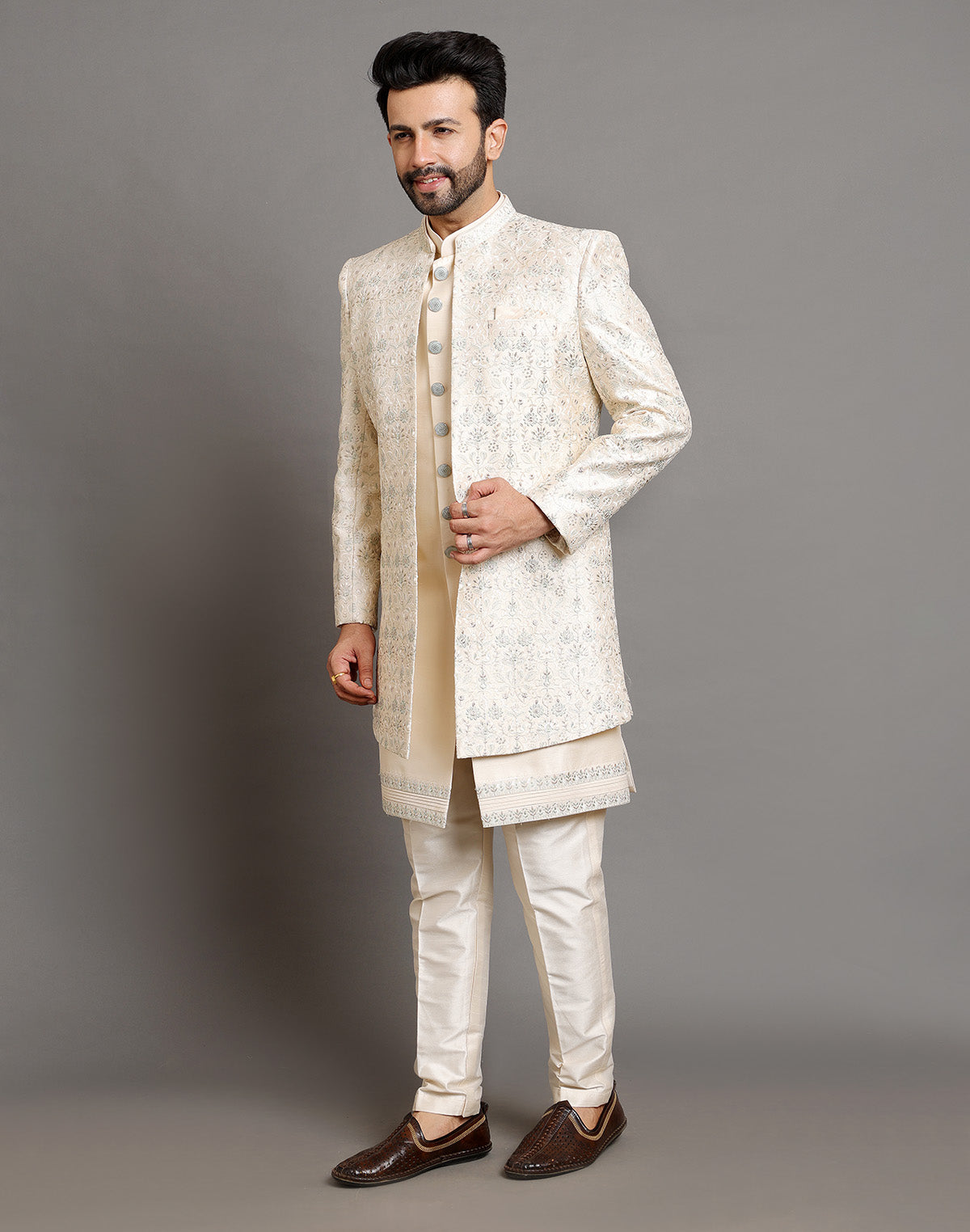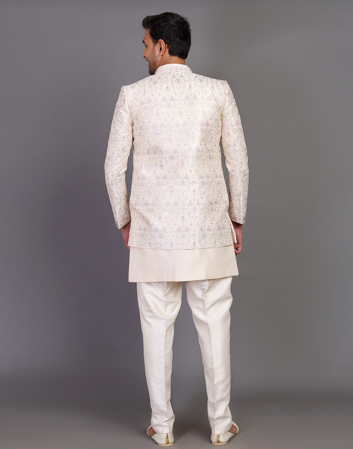 Stylish Raw Silk Embroidery work Floral Indo Westren Open Kurta Jacket is a luxurious, elegant garment designed with intricate craftsmanship. The fabric is raw silk, featuring self-highlighted threads woven into the material, creating a subtle texture that enhances its beauty. The sequence work adds a touch of glamour, making it perfect for festive occasions. The Indo Open Jacket design gives it a modern yet traditional feel, ideal for layering over ethnic attire like sarees or lehengas, and is a stylish option for both formal and semi-formal events