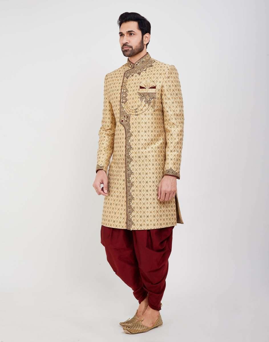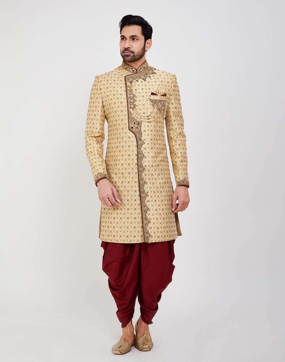 | WORK: Embroidery Work On Collar And Hand Cuffs | GARMENT TYPE: Wedding Sherwani Set |
