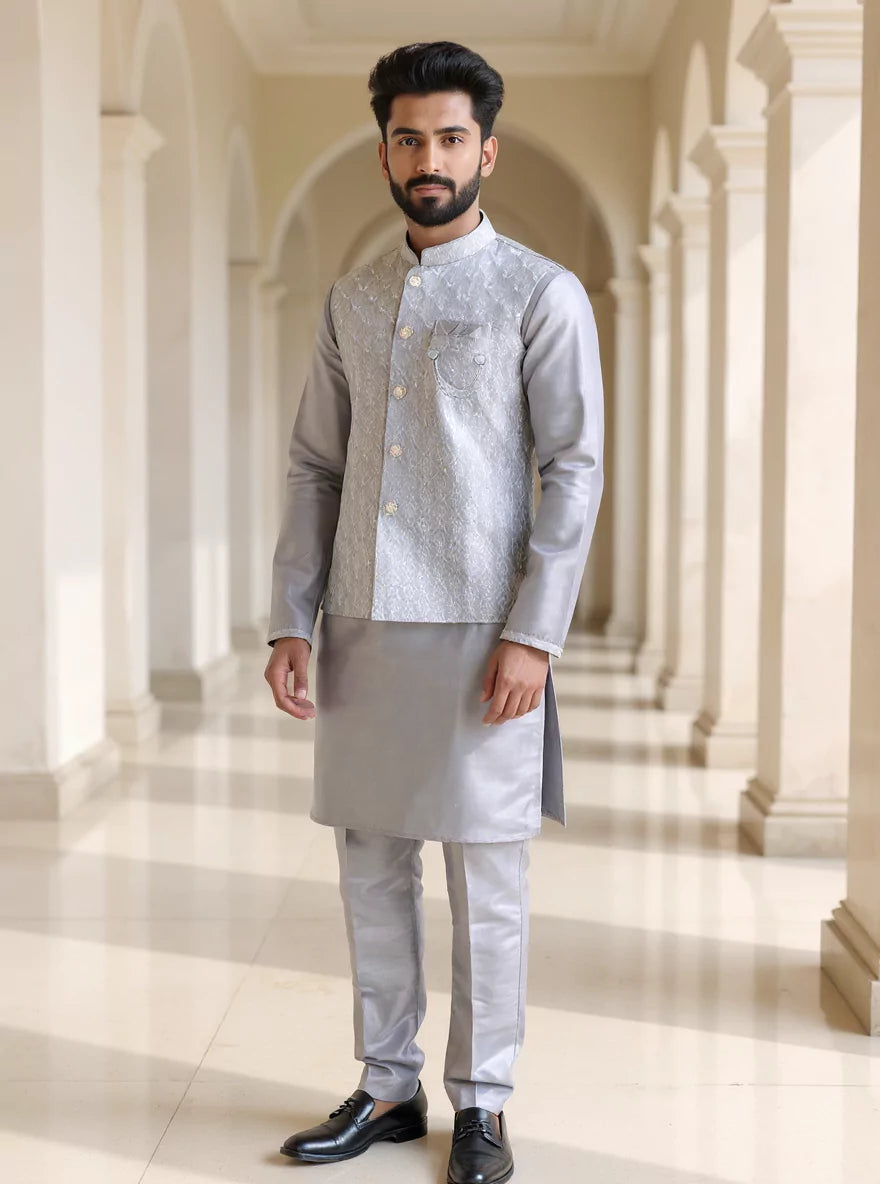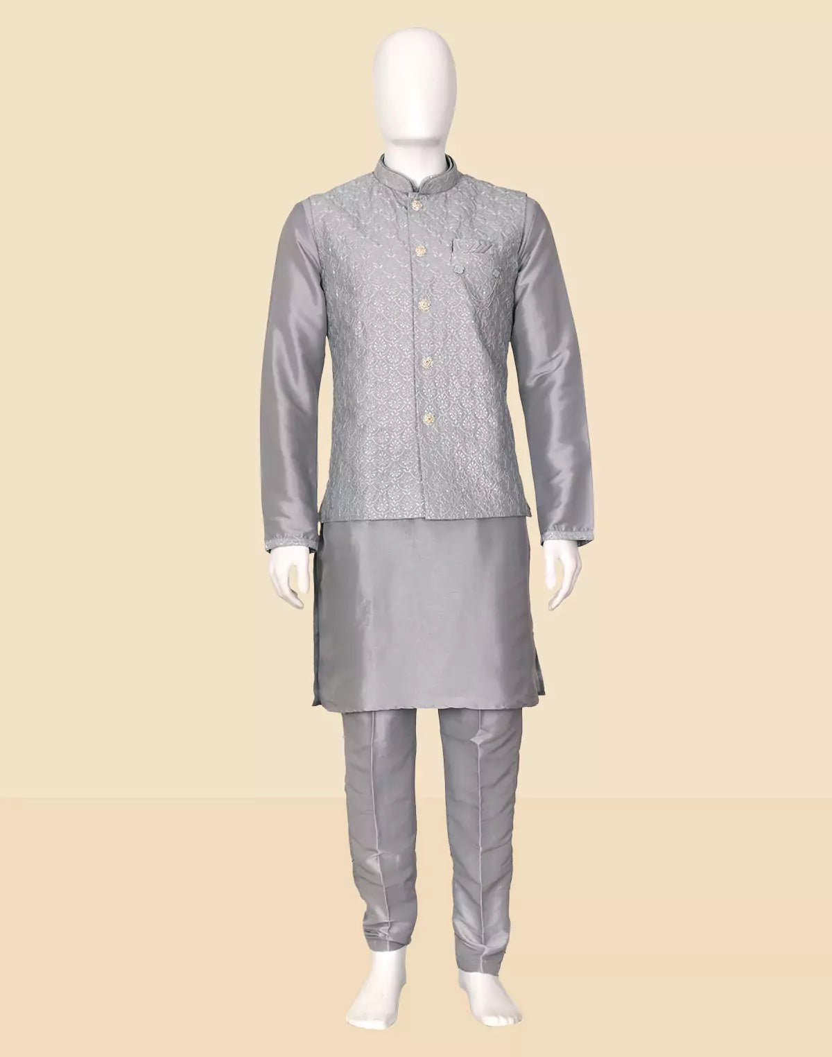This Grey Raw Silk Kurta and Pyjama set is paired with a Floral Thread and Embellished Jacquard Jacket, creating a sophisticated and regal look. The raw silk fabric offers a luxurious texture, while the intricate floral threadwork and embellishments add a touch of grandeur. Perfect for festive occasions and formal gatherings, this ensemble blends tradition with contemporary elegance.