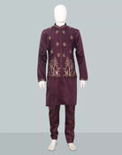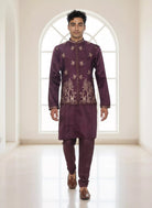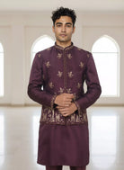 Graceful satin kurta set in rich purple, adorned with floral bunch embroidery. Paired with a chic jacket, it’s perfect for festive evenings and elegant celebrations.