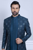The Rawsilk Kurta with superb finishing and sequence work in massive blue color adorned with thread design is a perfect outfit for a groom to wear on his wedding day. This attire exudes elegance, style, and sophistication that make the groom stand out from the rest of the crowd