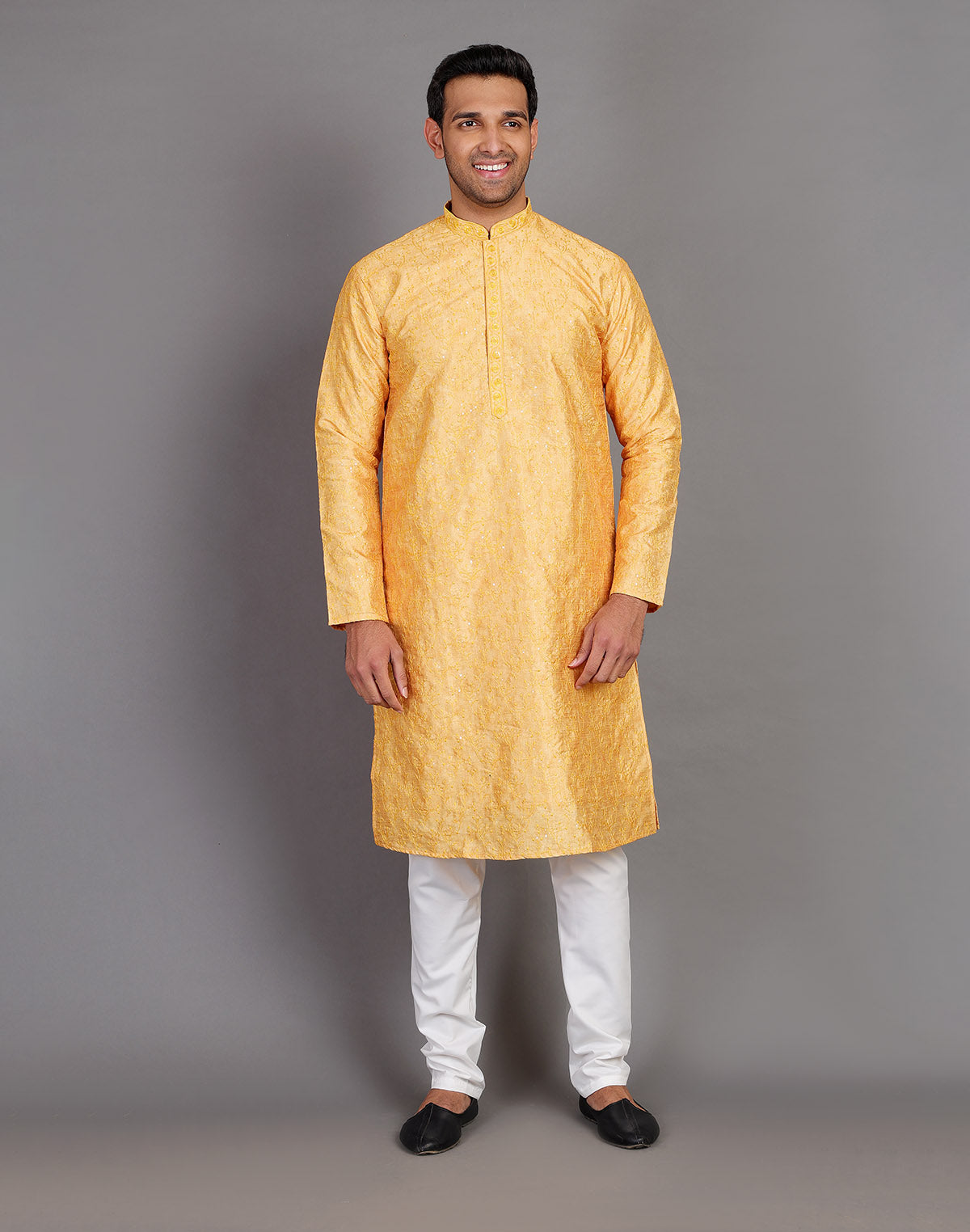 Embrace classic style with a modern twist in our Self Thread Embroidery Design Raw Silk Kurta Pyjama Set. The comfortable fit and timeless design make it a versatile addition to your ethnic wear collection, guaranteed to make you feel confident and stylish.