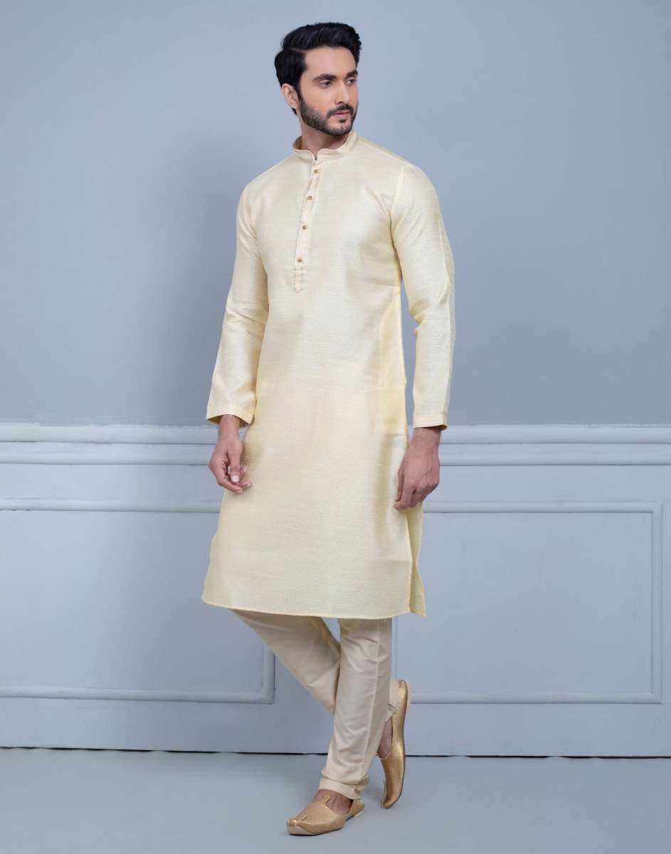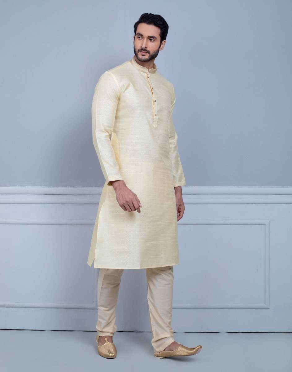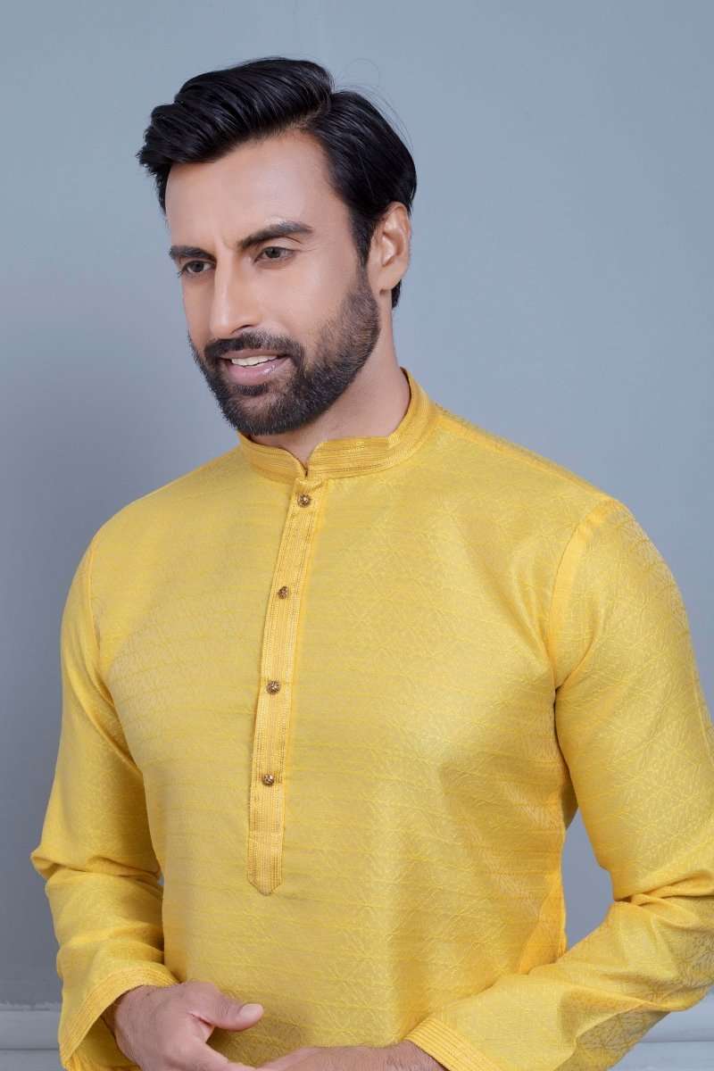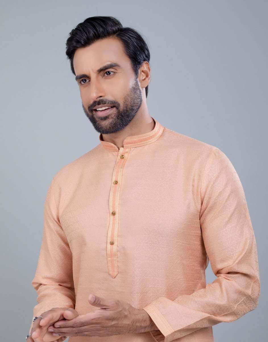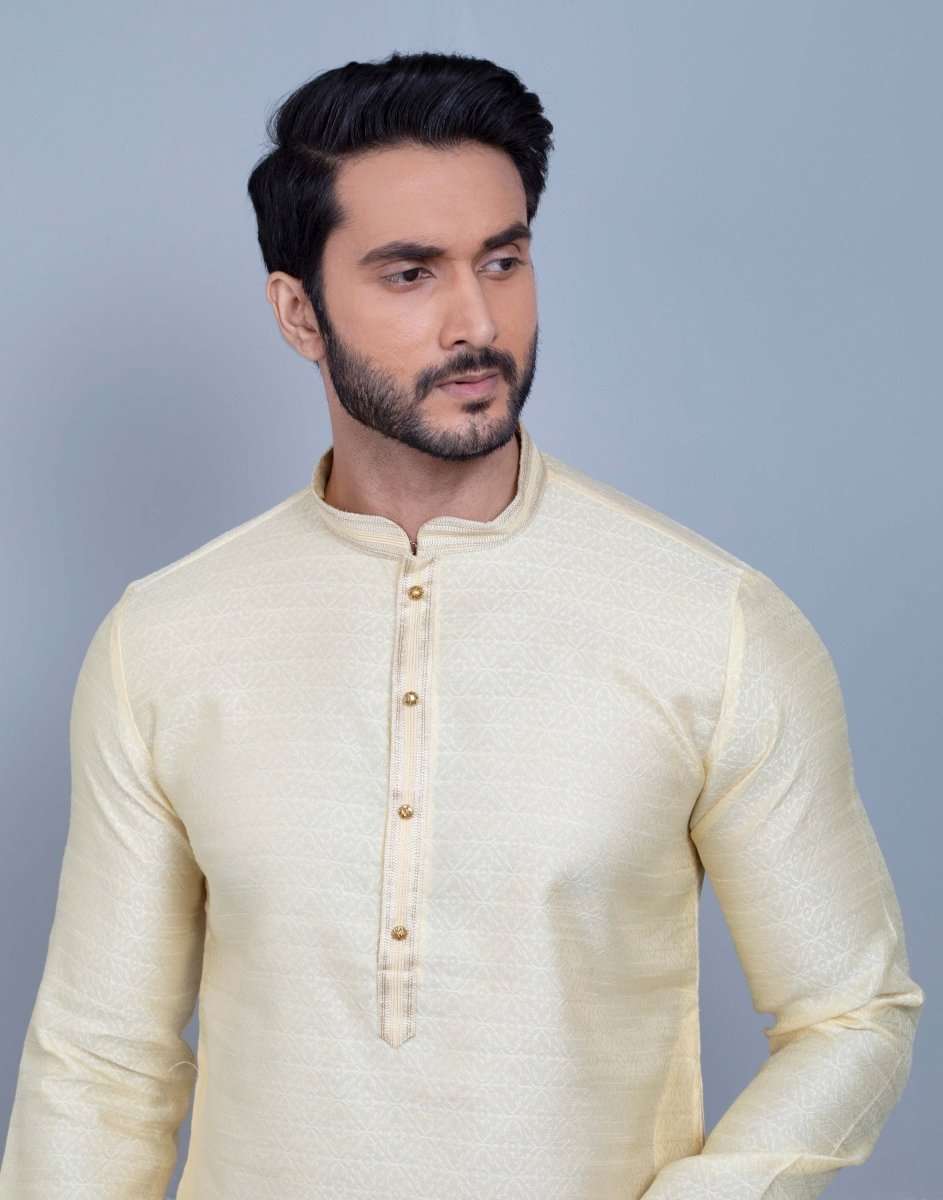 when it comes to wedding season, where all eyes are on the groom's outfit, there couldn't be anything more perfect than this kurta with its unique and standout quality. With its luxurious texture and elegant appearance, this style surely embodies sophistication making any man look dapper- instantly elevating their personality beyond measure!