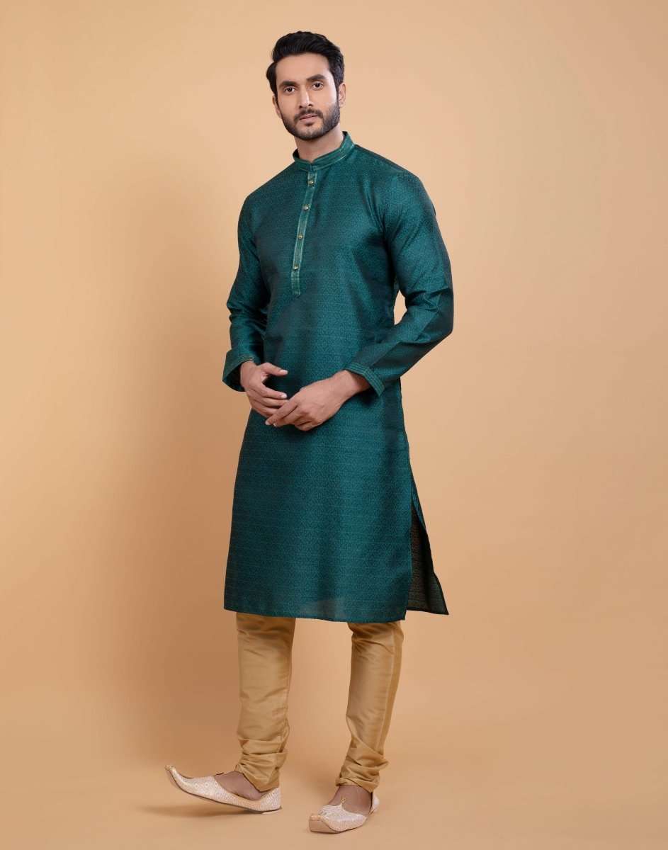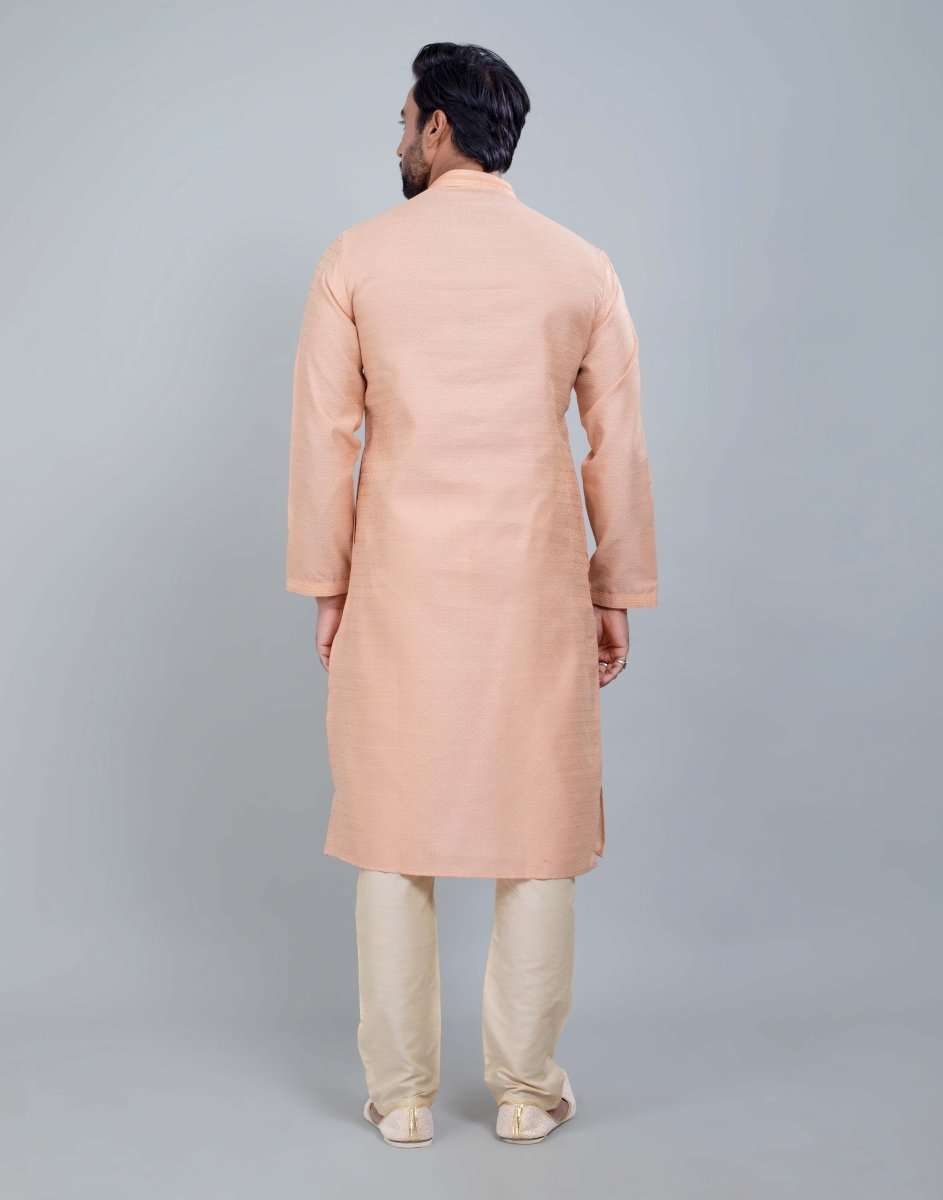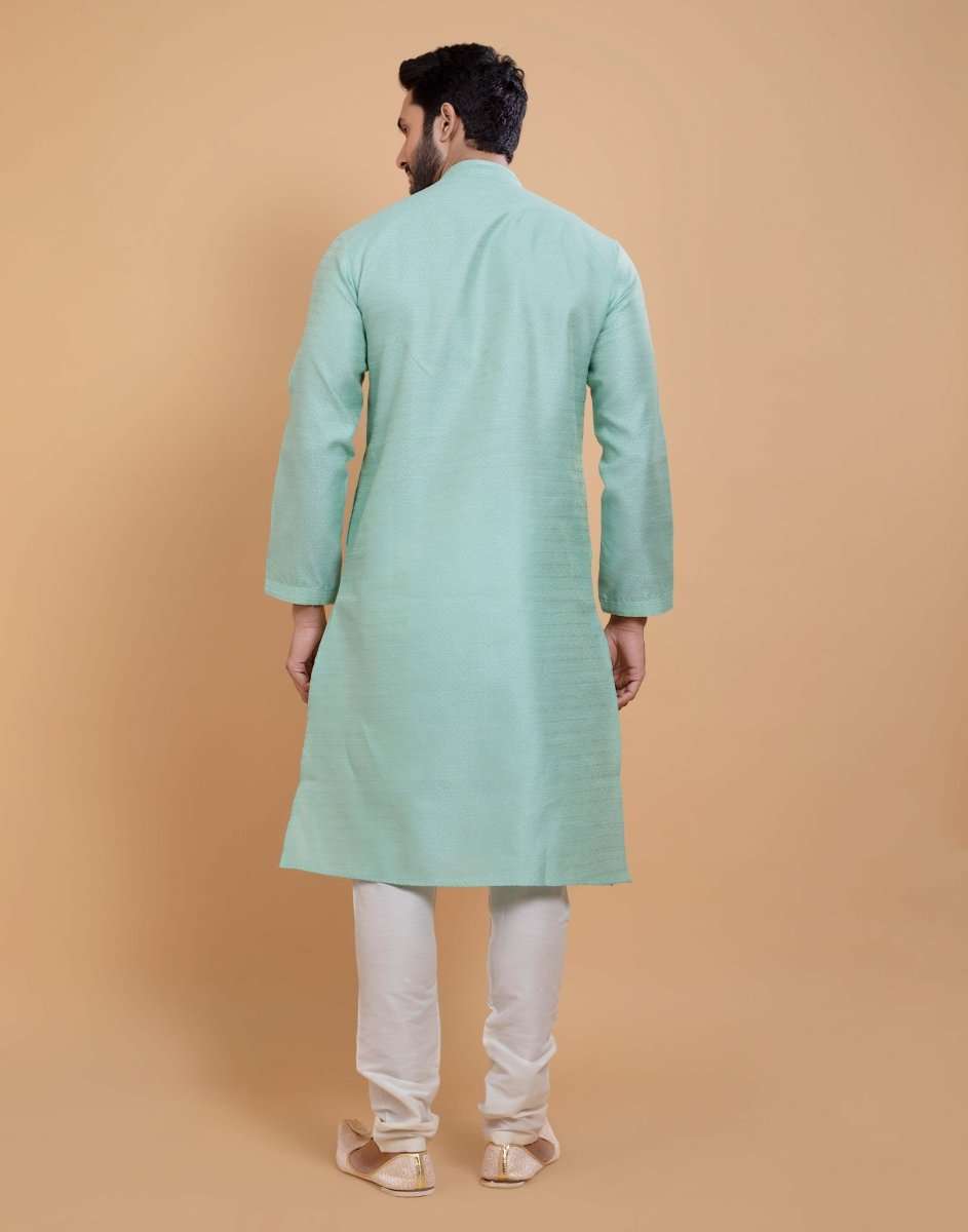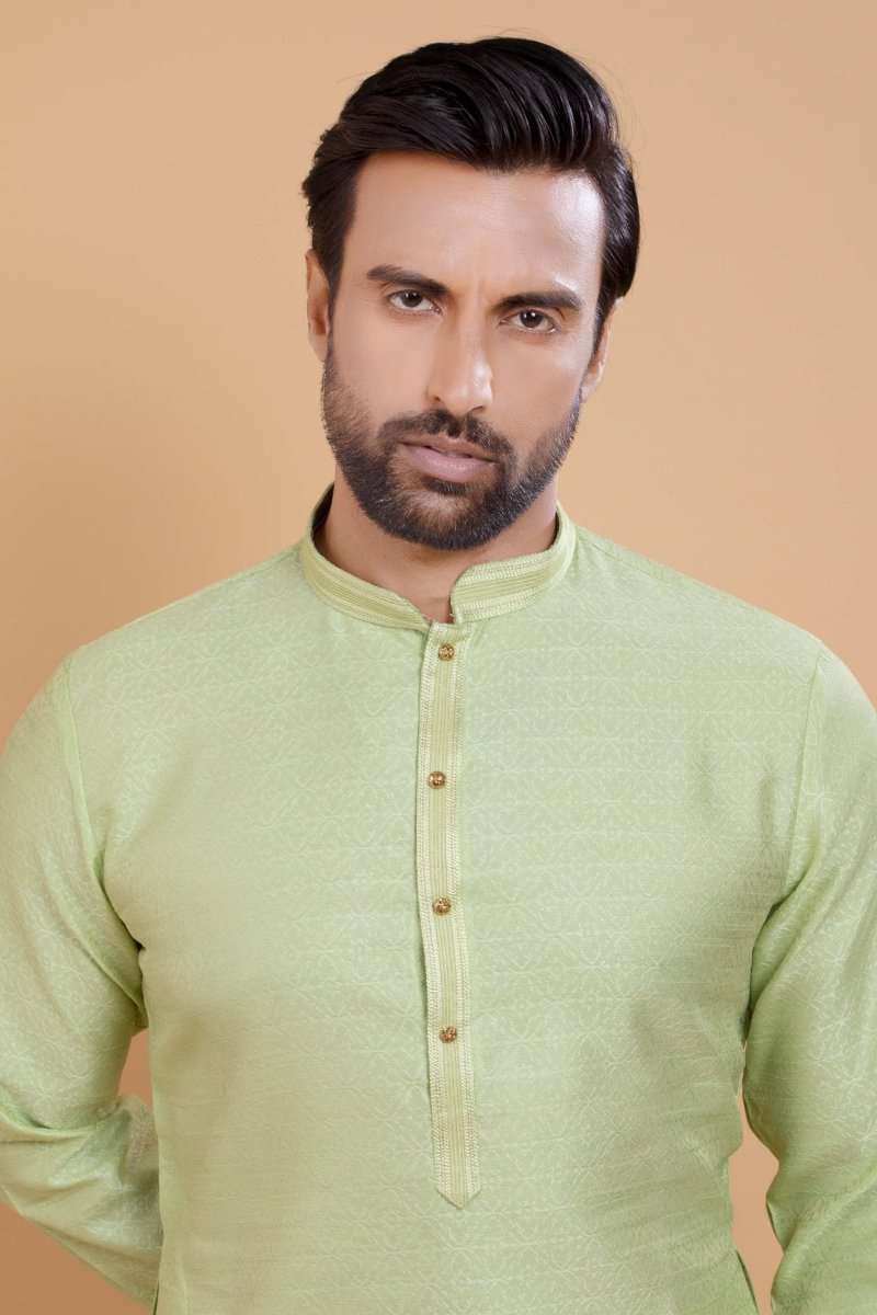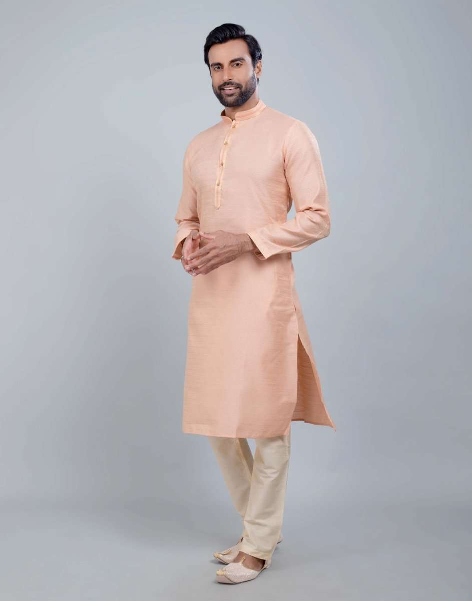 when it comes to wedding season, where all eyes are on the groom's outfit, there couldn't be anything more perfect than this kurta with its unique and standout quality. With its luxurious texture and elegant appearance, this style surely embodies sophistication making any man look dapper- instantly elevating their personality beyond measure!