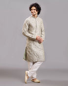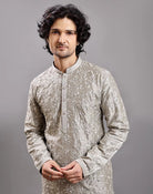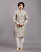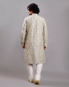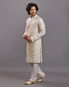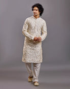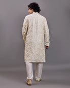 Elegant men's cotton silk kurta featuring intricate thread and Embroidery Work Botanical designs, paired with a off white pajama. Perfect for a sophisticated look.