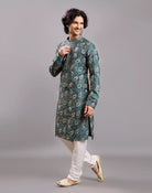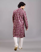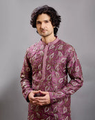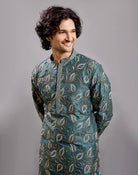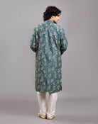 Elegant men's cotton silk kurta featuring intricate thread Work Botanical designs, paired with a off white pajama. Perfect for a sophisticated look.