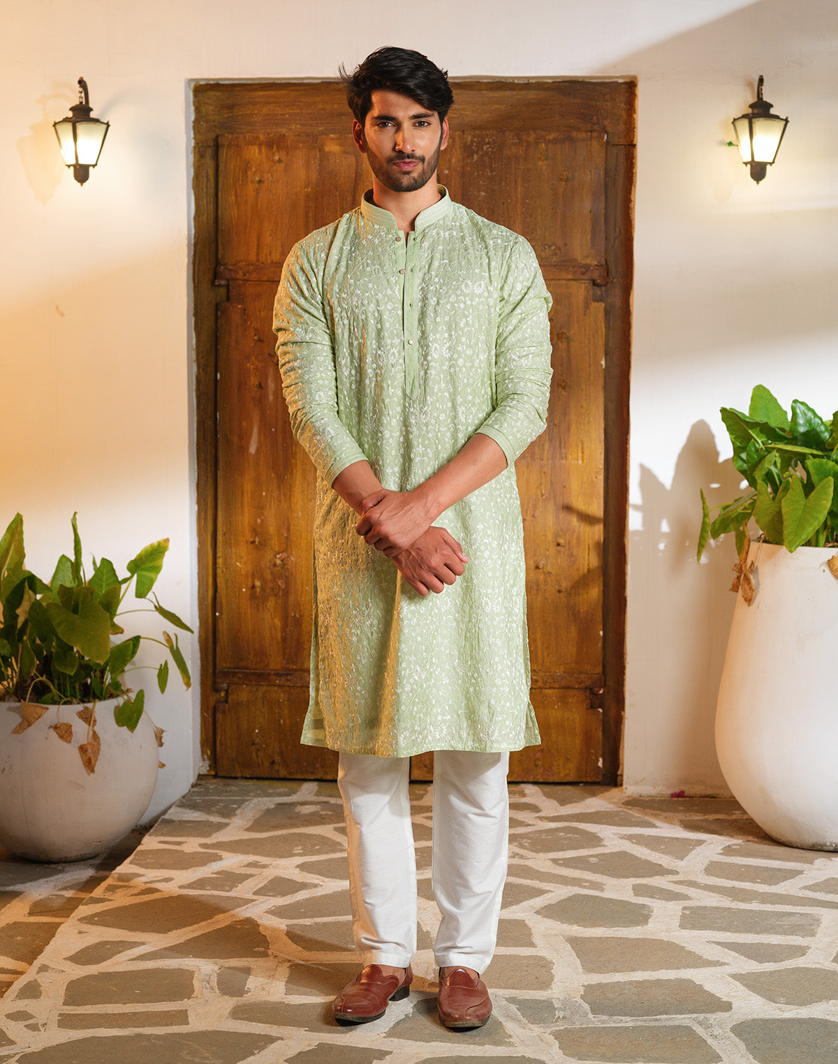 Floral Design Pista Coloured Chikankari work Kurta Pyjama Set