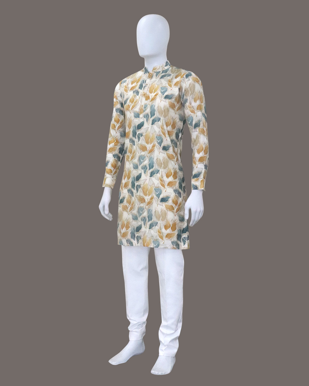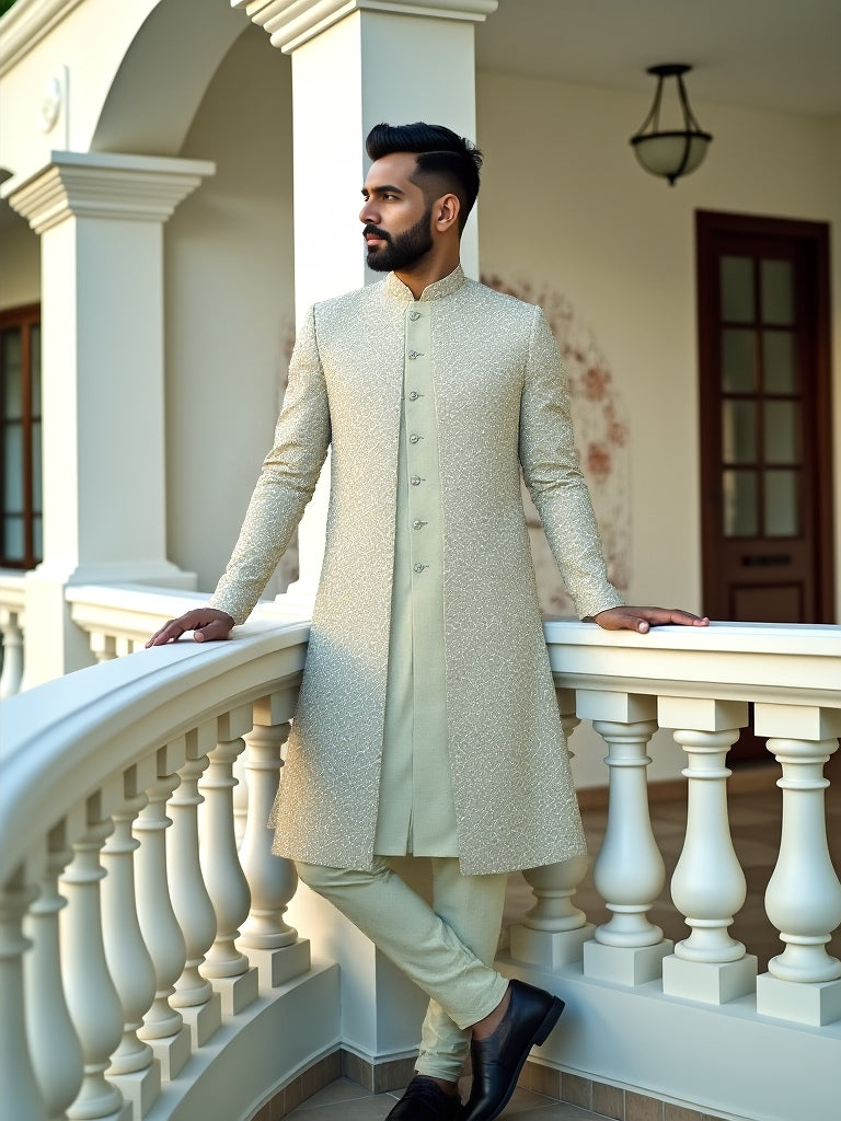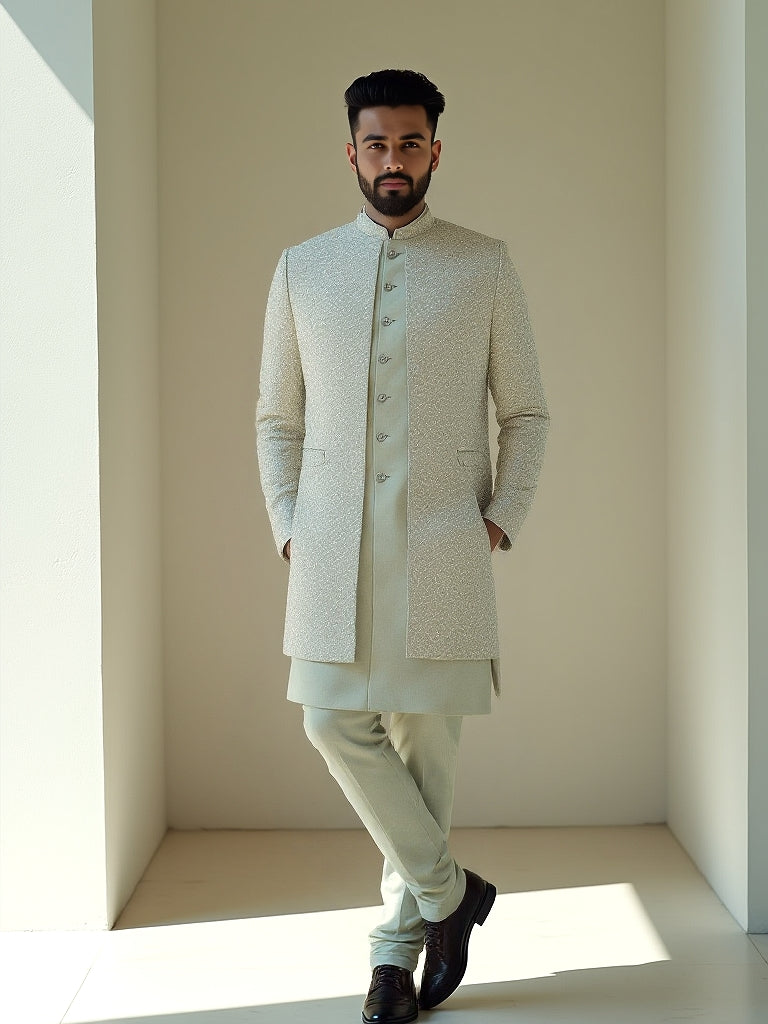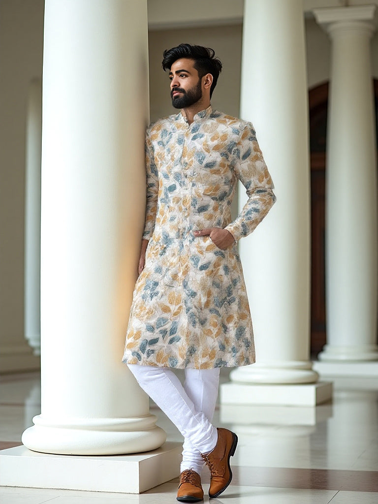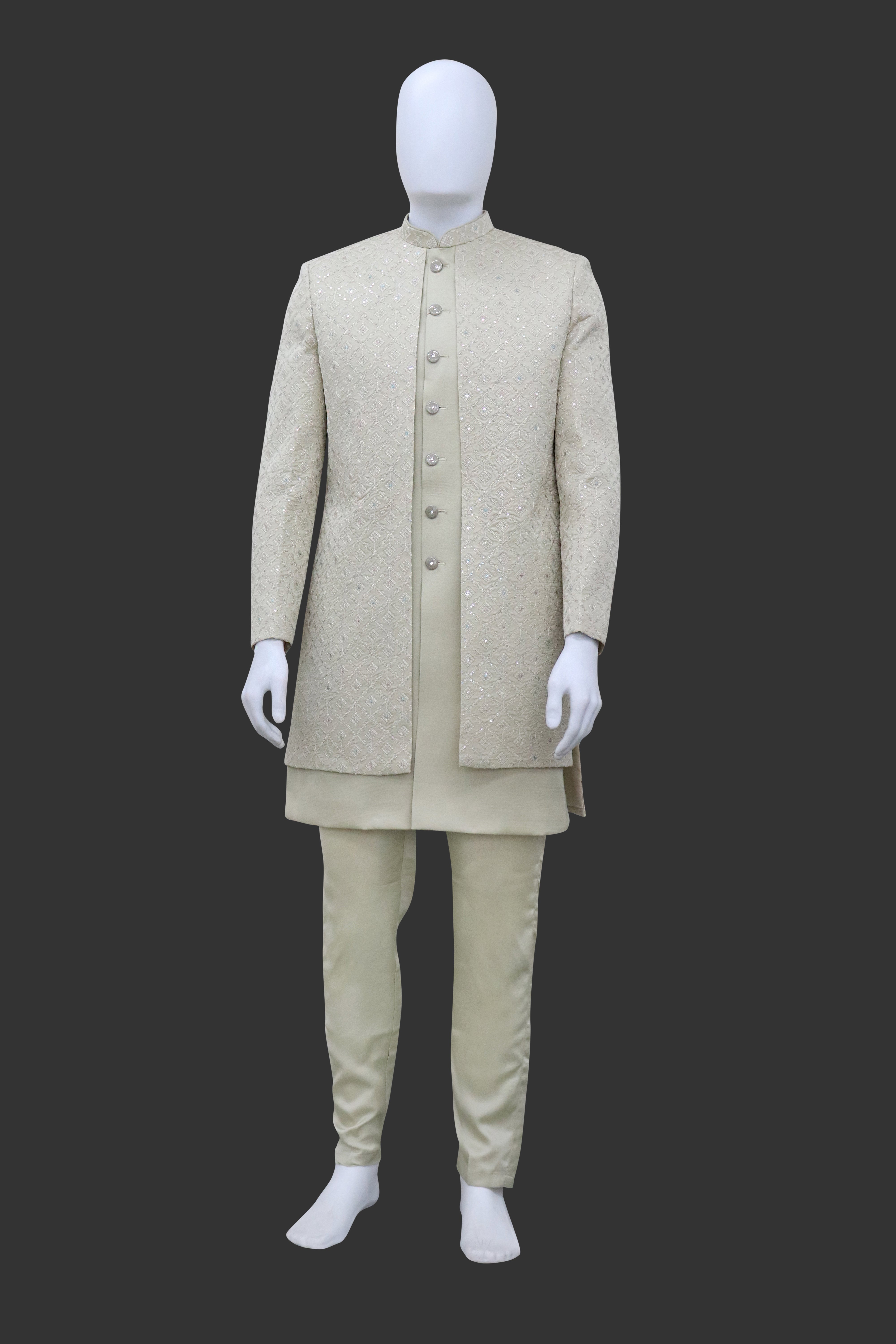Cream Floral Multi Thread Embroidery with Stones work Milky Silk Sherwani