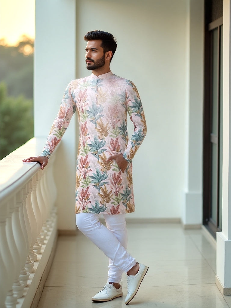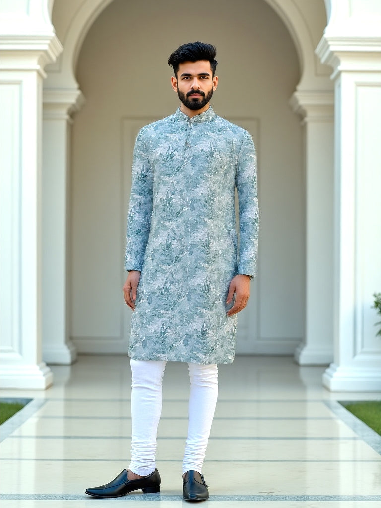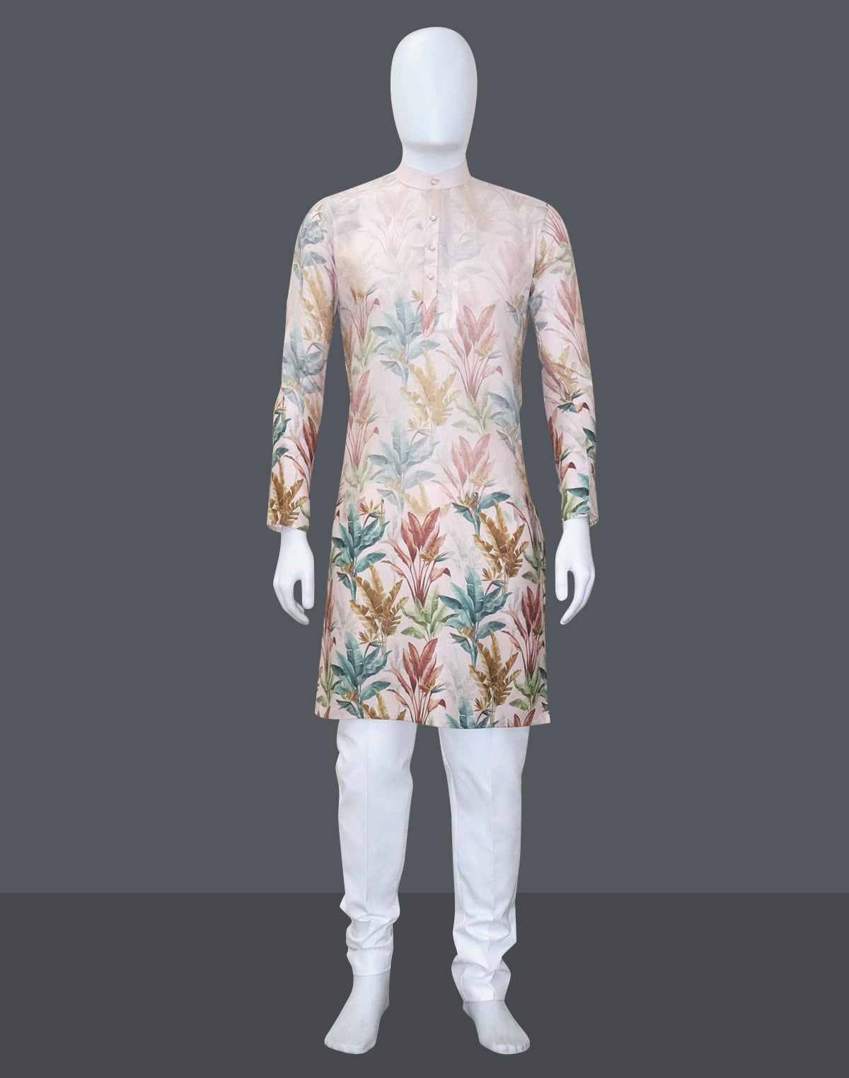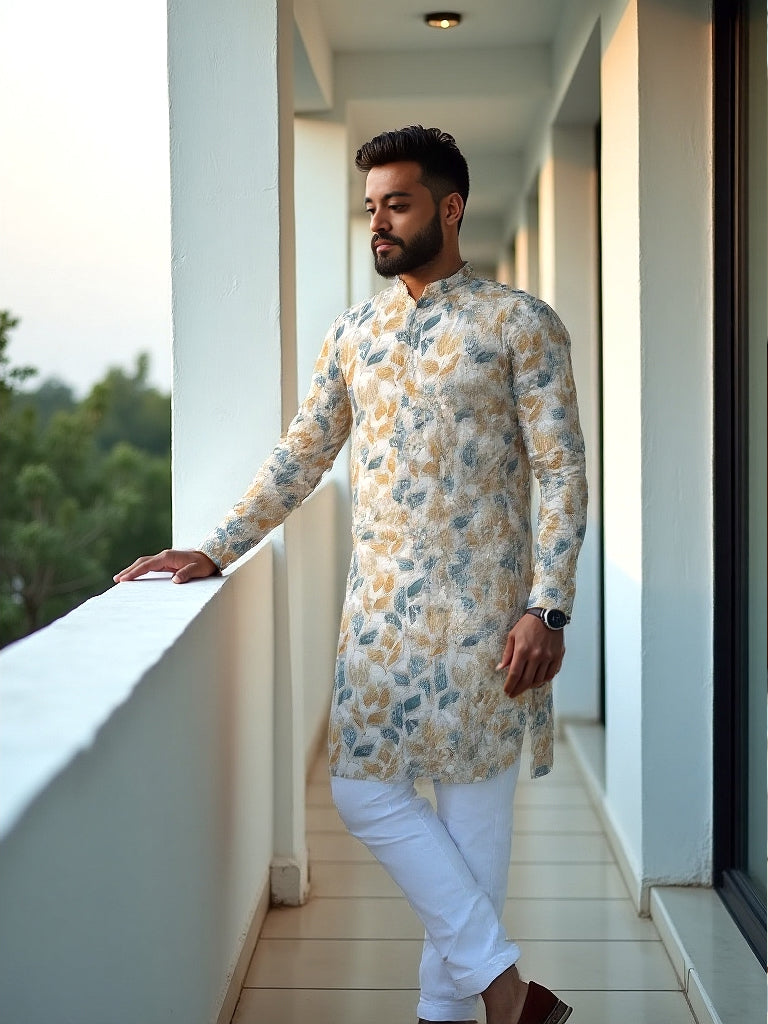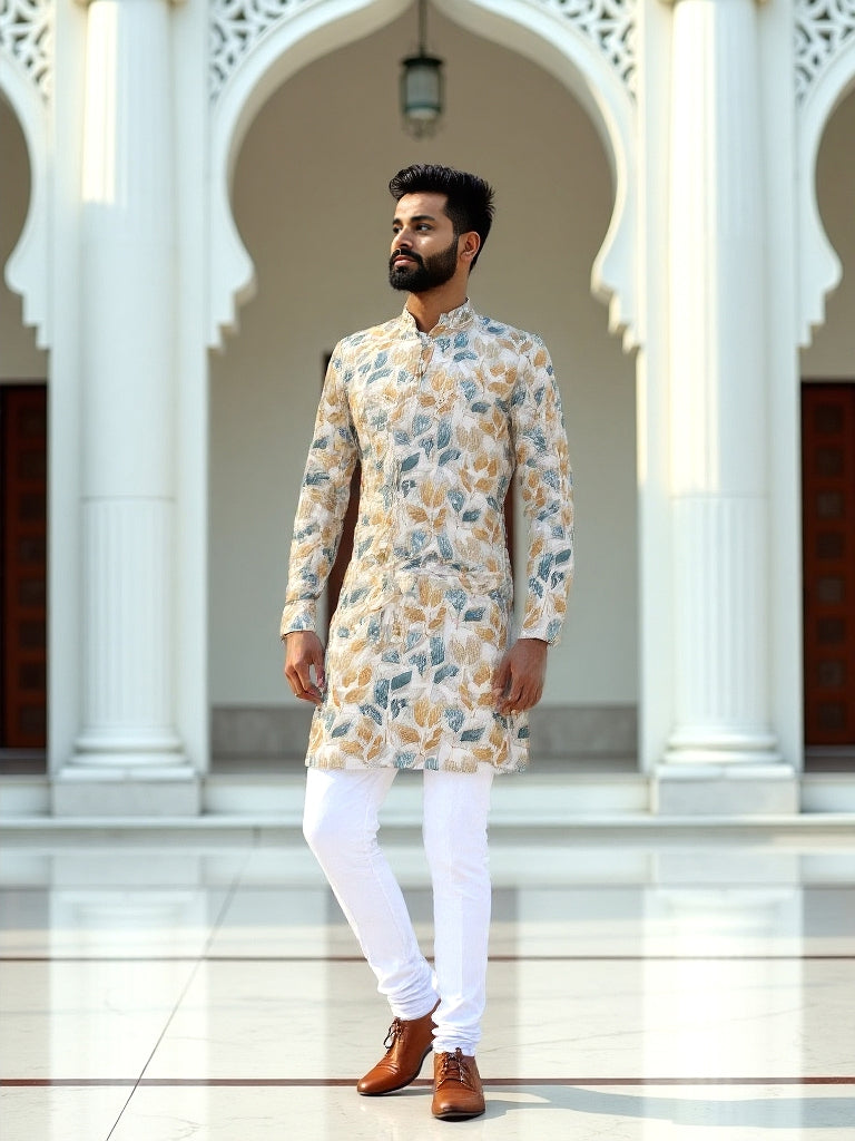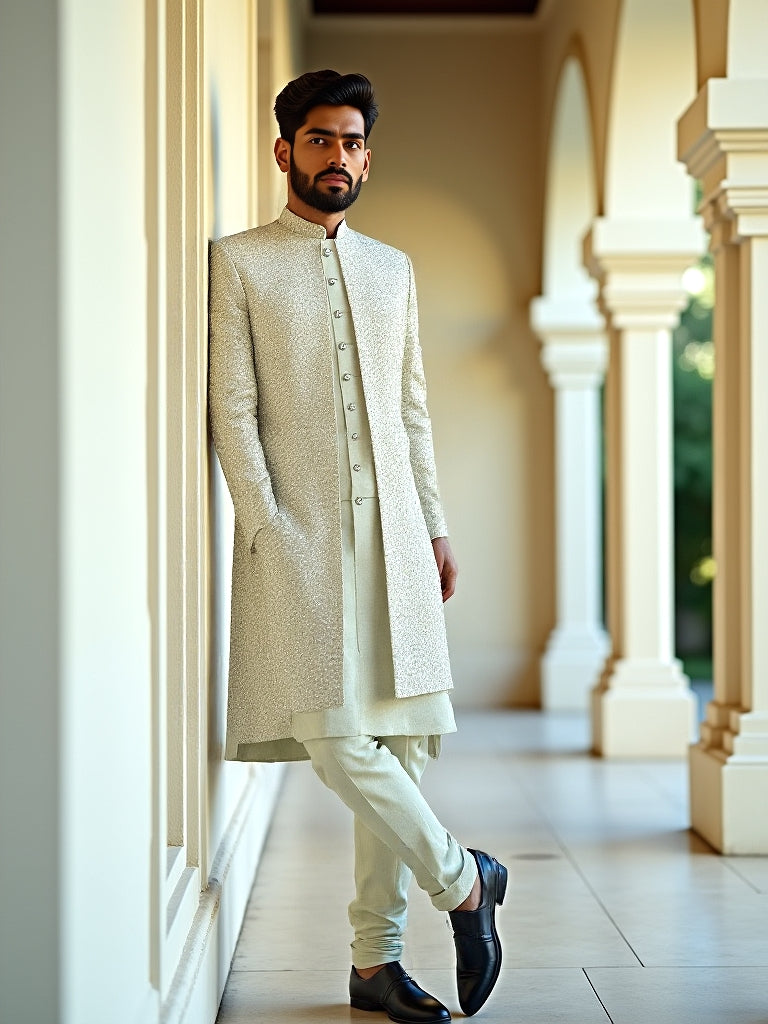 Cream Floral Multi Thread Embroidery with Stones work Milky Silk Sherwani