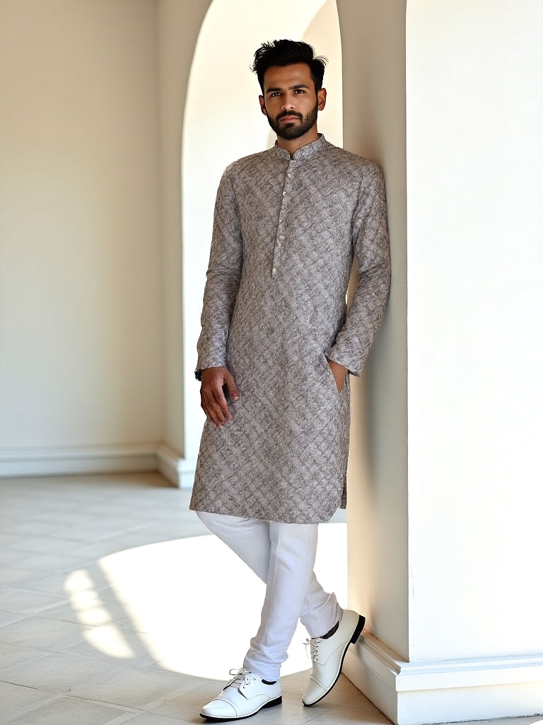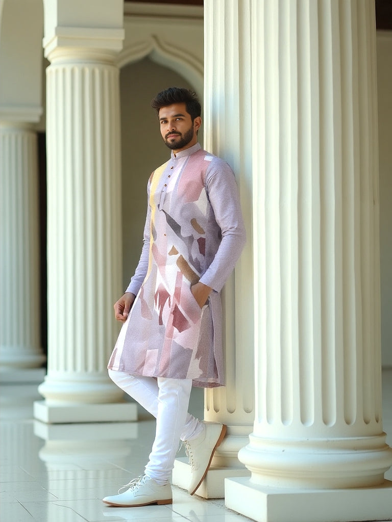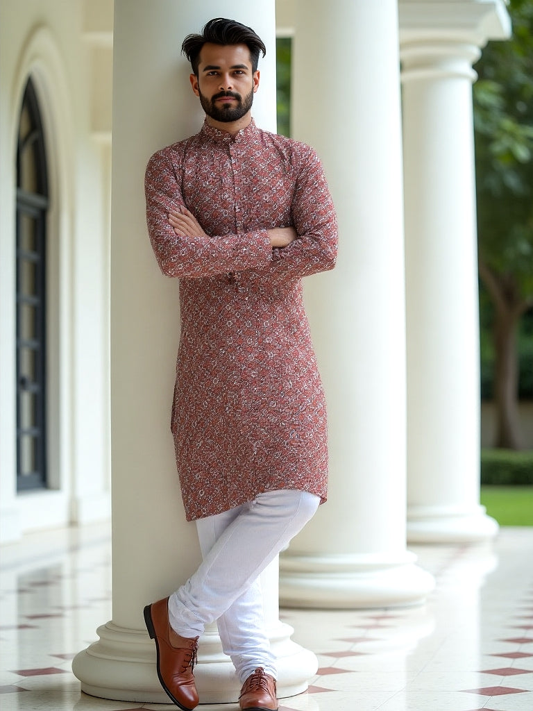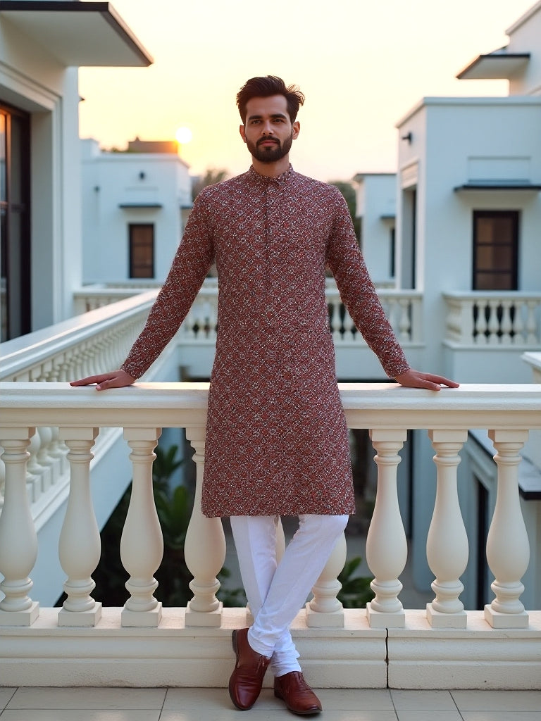 Self Jacquard Design with Embellished Peach Coloured Indo-Western Set