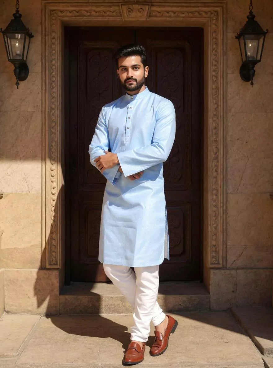 Blue Self Woven Design Cotton Kurta Pyjama Set