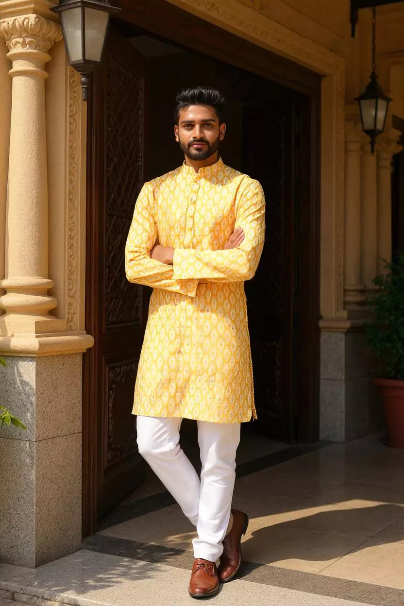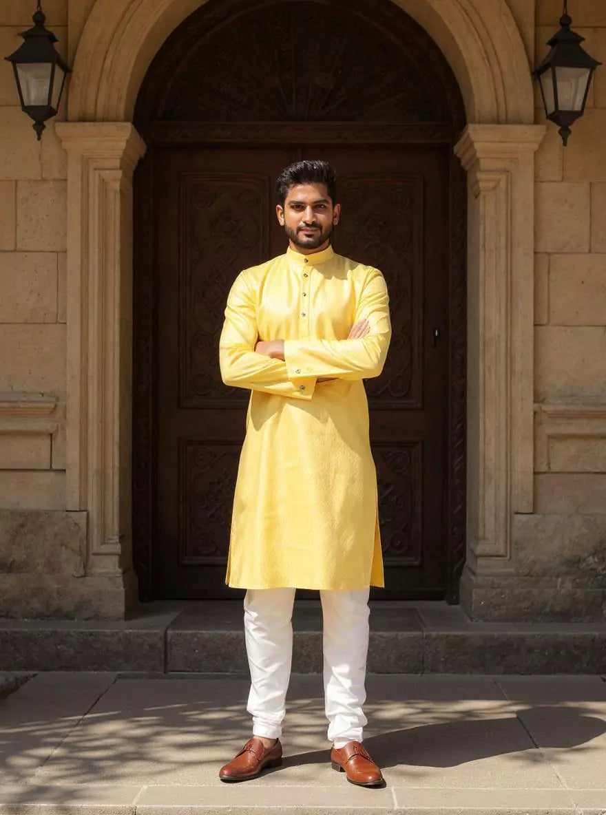Gold Self Patterned Jacquard Kurta Pyjama Set