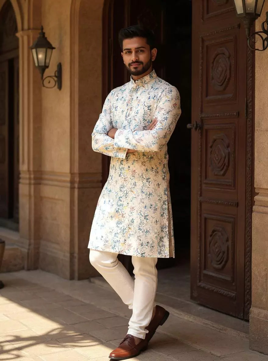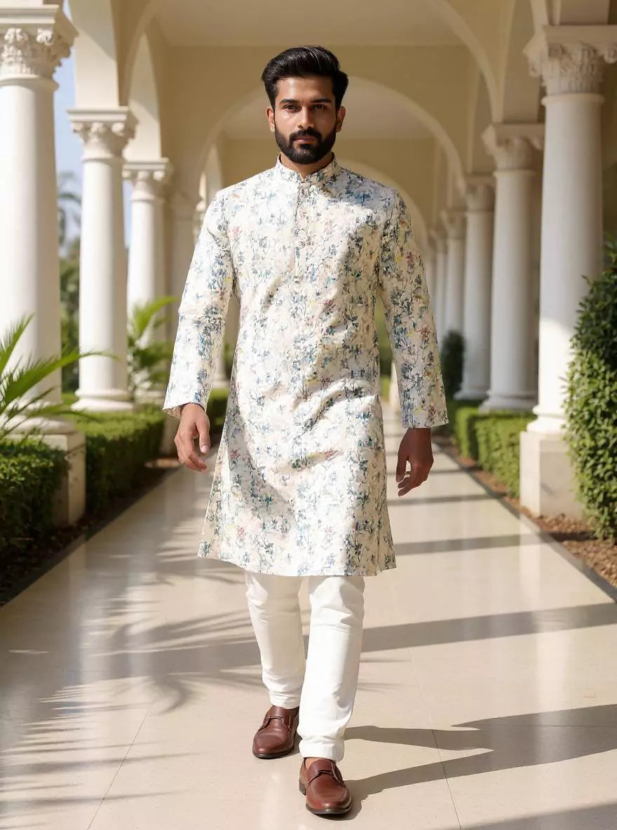 Botanical Print Men's Cotton Kurta Pyjama Set