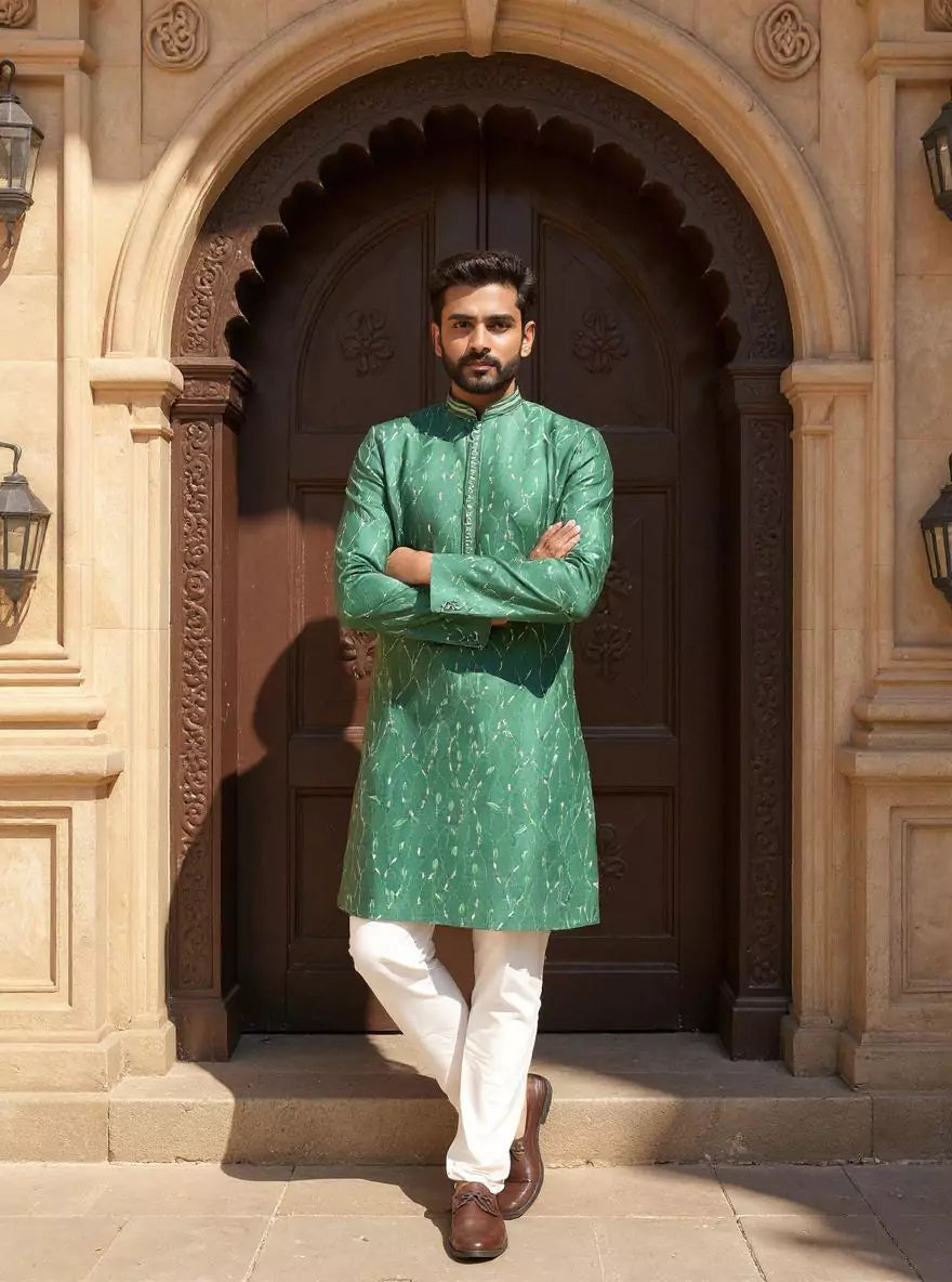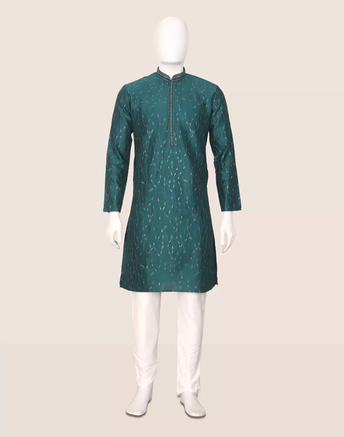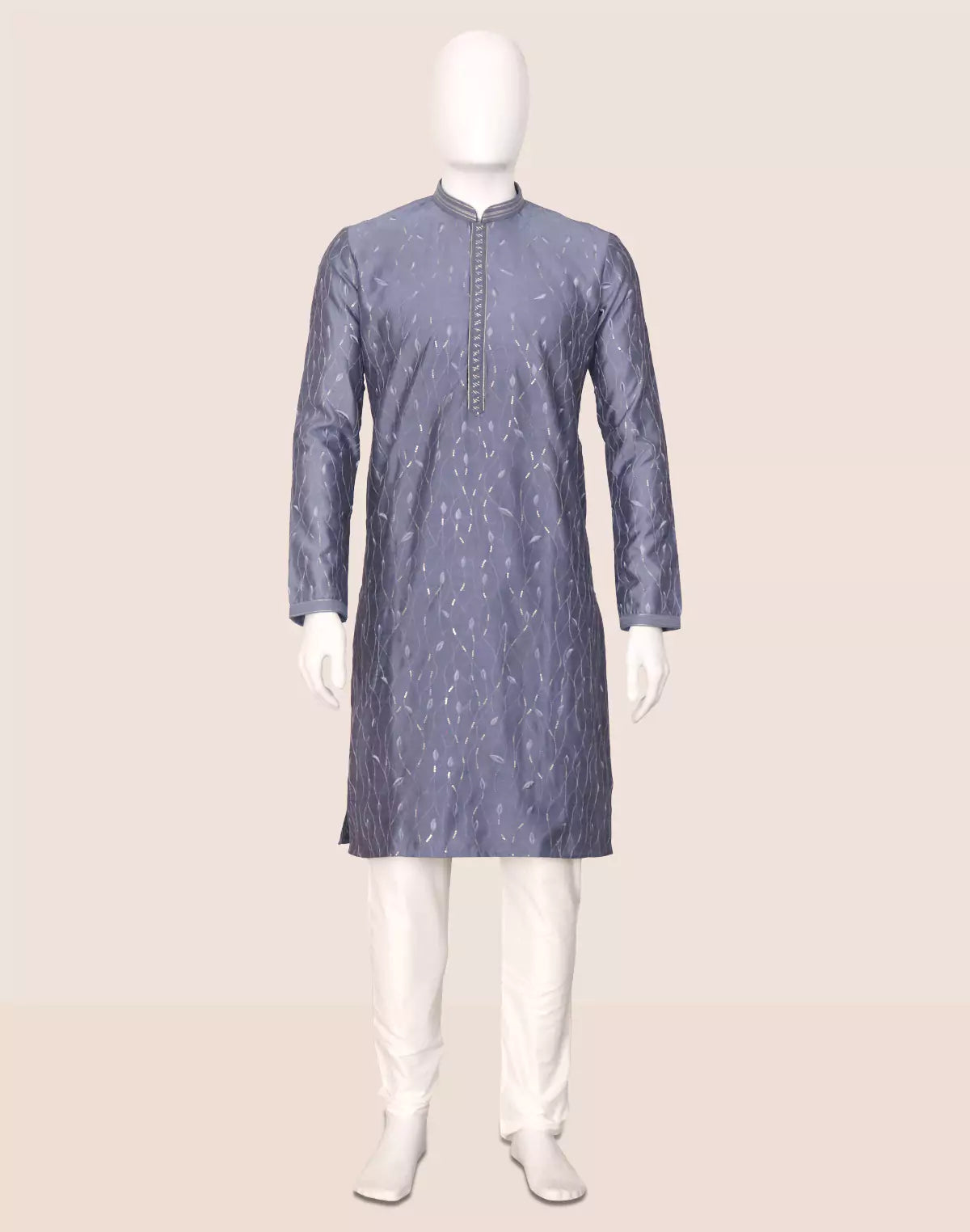 Stylish raw silk kurta with intricate floral embroidery, perfect for casual or party wear. Paired with comfortable off-white pajamas for a complete look.