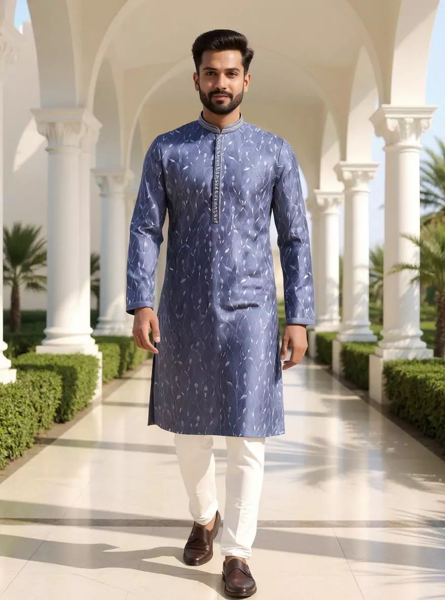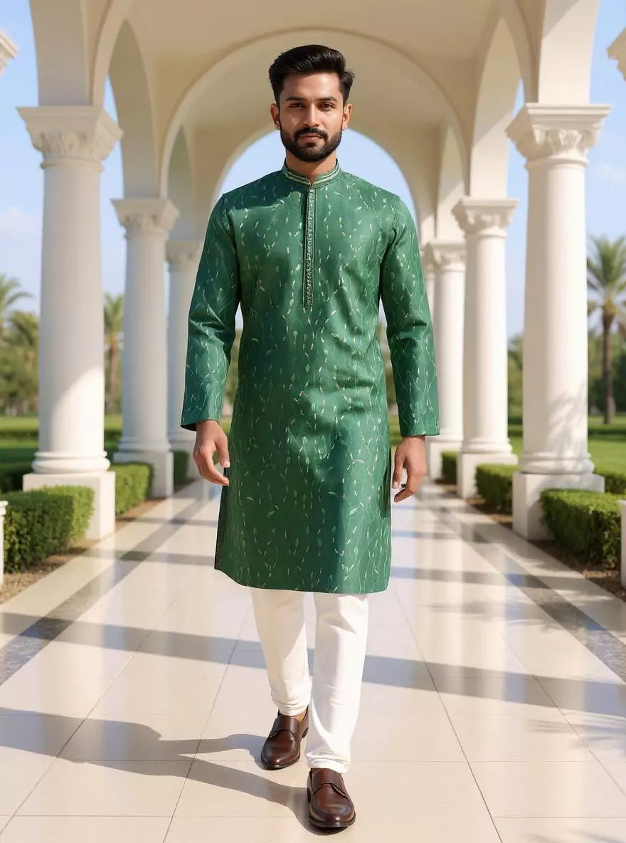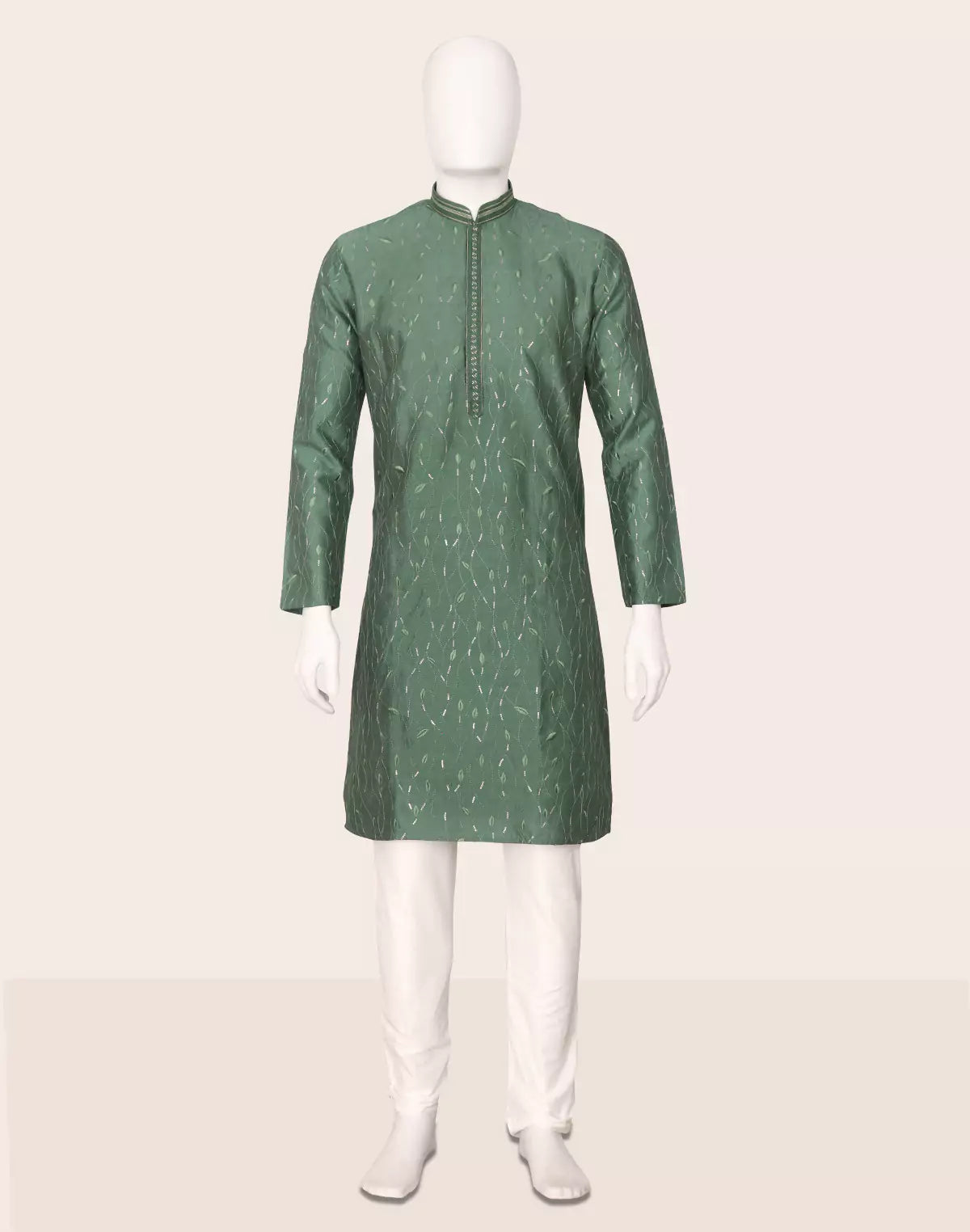 Stylish raw silk kurta with intricate floral embroidery, perfect for casual or party wear. Paired with comfortable off-white pajamas for a complete look.