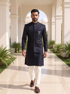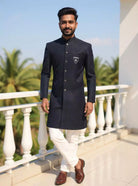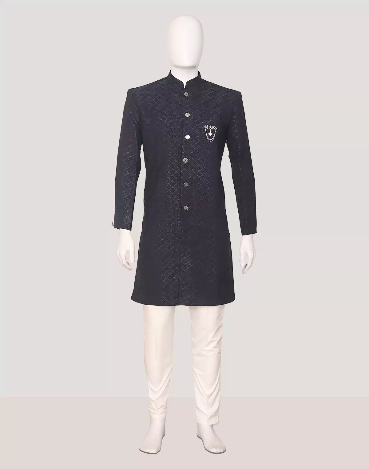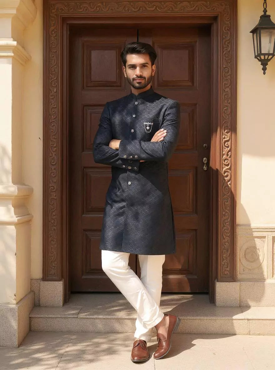 Make a bold impression in this Men's Navy Blue Semi-Indo, crafted with self-patterned weaving on rich Jacquard. A stylish and sophisticated choice for party wear events.