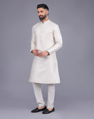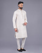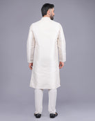 This beautiful and bright kurta's is made of Soft Silk fabric and has intricate thread work all over it. The bottom is made off-white cotton fabric and has a lovely silk border. It's a perfect outfit for a special occasion or a festive event.
