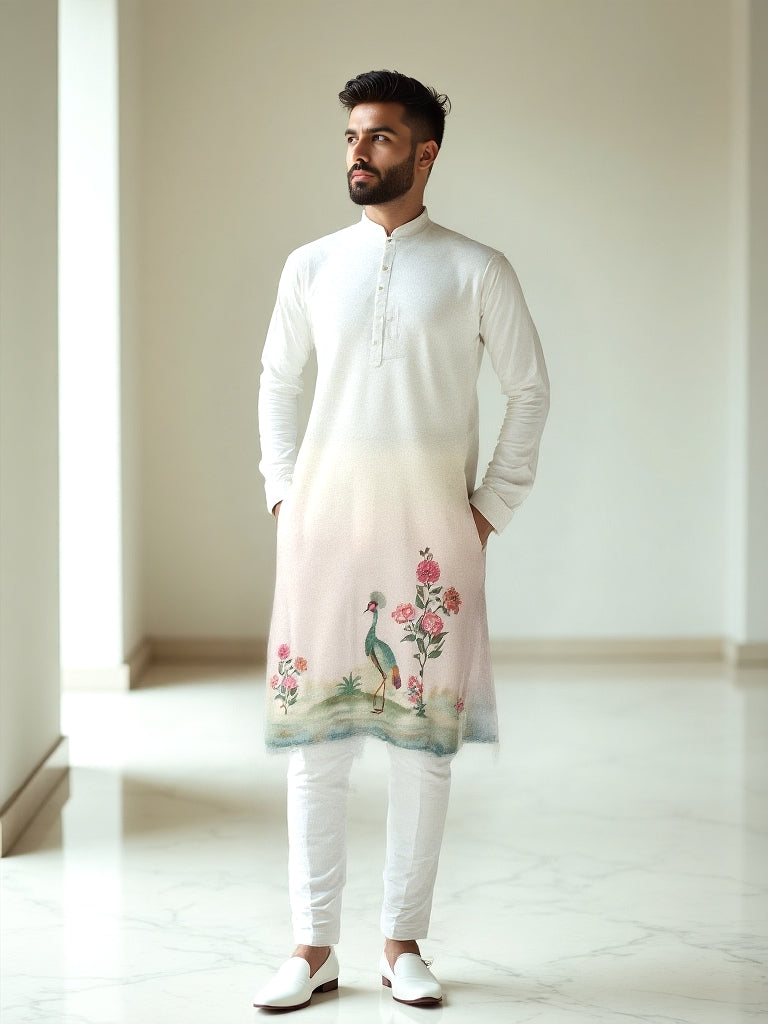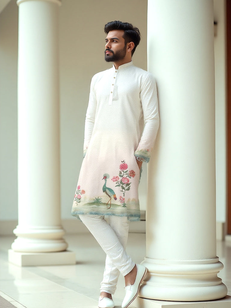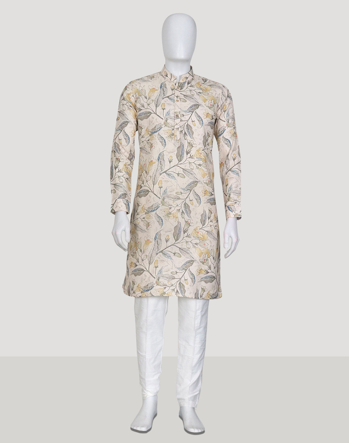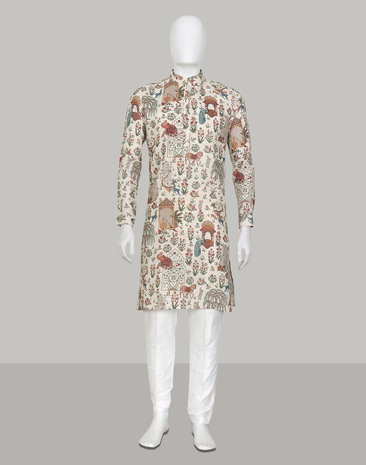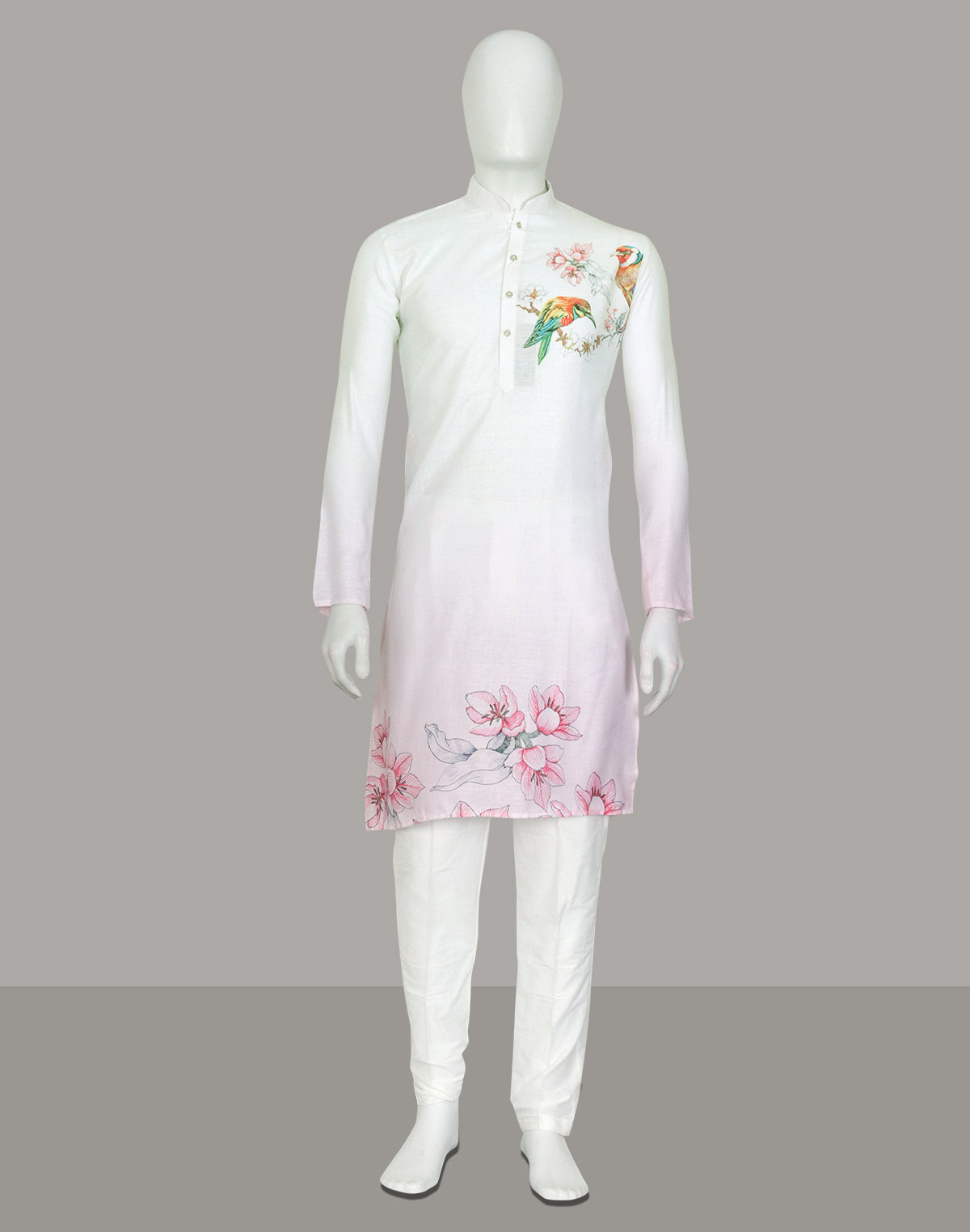 White and Cream Peacock with Floral Printed Cotton Kurta Set