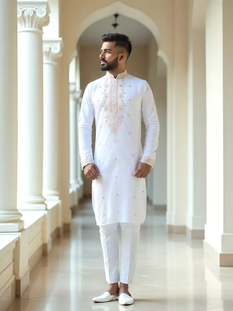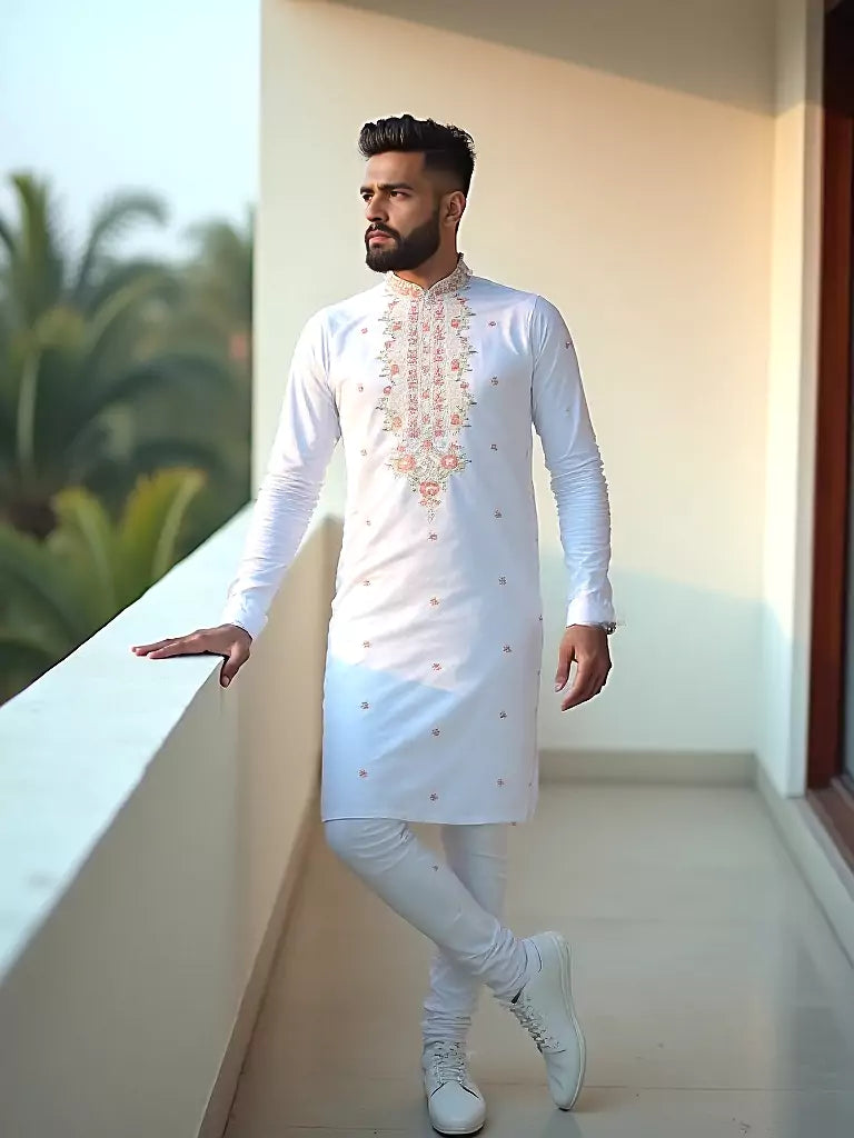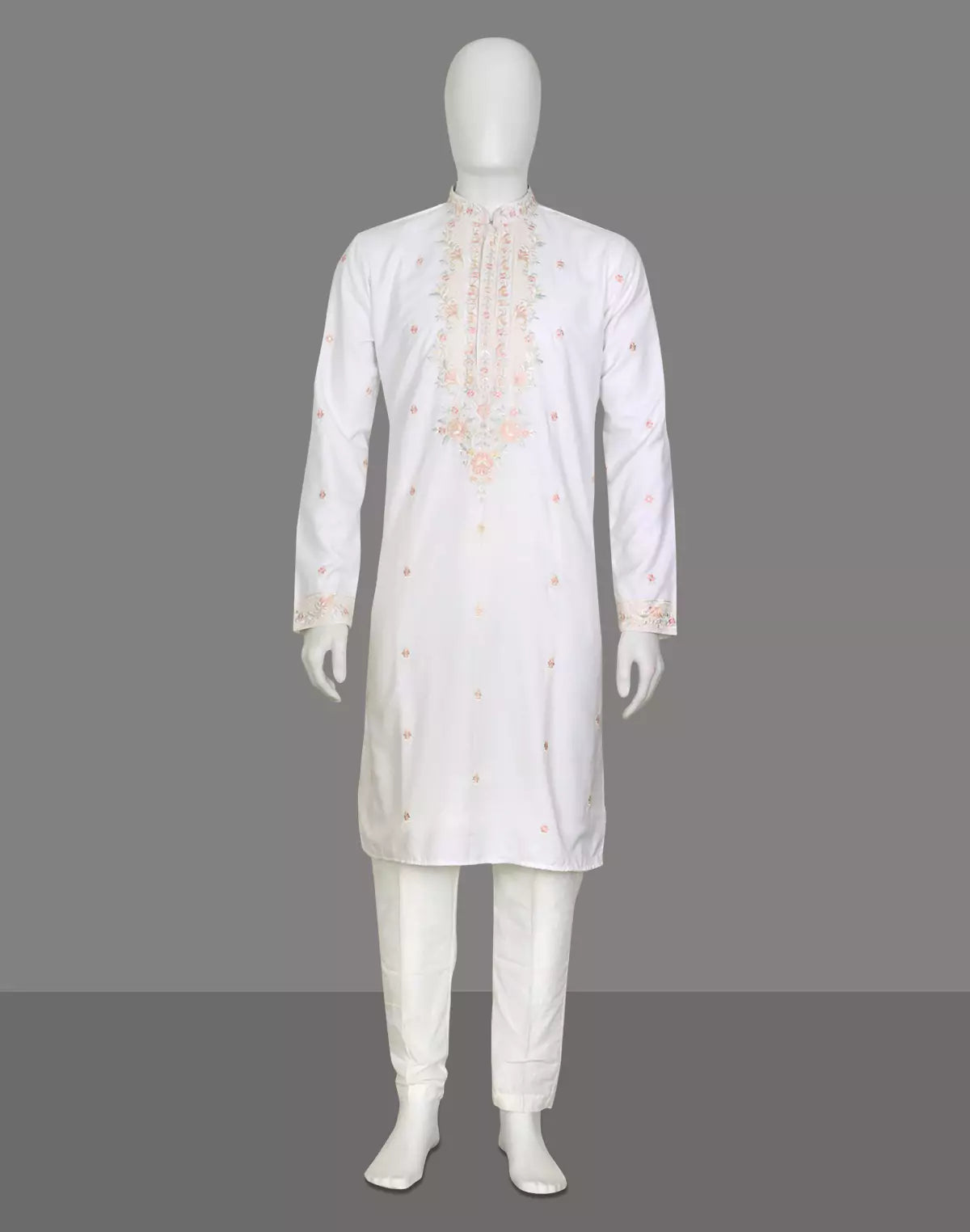 Floral Embroidered Giza Cotton White Kurta with Pyjamas
