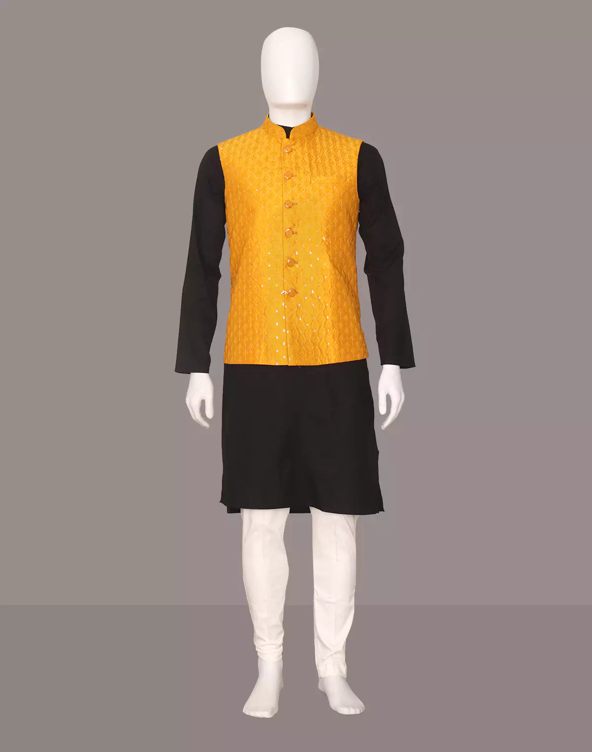 Yellow Floral Thread work Cotton Silk Waist Coat