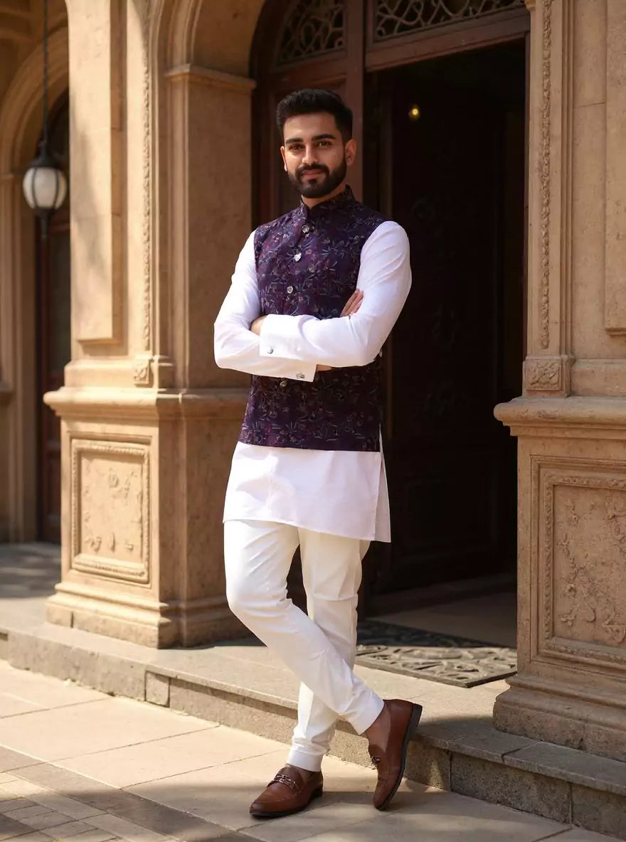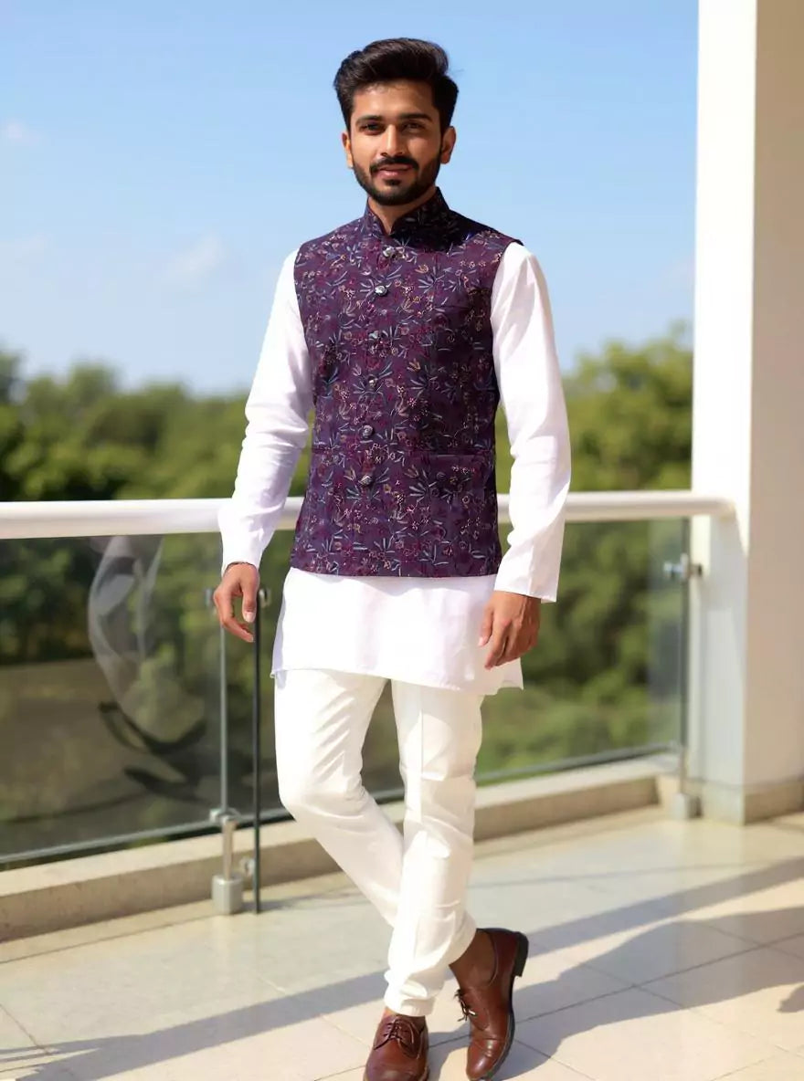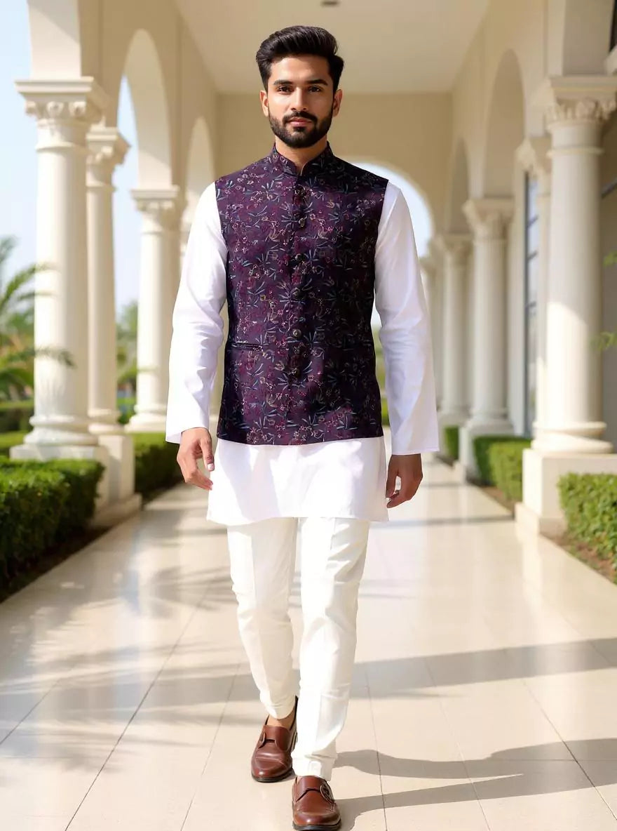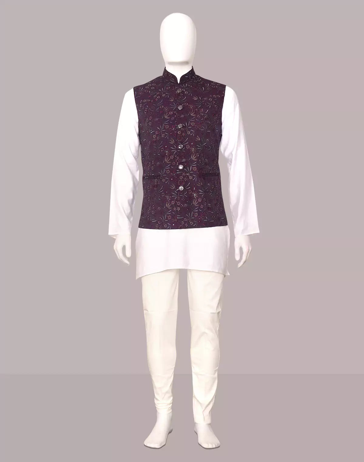 Stand out in this Purple Cotton Silk Waistcoat, adorned with intricate Bel Buti patterns and vibrant multi-color embroidery. A festive favorite with timeless elegance.