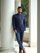 Polynosic Solid Navy Blue Cutdana work Bandhgala Suit