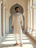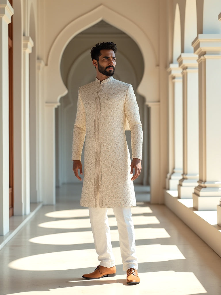 In our Cream Floral Multi Thread Embroidery Sherwani. This elegant piece is made from smooth Milky Silk and decorated with exquisite stone work for a touch of glamour. Perfect for weddings, parties, or any festive event.