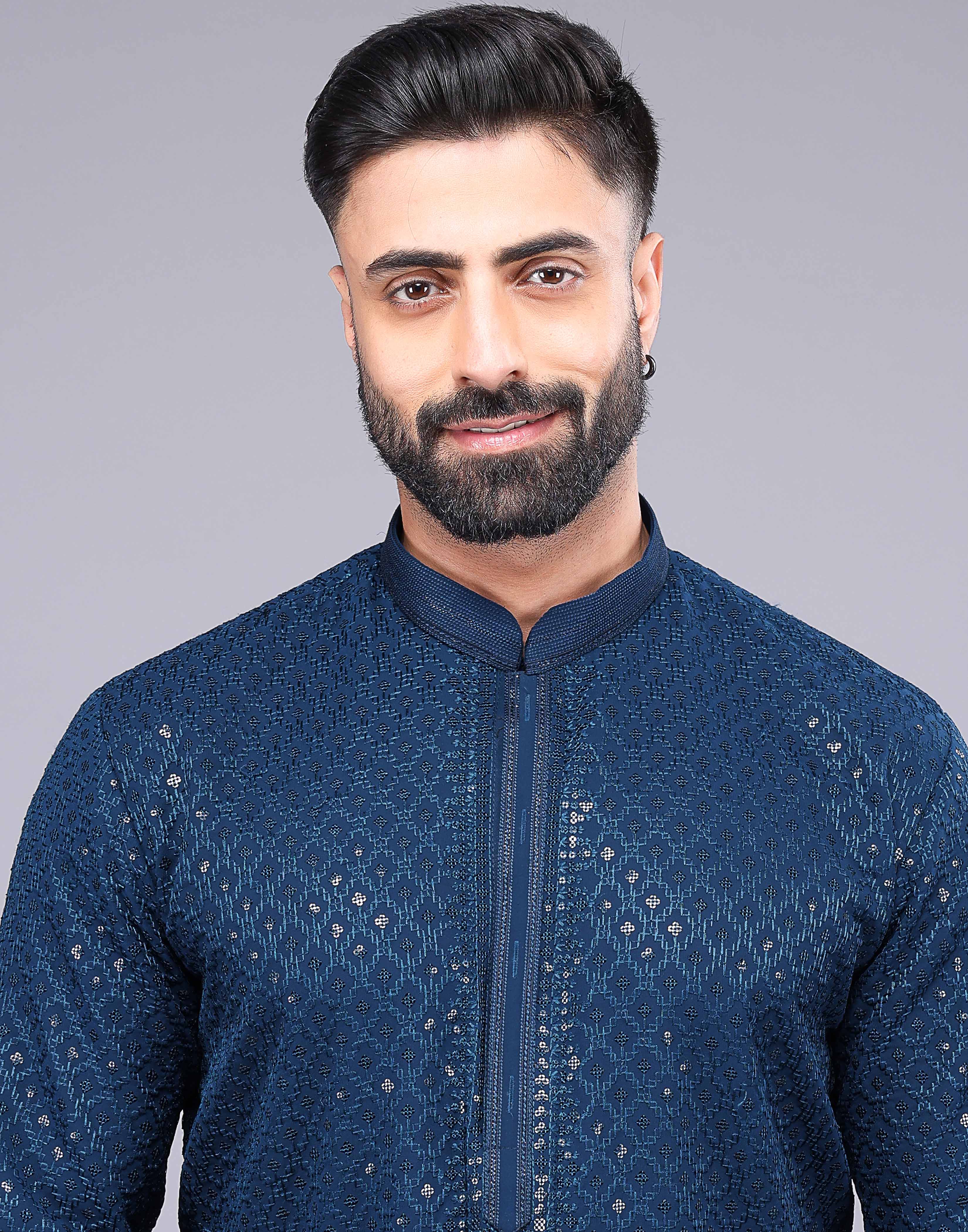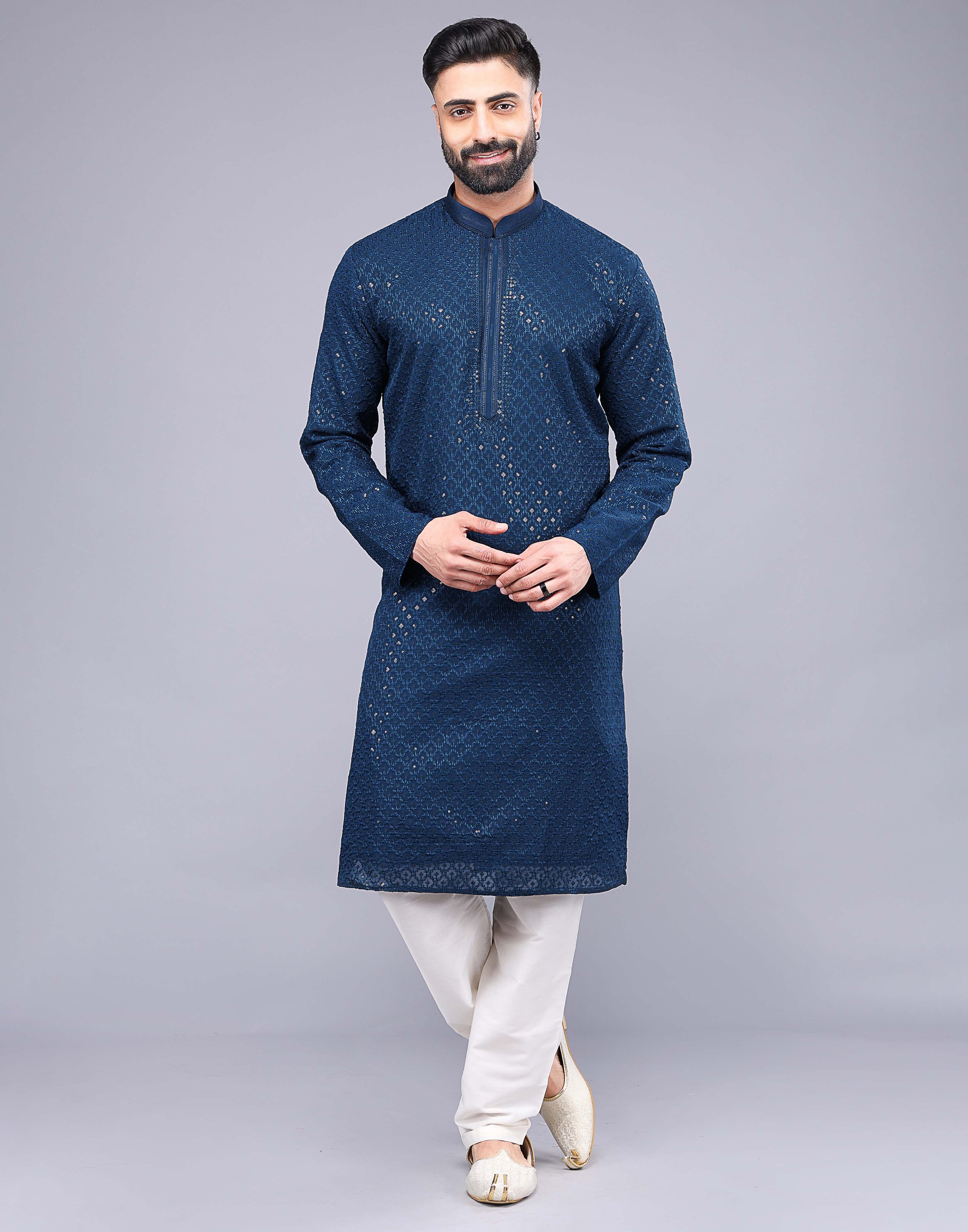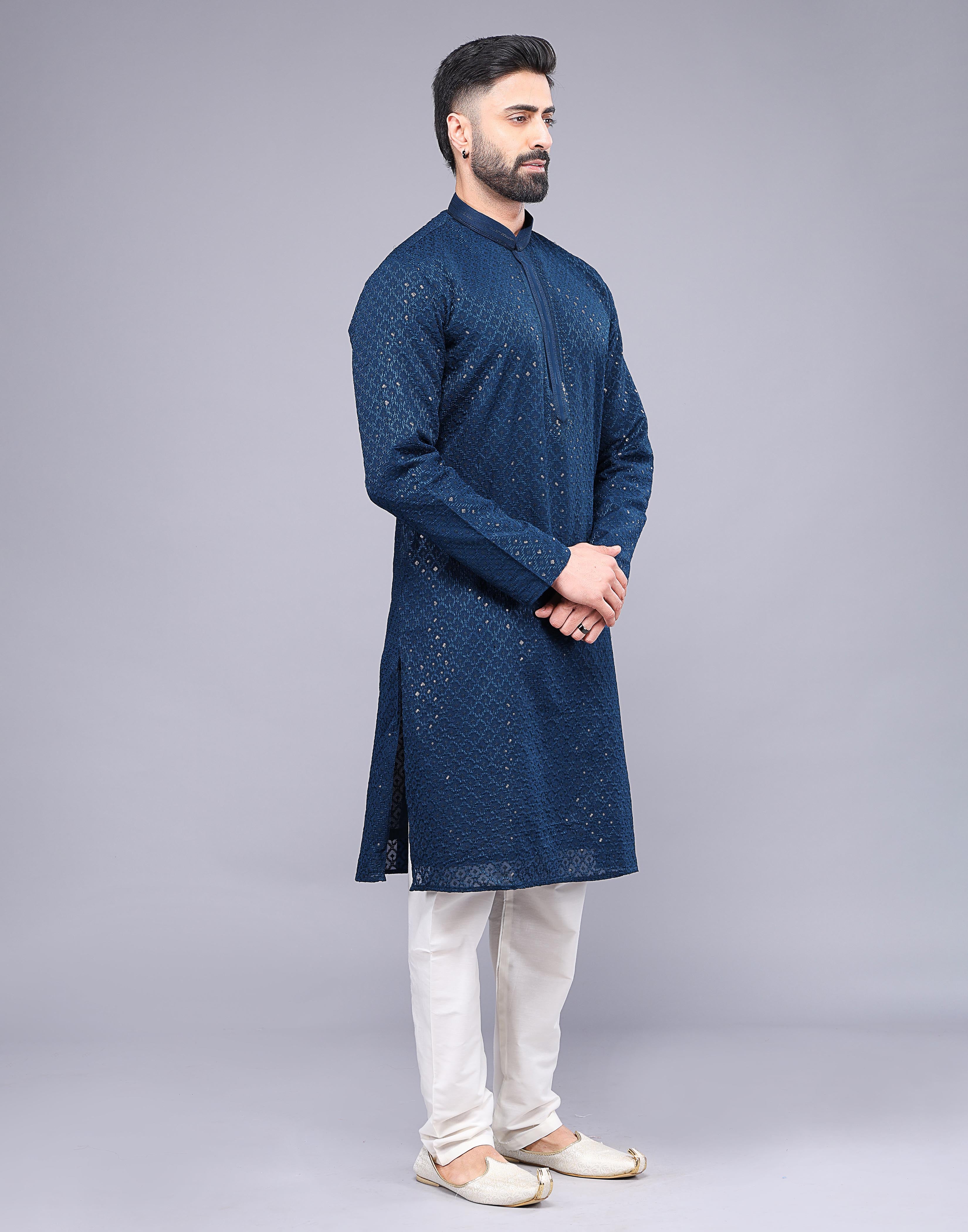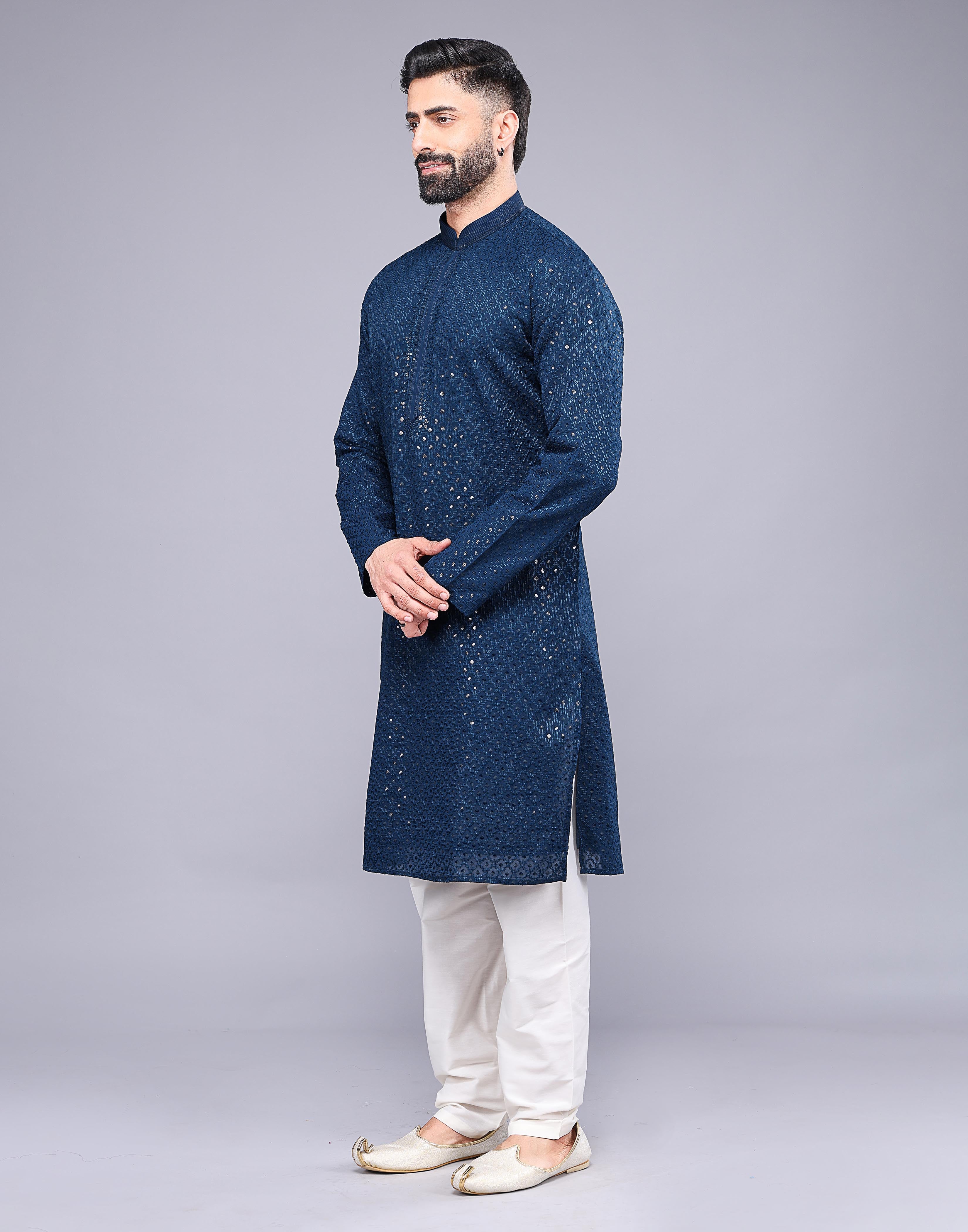 The kurta pyjama is skillfully adorned with beautiful embroidery and Thread Work, making it a luxurious and exciting outfit to wear.