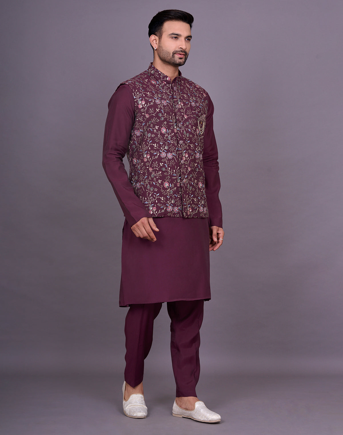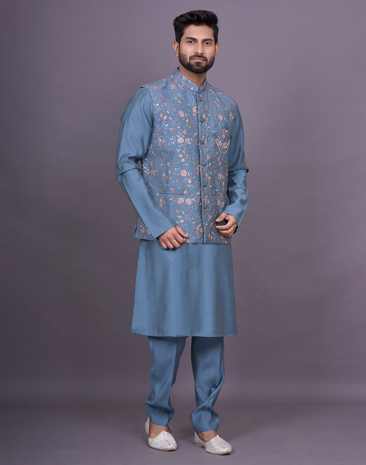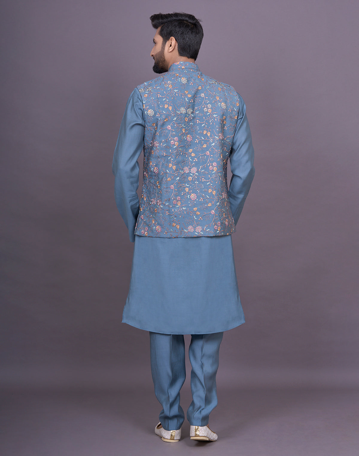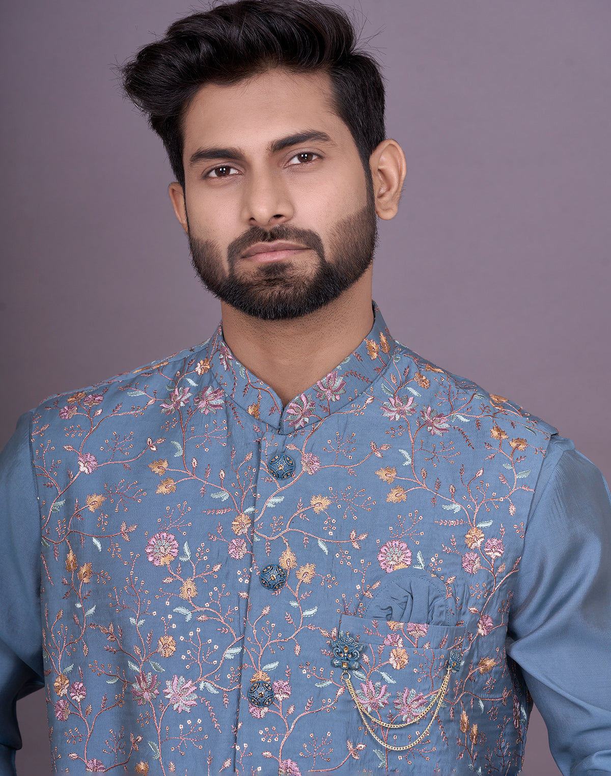 Look attractive All Over Floral Multi-Thread Embroidery work Soft Silk Kurta Jacket Set features intricate floral patterns, embroidered across the fabric with vibrant colors. The set includes a finely crafted jacquard kurta with delicate embellished details, enhancing the luxurious look. Paired with a matching jacket, this ensemble creates a perfect blend of traditional elegance and contemporary style.