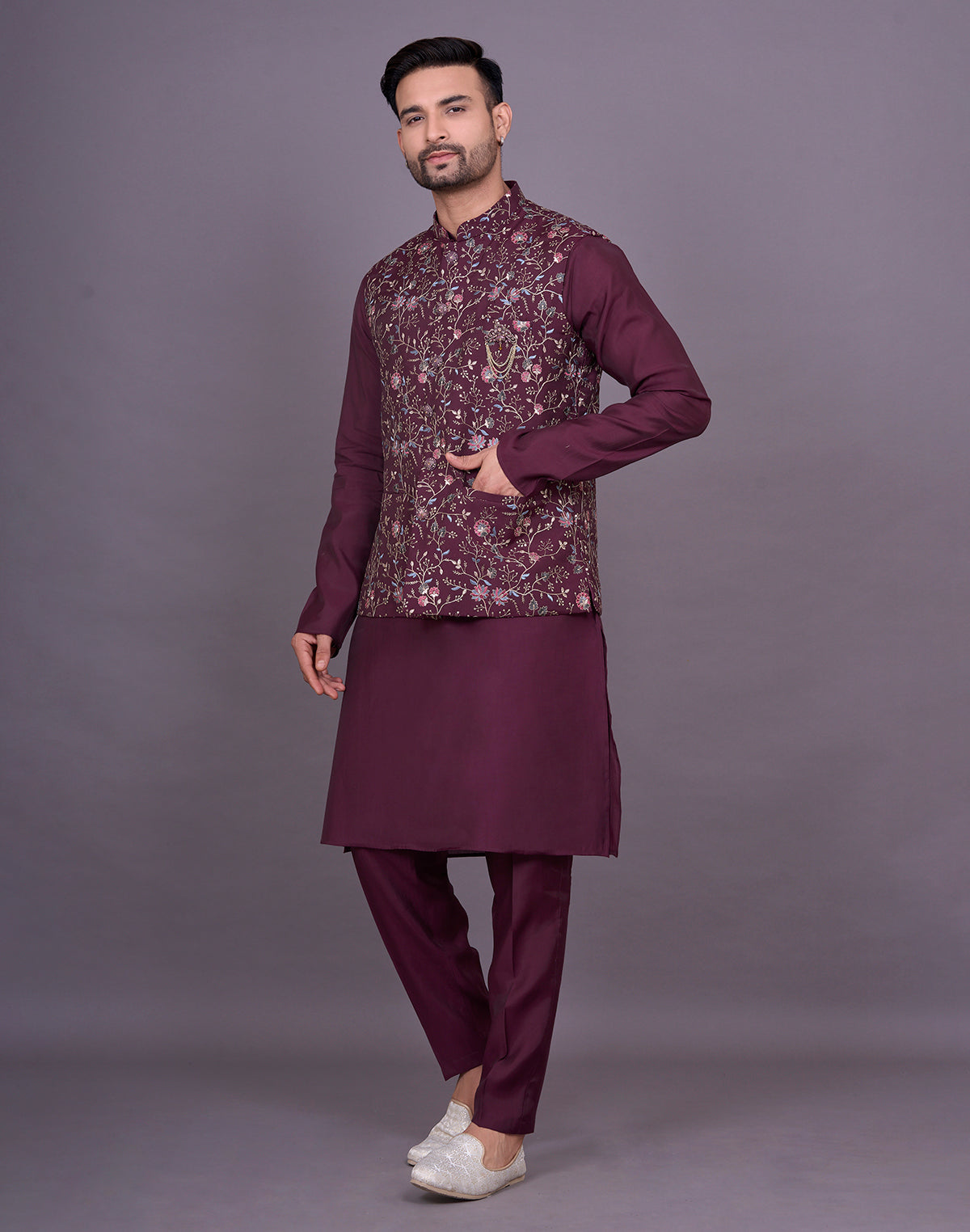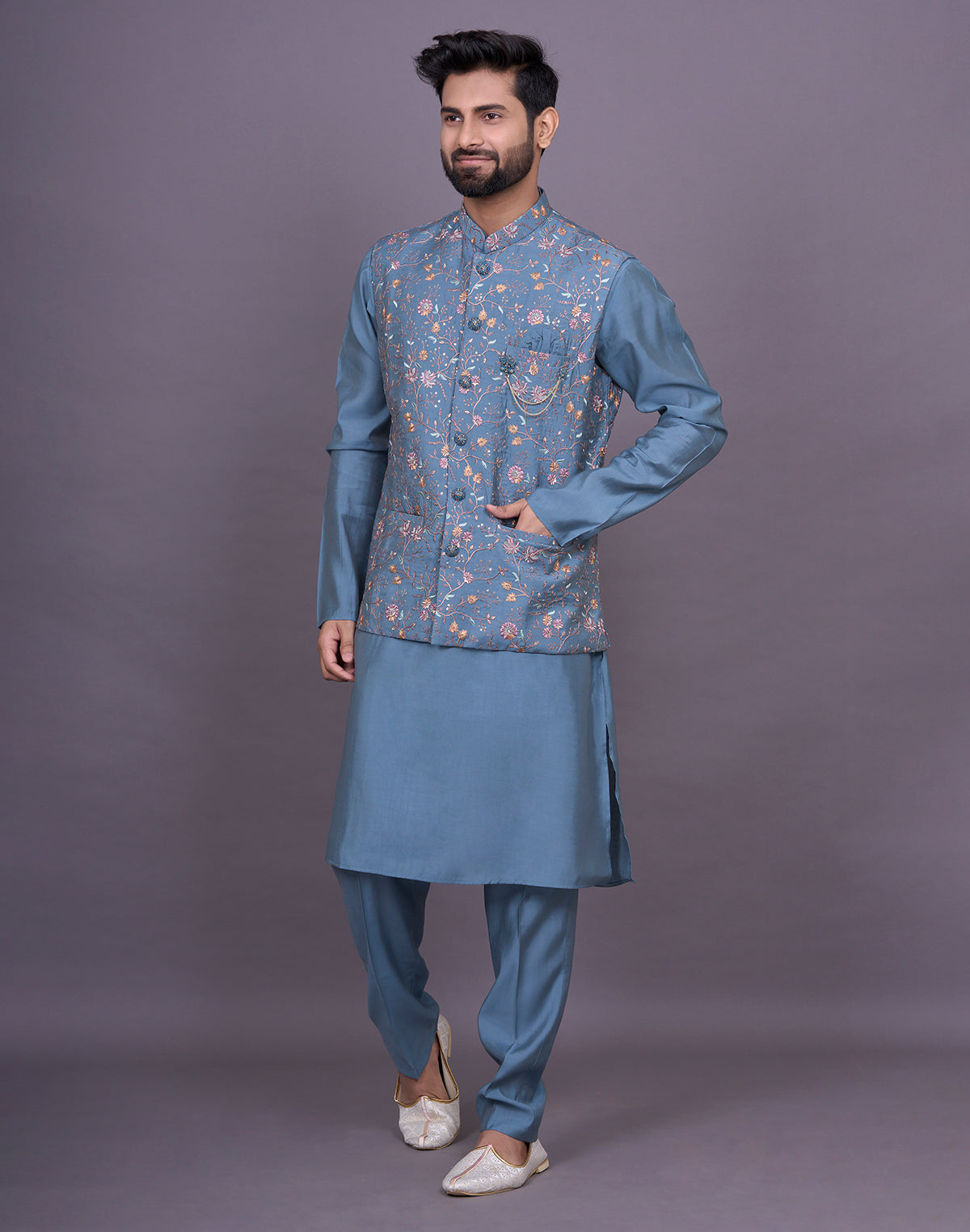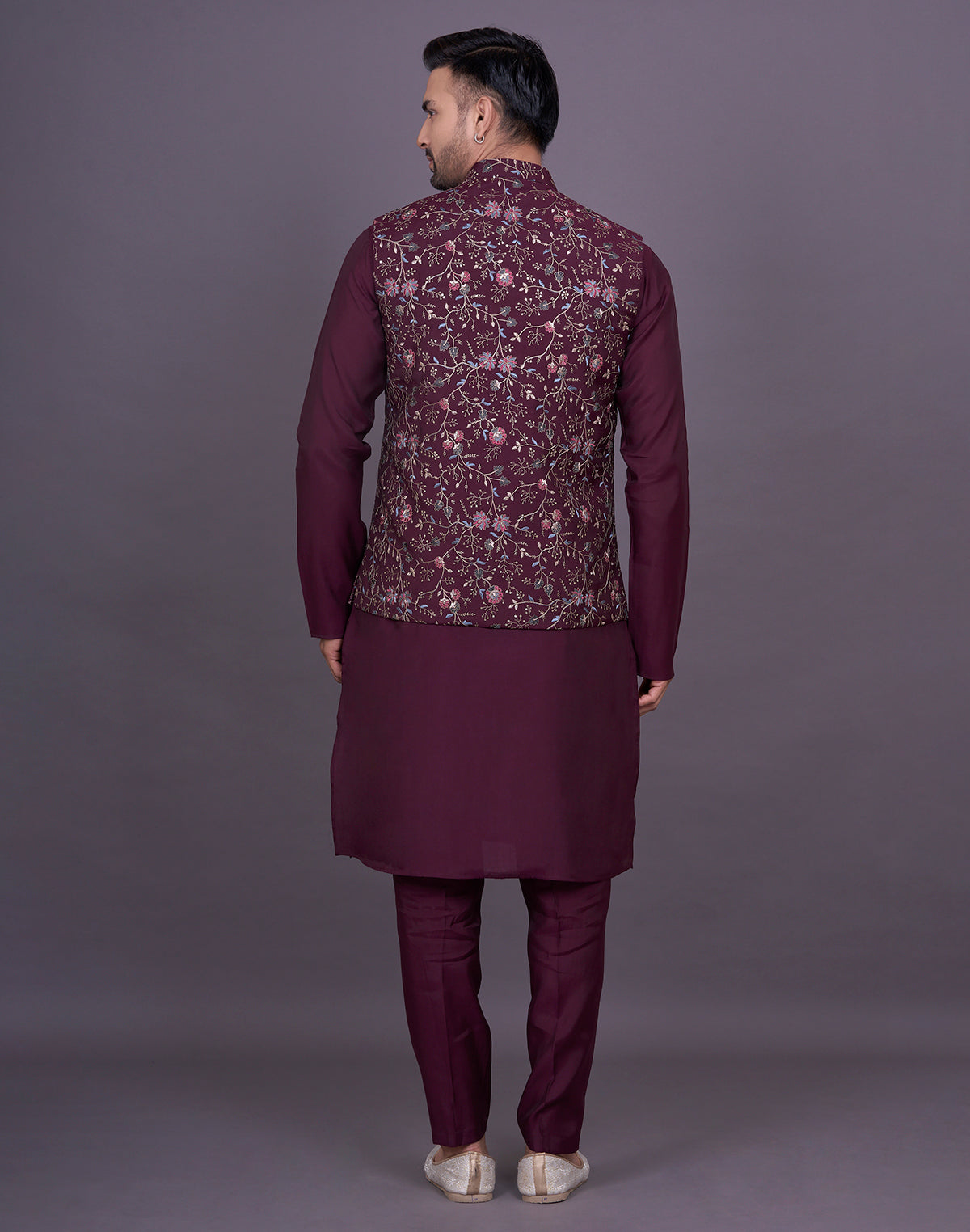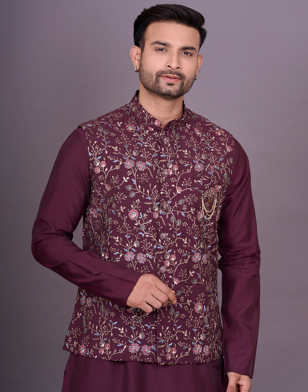 Look attractive All Over Floral Multi-Thread Embroidery work Soft Silk Kurta Jacket Set features intricate floral patterns, embroidered across the fabric with vibrant colors. The set includes a finely crafted jacquard kurta with delicate embellished details, enhancing the luxurious look. Paired with a matching jacket, this ensemble creates a perfect blend of traditional elegance and contemporary style.