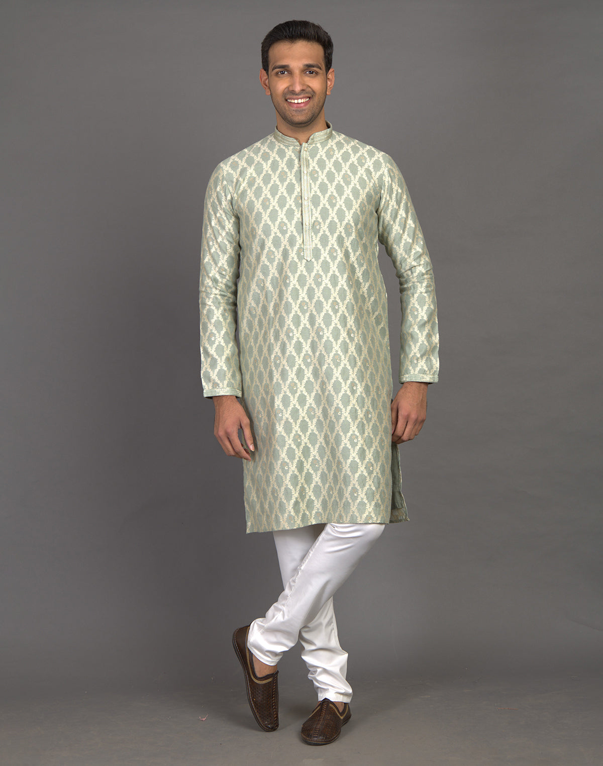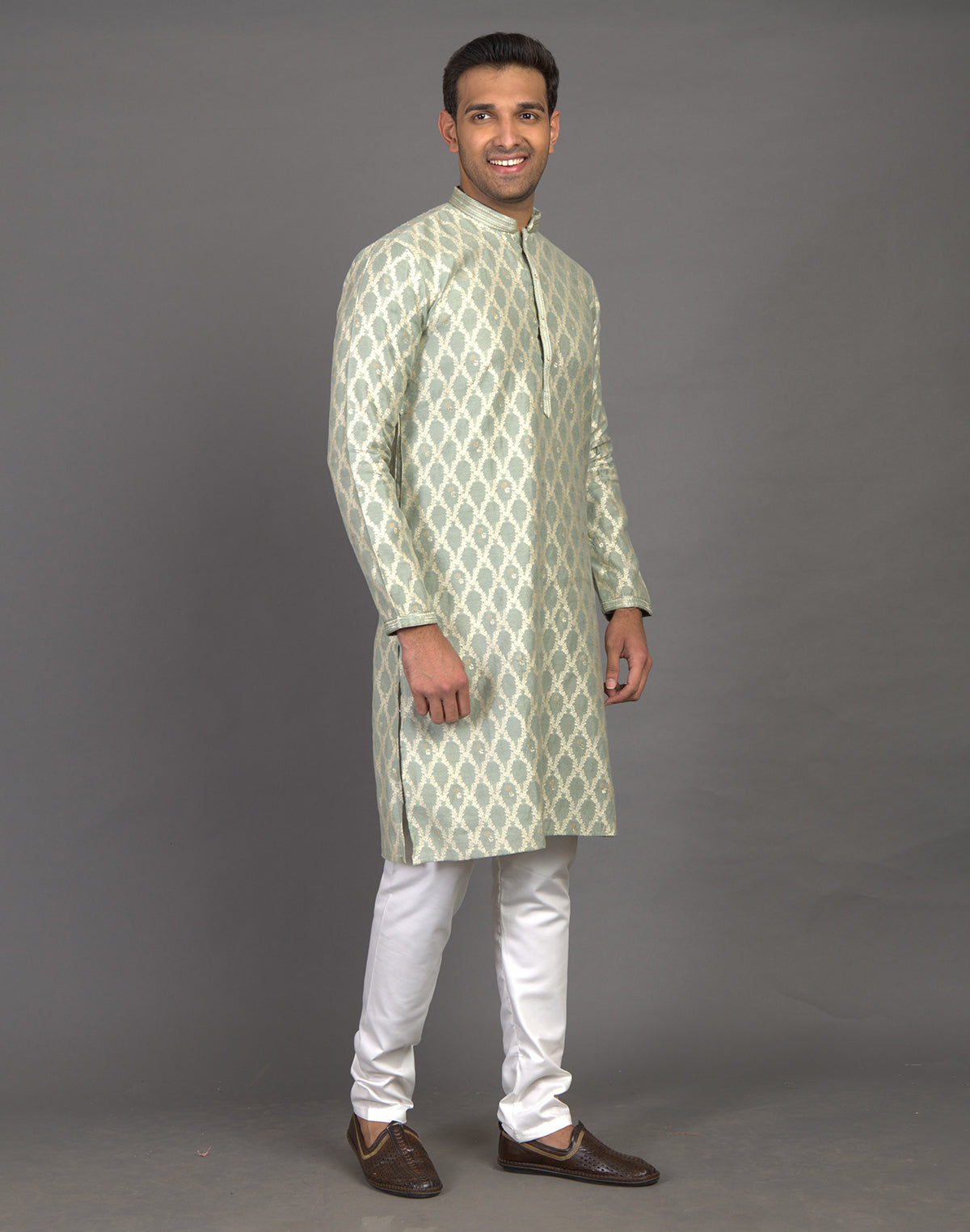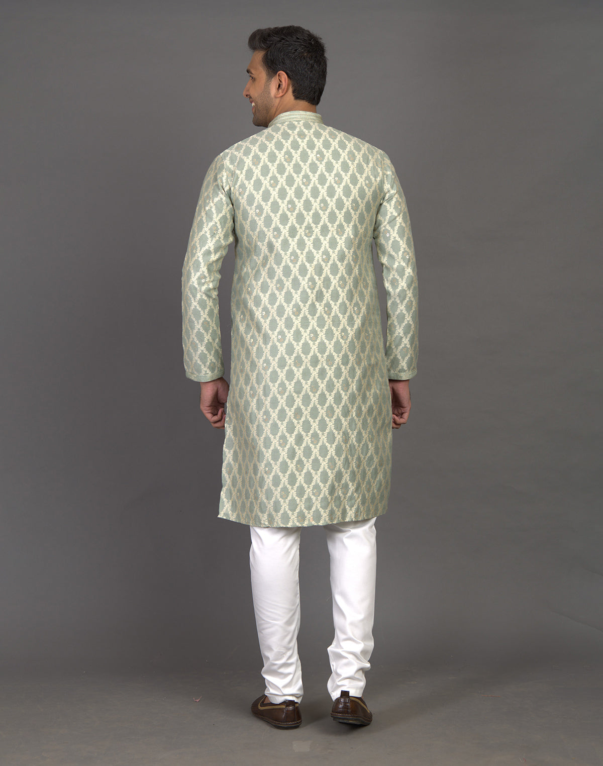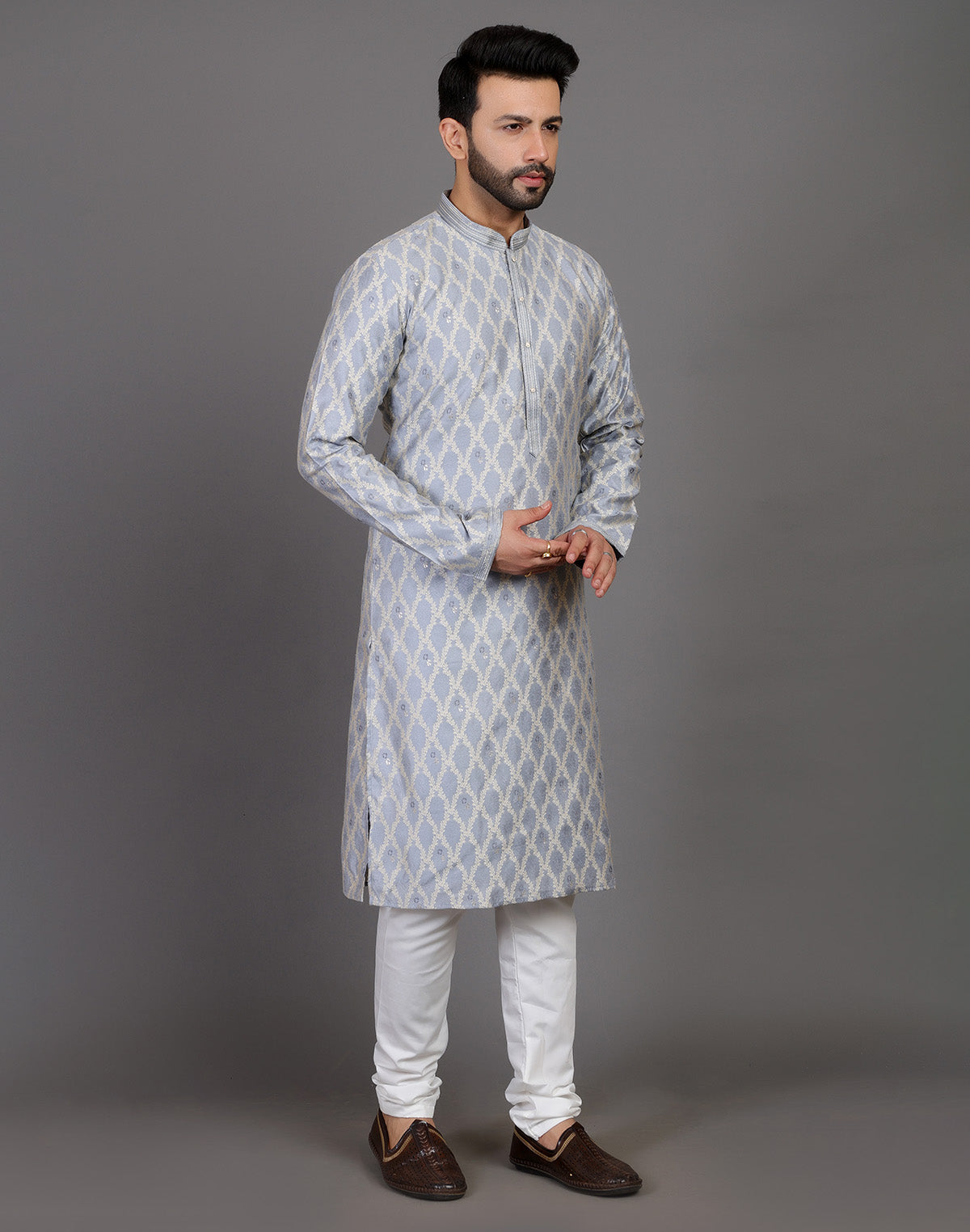 why settle for an ordinary kurta when you can elevate your look with floral weaving soft silk kurta pyjama? This intricate technique adds depth and texture to the fabric, creating a luxurious and eye-catching effect that will surely turn heads.