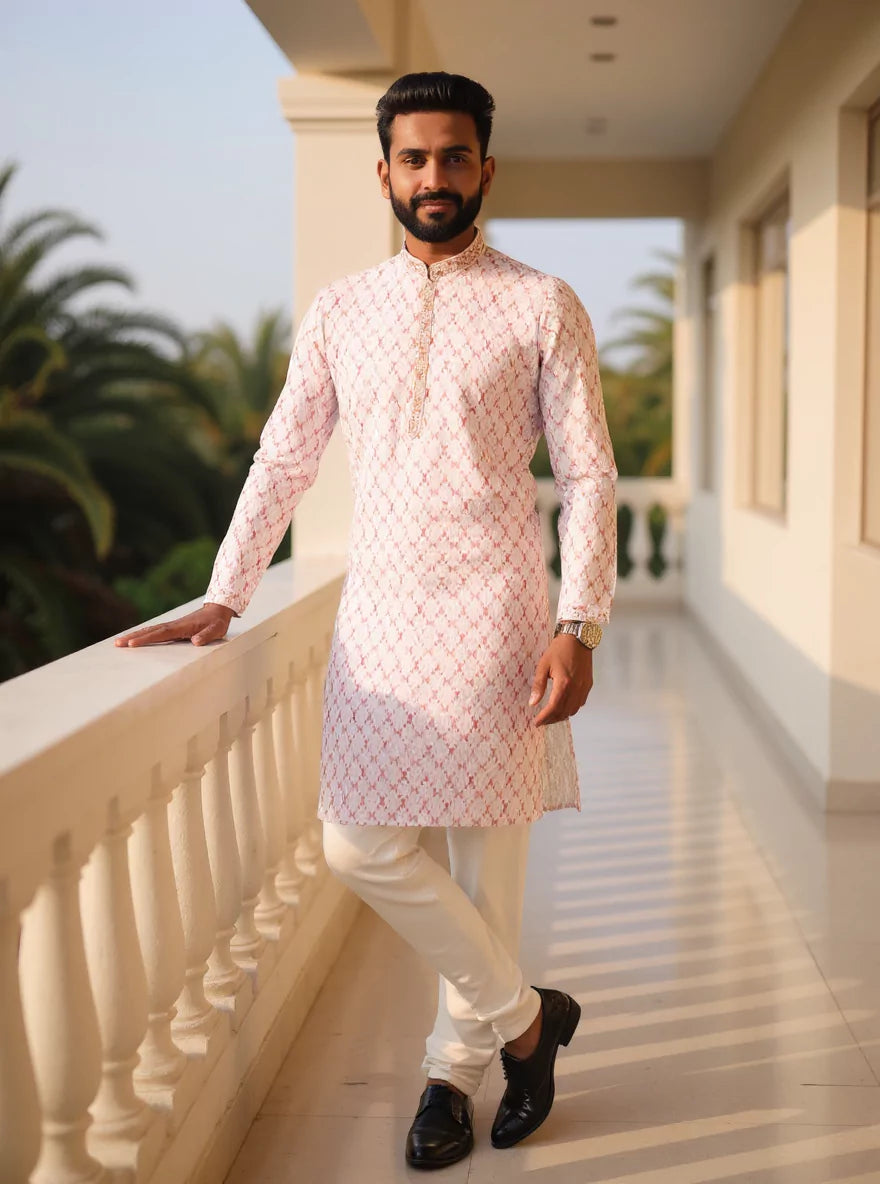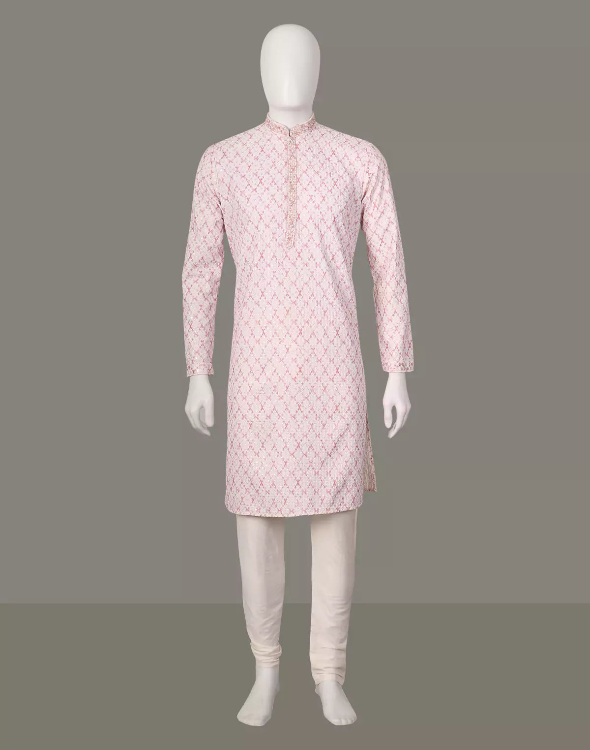 Graceful and charming, this pink milky silk kurta features exquisite all-over geometric thread work for a modern yet traditional appeal. It's perfectly paired with comfortable cream plain cotton pajamas. This ensemble offers a soft, elegant look, ideal for various occasions.