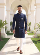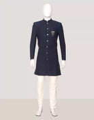 Make a royal impression in this Deep Navy Blue Jacquard Semi-Indo, adorned with imperial weaving patterns—perfect for weddings, parties, and festive elegance.