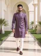 Make a stylish statement in this Designer Purple Semi-Indo, featuring self-patterned weaving on rich Jacquard. A perfect blend of elegance and flair for party wear.
