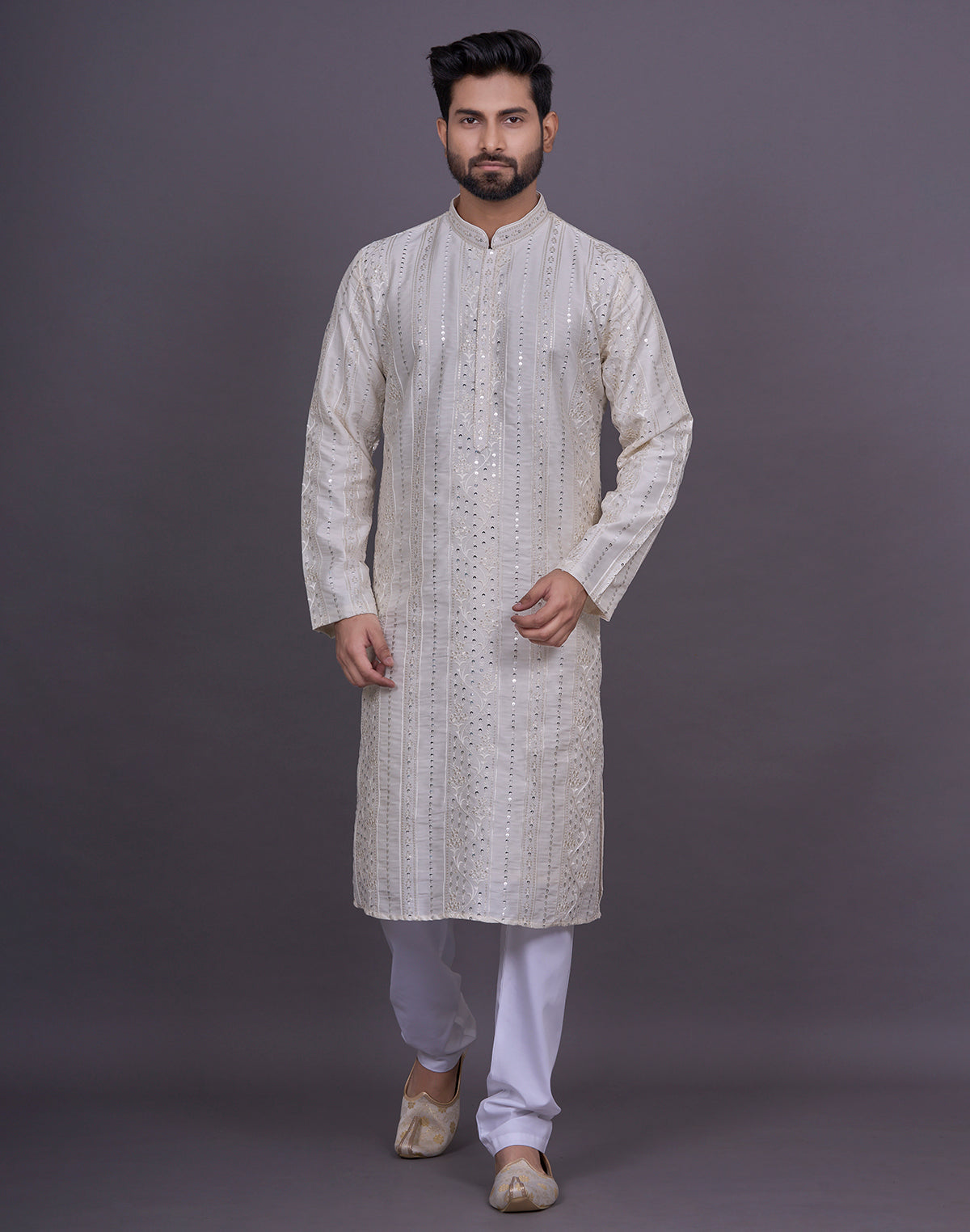 Self Floral Sequence with Thread work Cream Raw Silk Kurta Pyjama Set